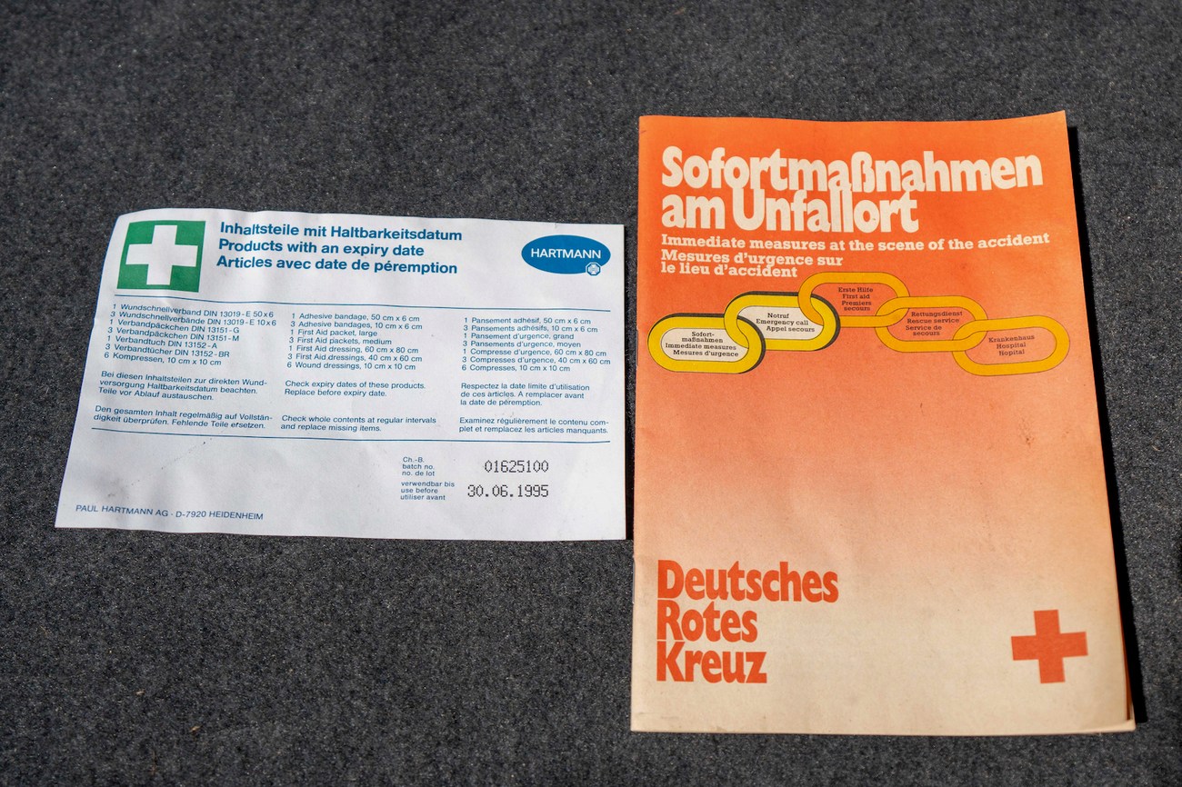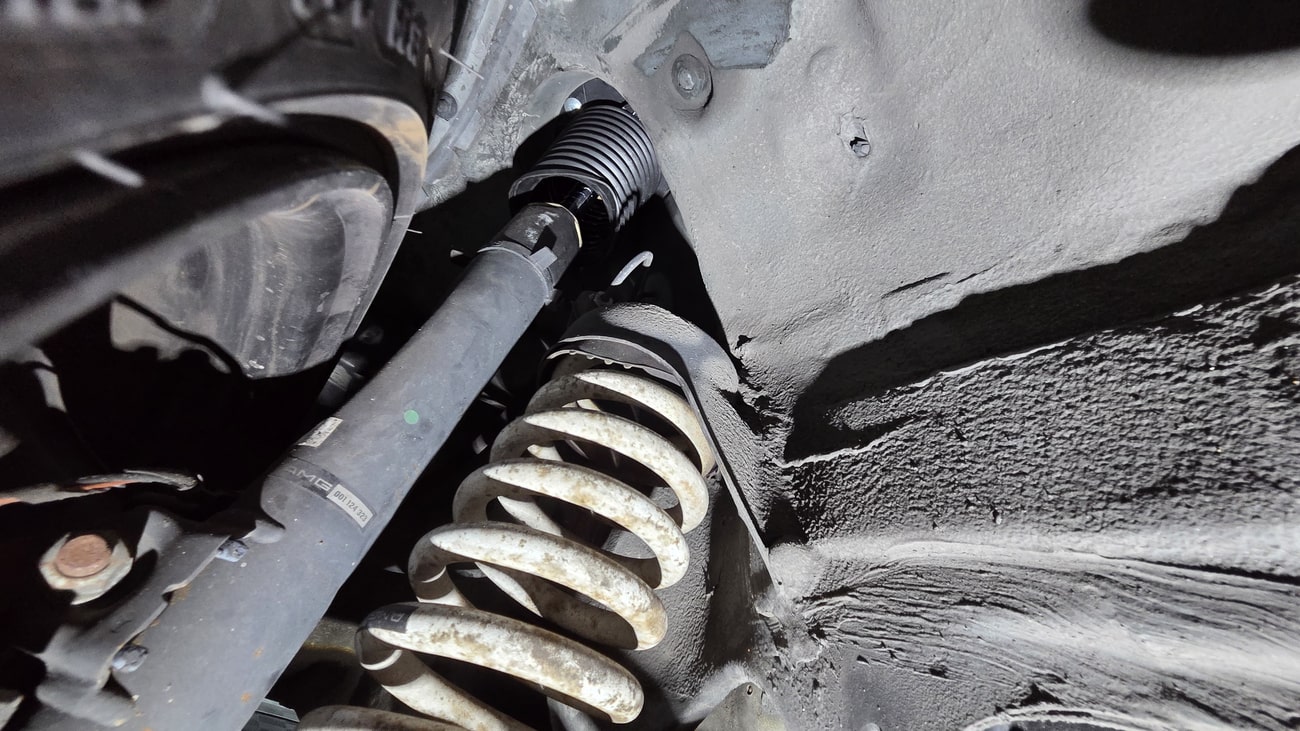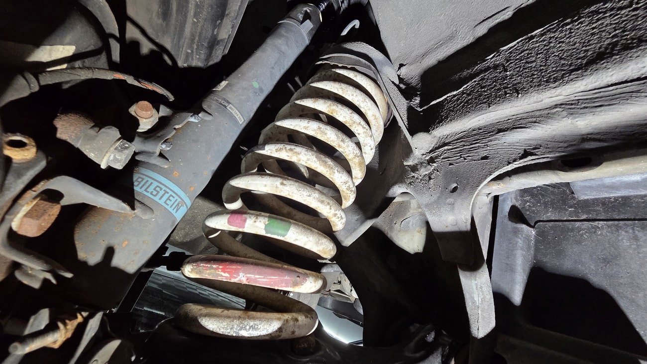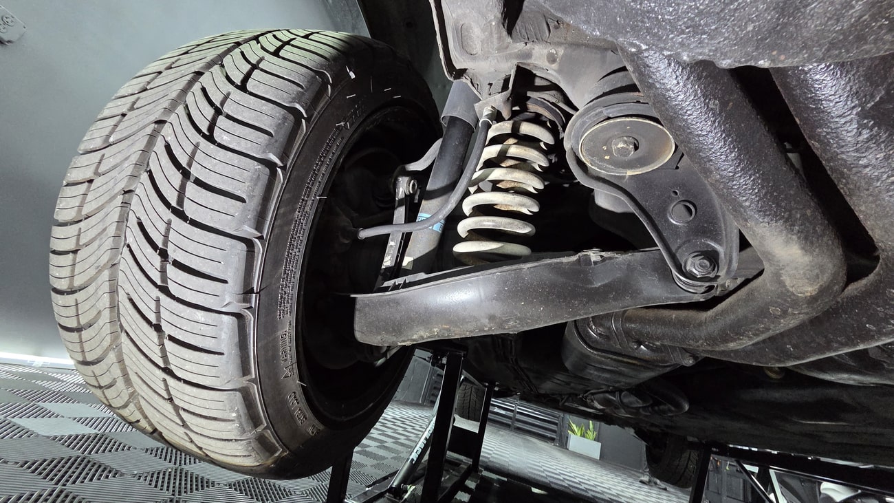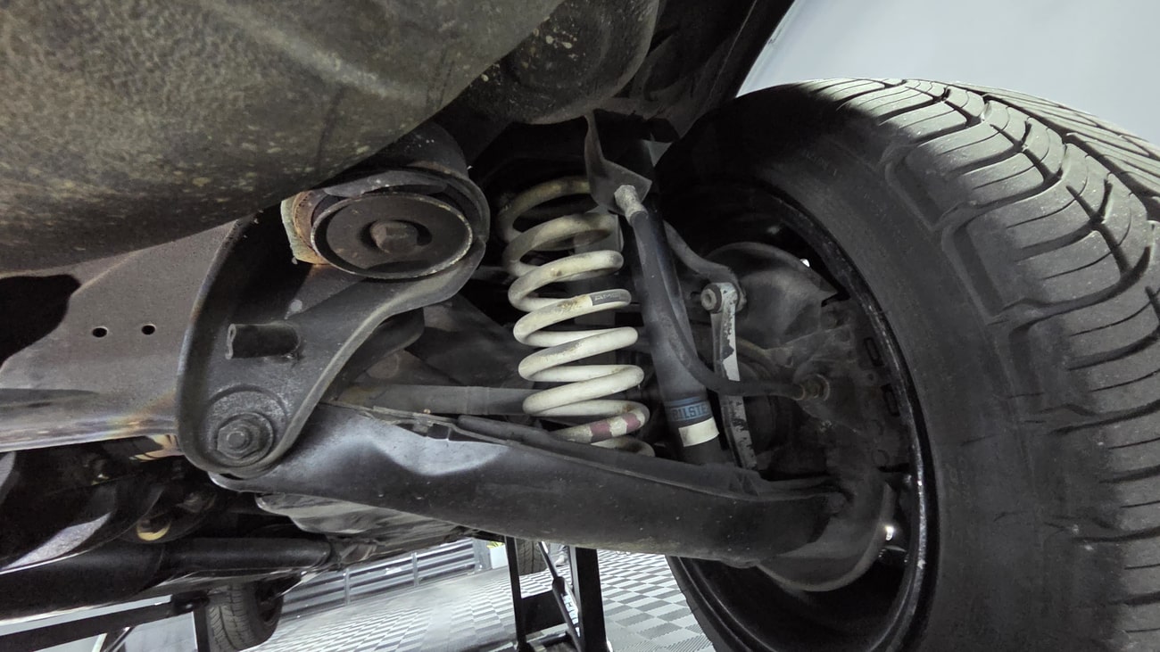 The paint-matched 3-piece 17” AMG Aero III wheels feature original OZ Racing hardware and were resealed in May 2025. BF Goodrich G-Force Comp2 A/S tires are mounted which measure 215/45 up front and 235/45 in the rear. ASR slip control and four-wheel anti-lock disc brakes are fitted as standard. The AMG suspension includes white springs and Bilstein shocks. New control arms and bump stops were installed in 2021. A brake fluid flush was performed in September 2025.