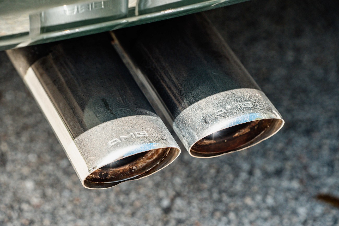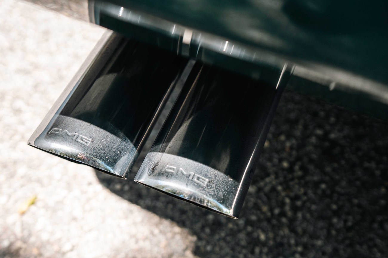 The bodywork is finished in Pine Green Metallic (254) with all painted chrome including the grille, side molding, and bumper impact strips. Exterior equipment includes Euro-spec headlights with integrated fog lights, a power-adjustable passenger door mirror, Euro front fender turn signals, an automatic antenna, and central locking. No signs of rust are present on the body. Twin AMG exhaust tips are seen exiting the rear. The rear window features a Yanase sticker, a Japanese dealer known for specializing in premerger AMG vehicles, along with an original AMG sticker.