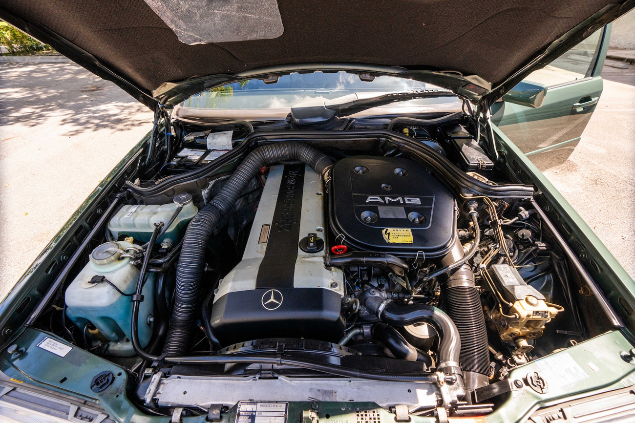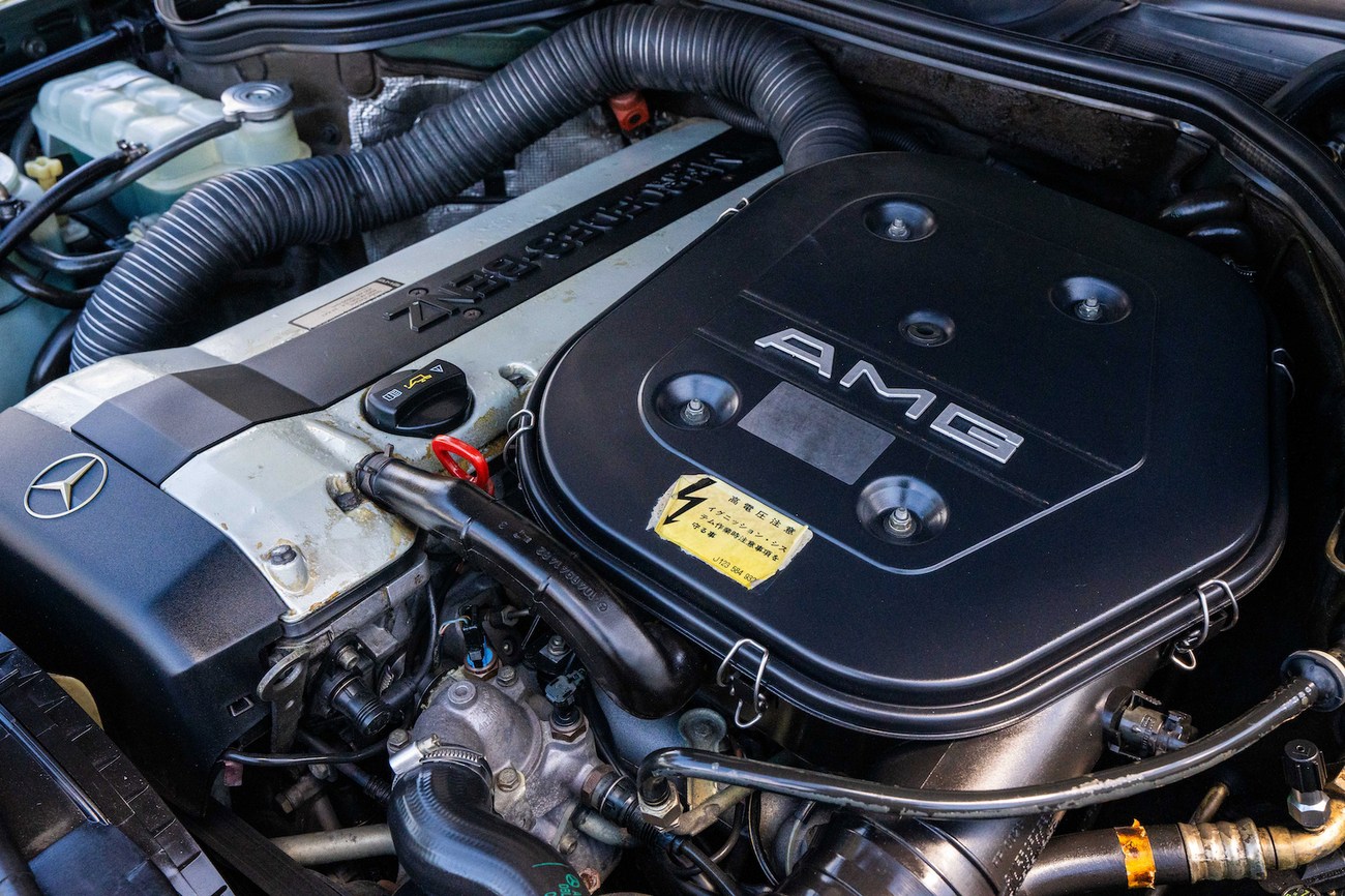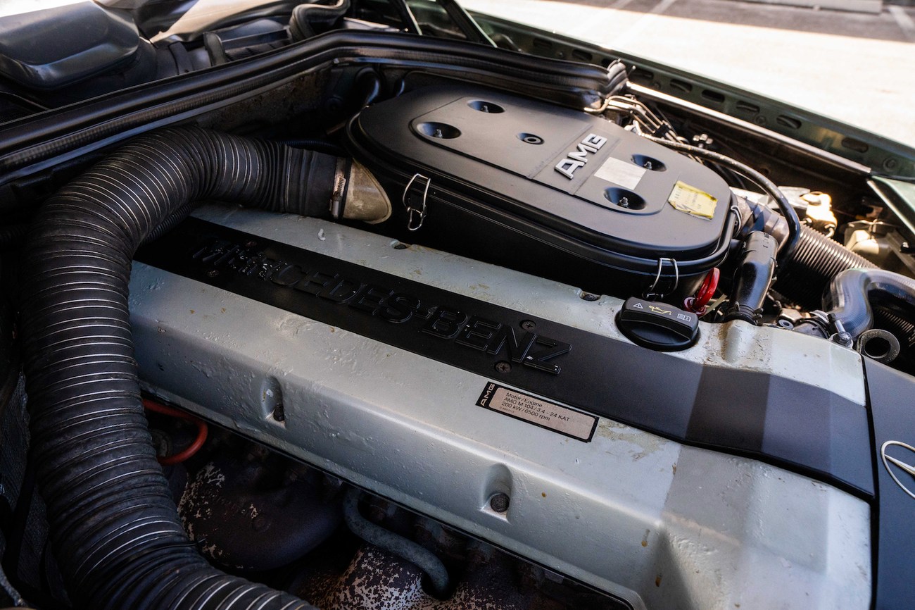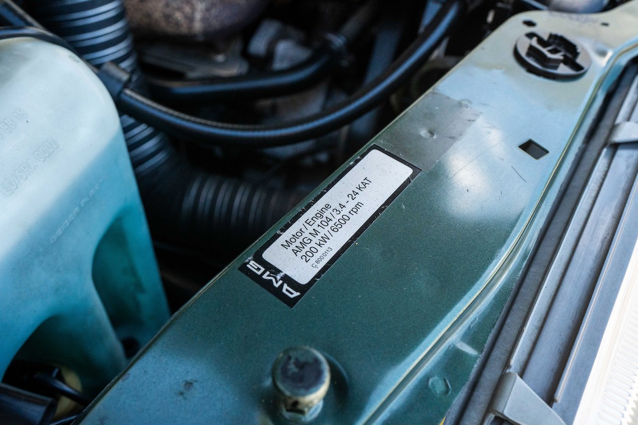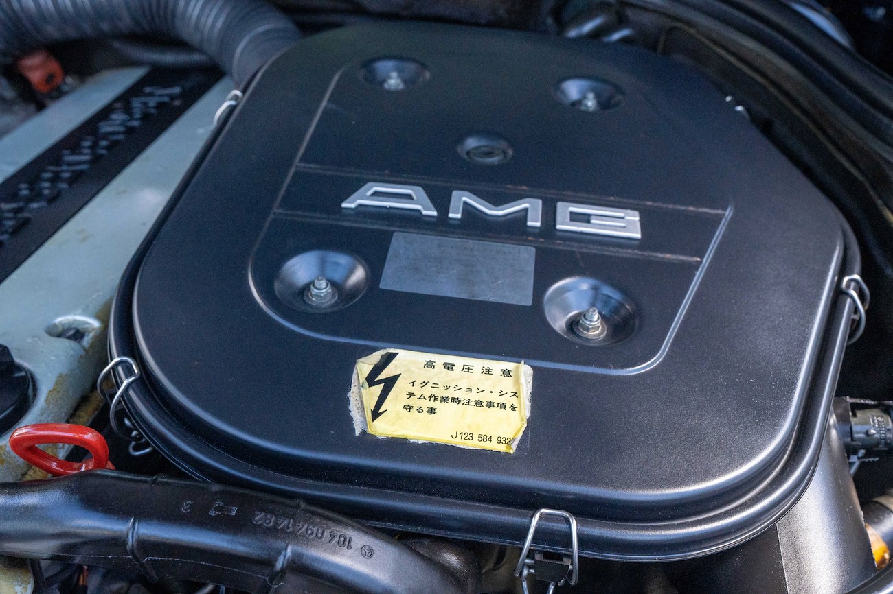 The original 3.0-liter M104 inline-six was bored and stroked to 3.4 liters by AMG in Japan and fitted with custom AMG camshafts which help the engine produce 268 horsepower and 243 lb-ft of torque. Power is sent to the rear wheels through a four-speed automatic transmission. Service upon import in late 2020/early 2021 included all fresh fluids, new tires, engine mounts, transmission mounts, control arms and bump stops. In preparation for the sale, the seller performed a full service on the car which included a top off of all fluids, an oil and filter change, new air filter, new battery, a brake fluid flush and bleed at all calipers, and an A/C R134 recharge. A new hood pad was installed in 2022. The AMG exhaust is stamped and made by Sebring with authentic period correct tips. AMG stickers denoting the engine modifications are found on the valve cover and radiator support.