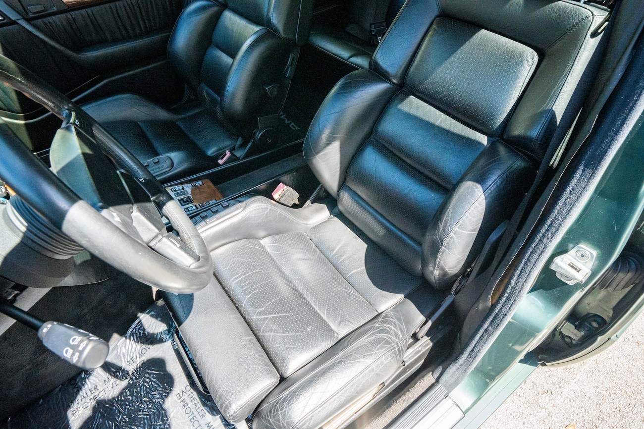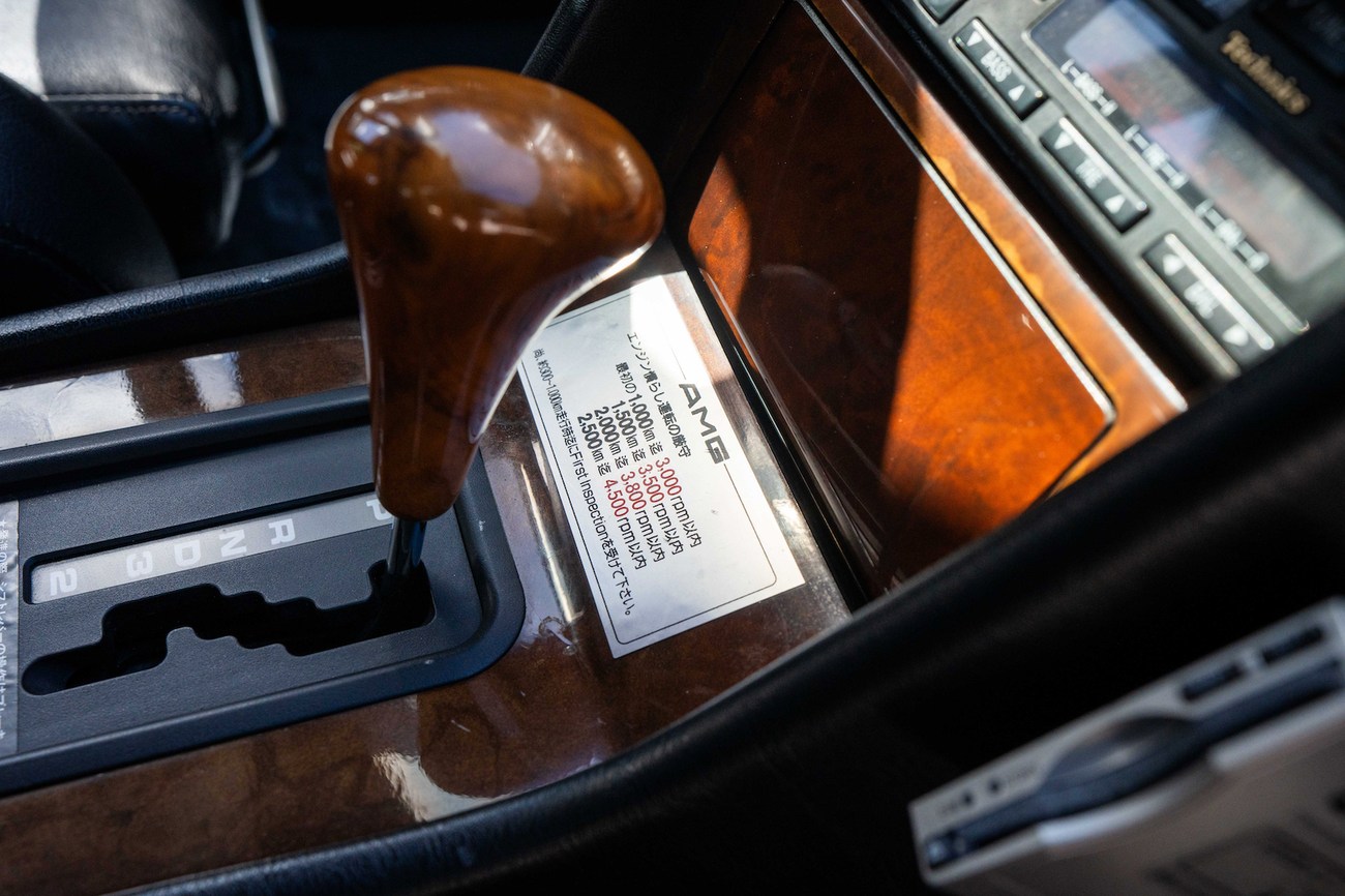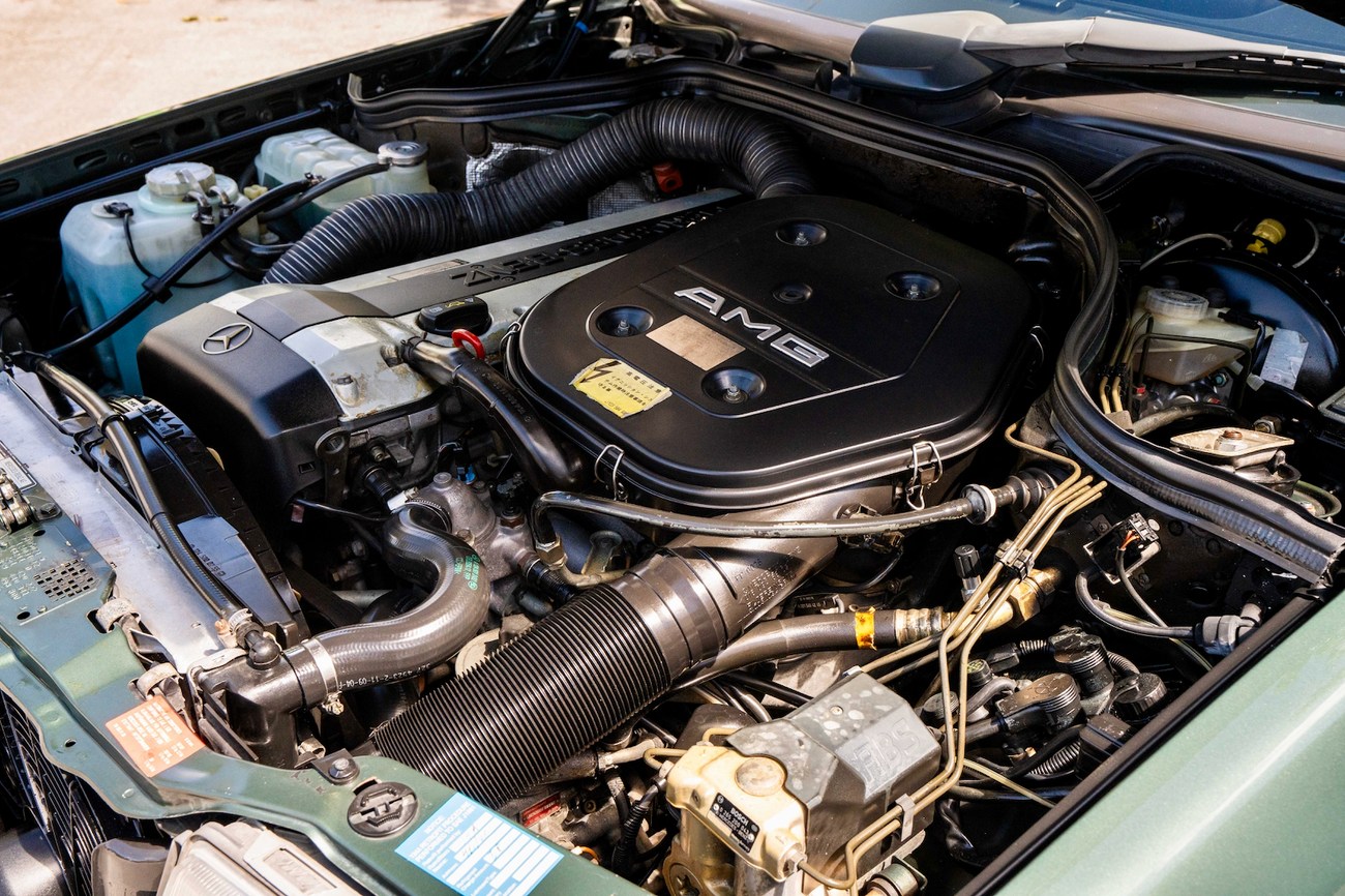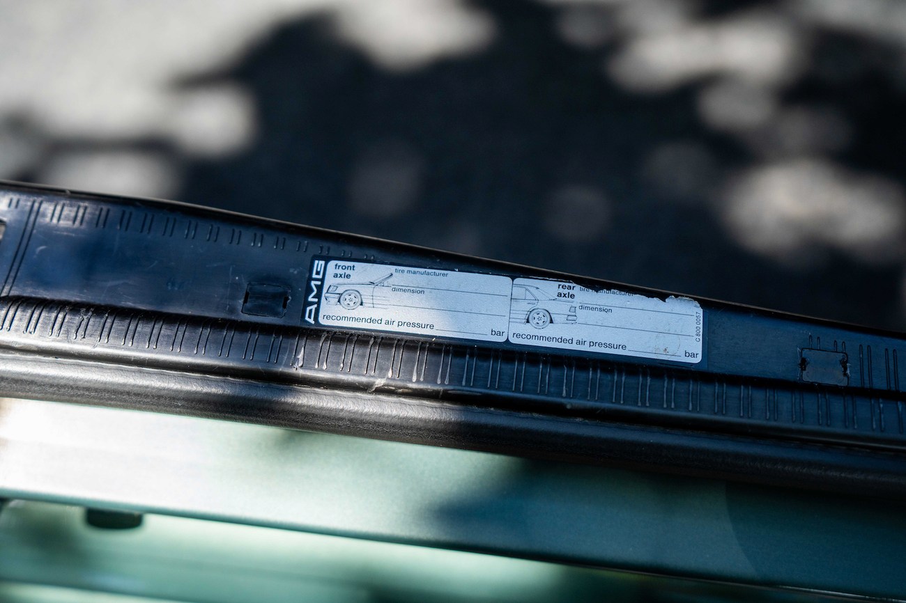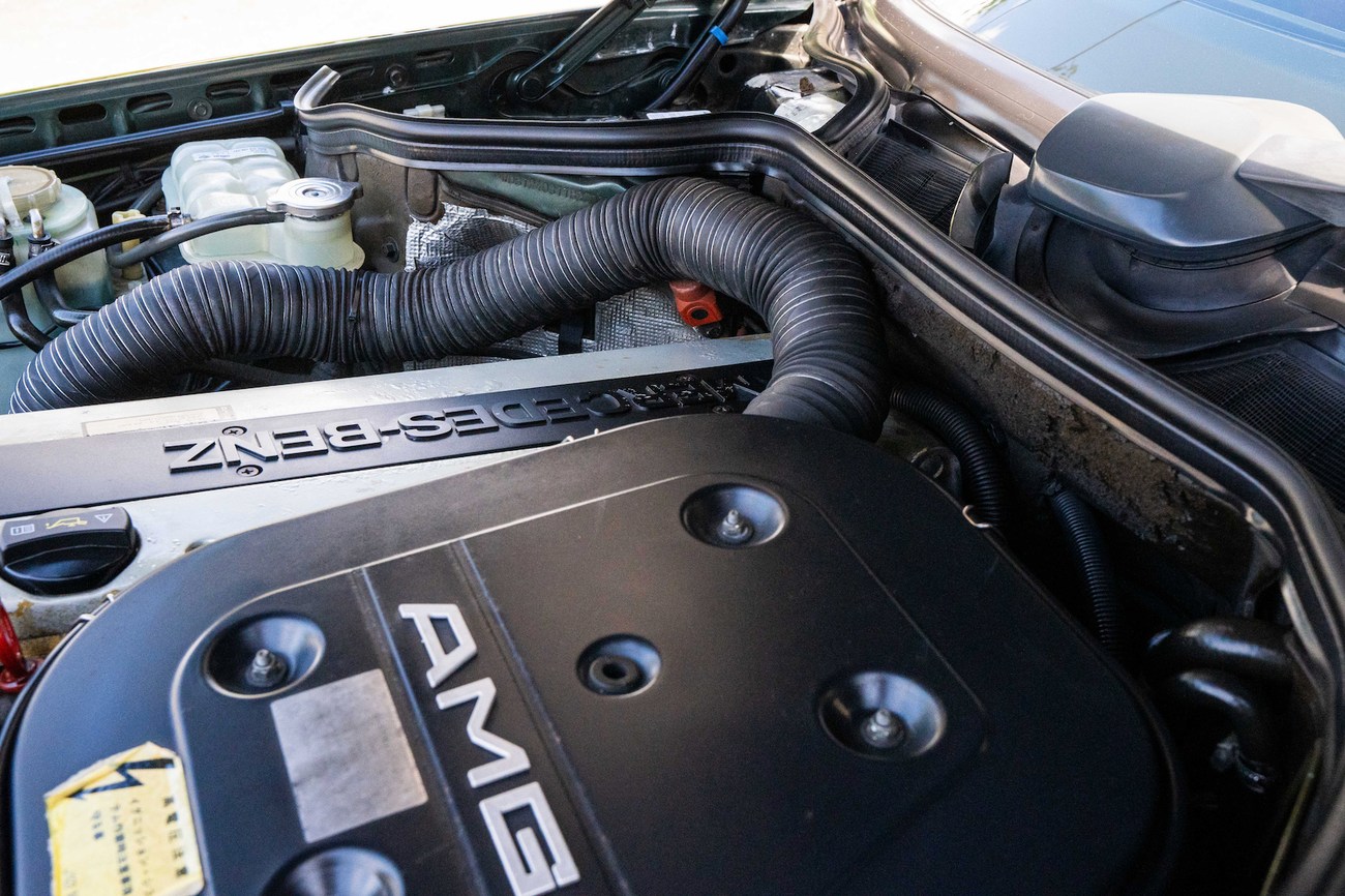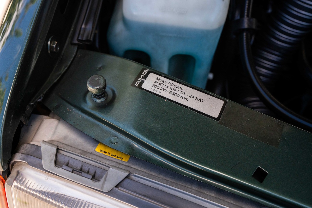 The original 3.0-liter M104 inline-six was bored and stroked to 3.4 liters by AMG in Japan and fitted with custom AMG camshafts which help the engine produce 268 horsepower and 243 lb-ft of torque. Power is sent to the rear wheels through a four-speed automatic transmission. Service upon import in late 2020/early 2021 included all fresh fluids, new tires, engine mounts, transmission mounts, control arms and bump stops. In preparation for the sale, the seller performed a full service on the car which included a top off of all fluids, an oil and filter change, new air filter, new battery, a brake fluid flush and bleed at all calipers, and an A/C R134 recharge. A new hood pad was installed in 2022. The AMG exhaust is stamped and made by Sebring with authentic period correct tips. AMG stickers denoting the engine modifications are found on the valve cover and radiator support.