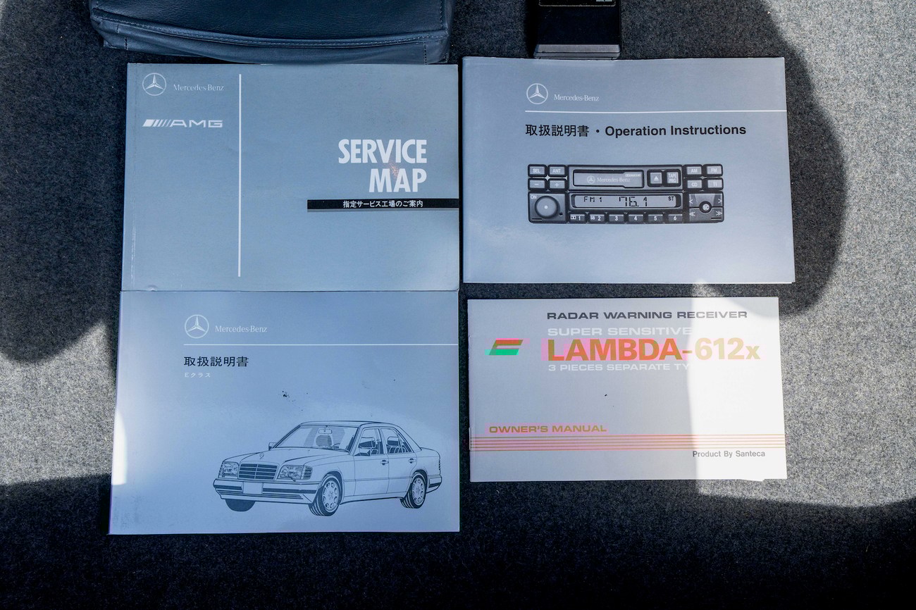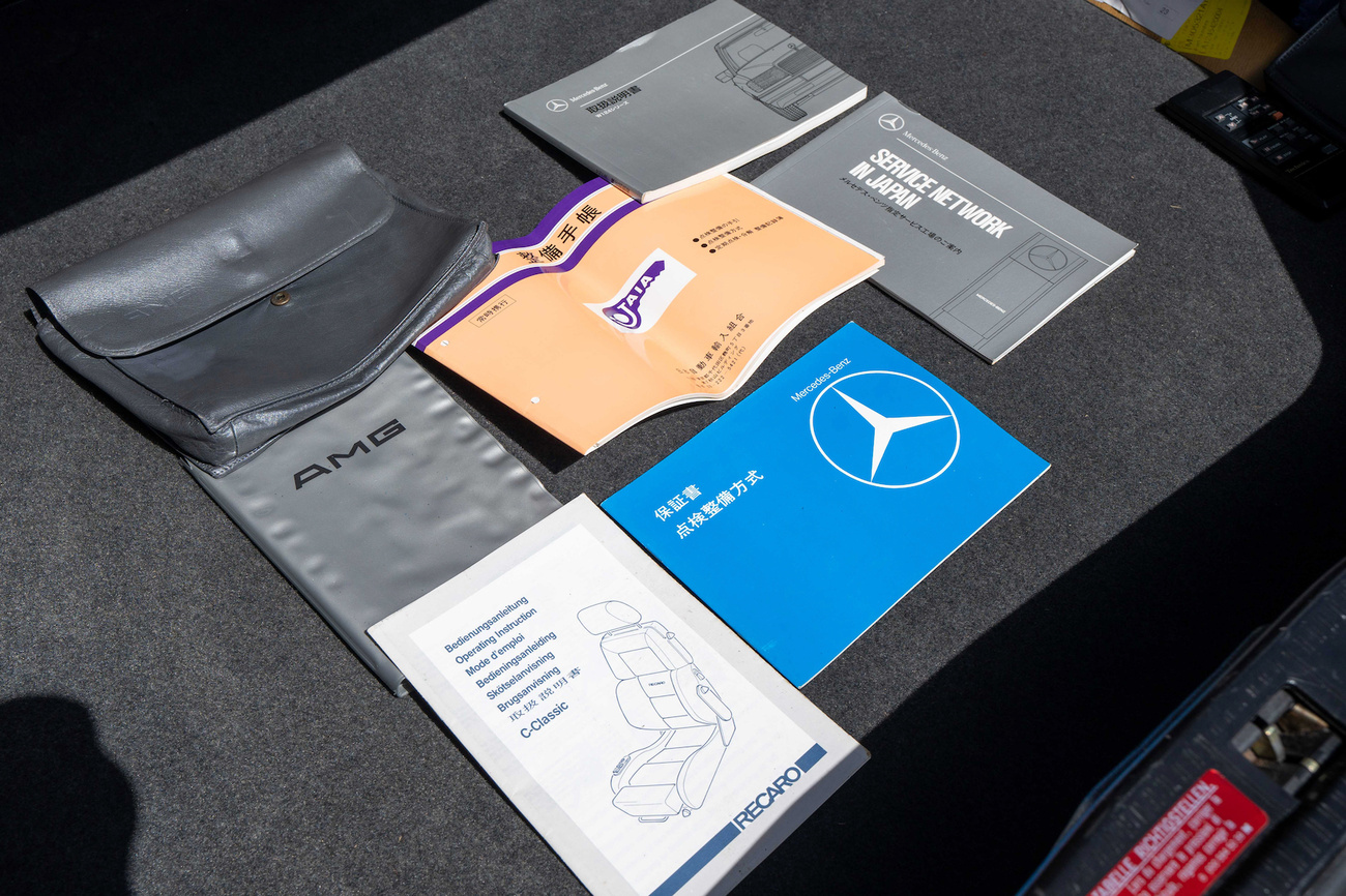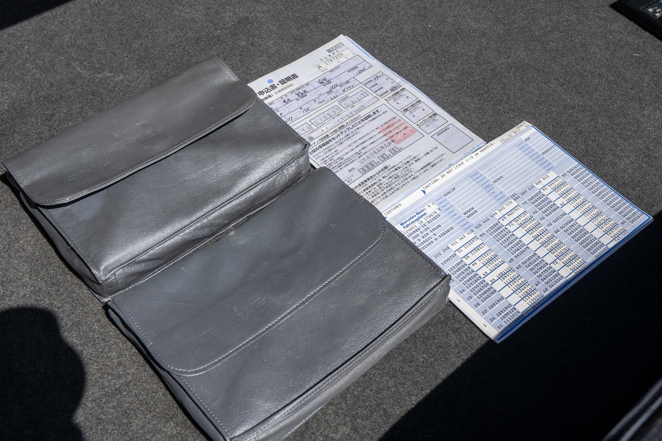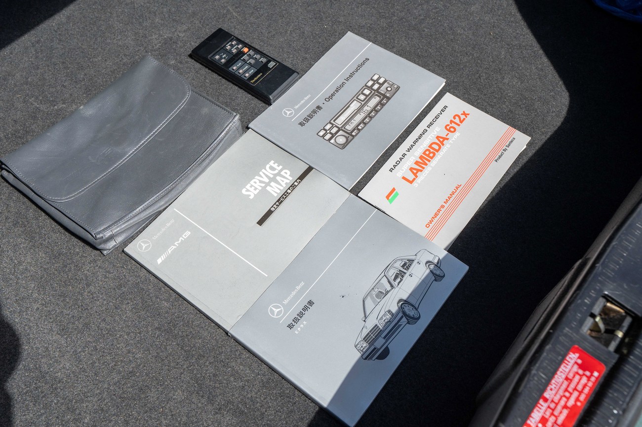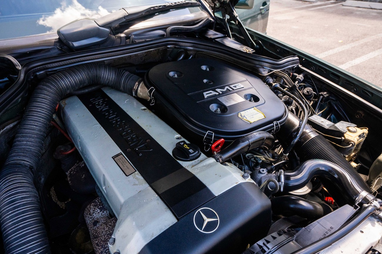 The original 3.0-liter M104 inline-six was bored and stroked to 3.4 liters by AMG in Japan and fitted with custom AMG camshafts which help the engine produce 268 horsepower and 243 lb-ft of torque. Power is sent to the rear wheels through a four-speed automatic transmission. Service upon import in late 2020/early 2021 included all fresh fluids, new tires, engine mounts, transmission mounts, control arms and bump stops. In preparation for the sale, the seller performed a full service on the car which included a top off of all fluids, an oil and filter change, new air filter, new battery, a brake fluid flush and bleed at all calipers, and an A/C R134 recharge. A new hood pad was installed in 2022. The AMG exhaust is stamped and made by Sebring with authentic period correct tips. AMG stickers denoting the engine modifications are found on the valve cover and radiator support.