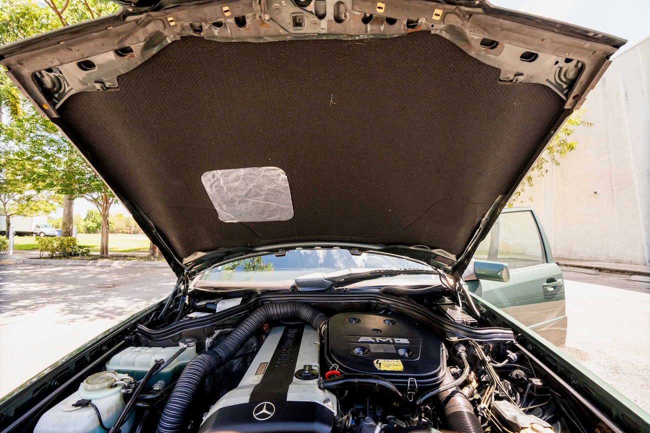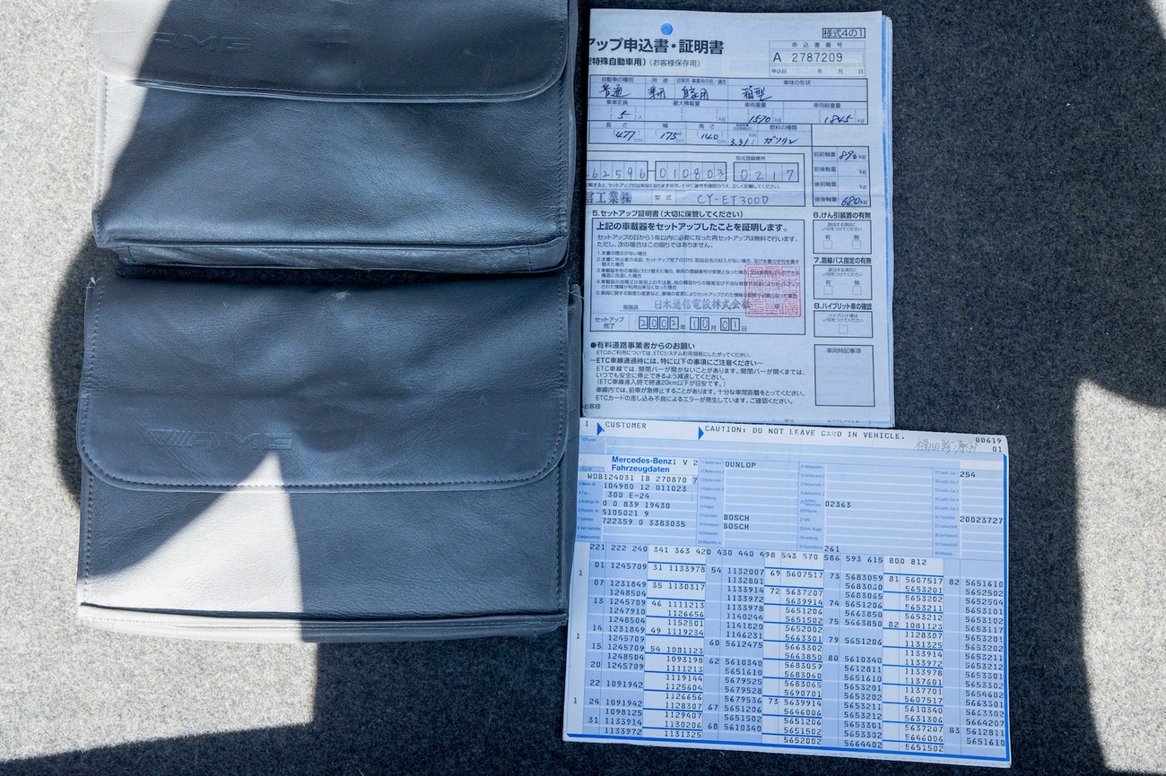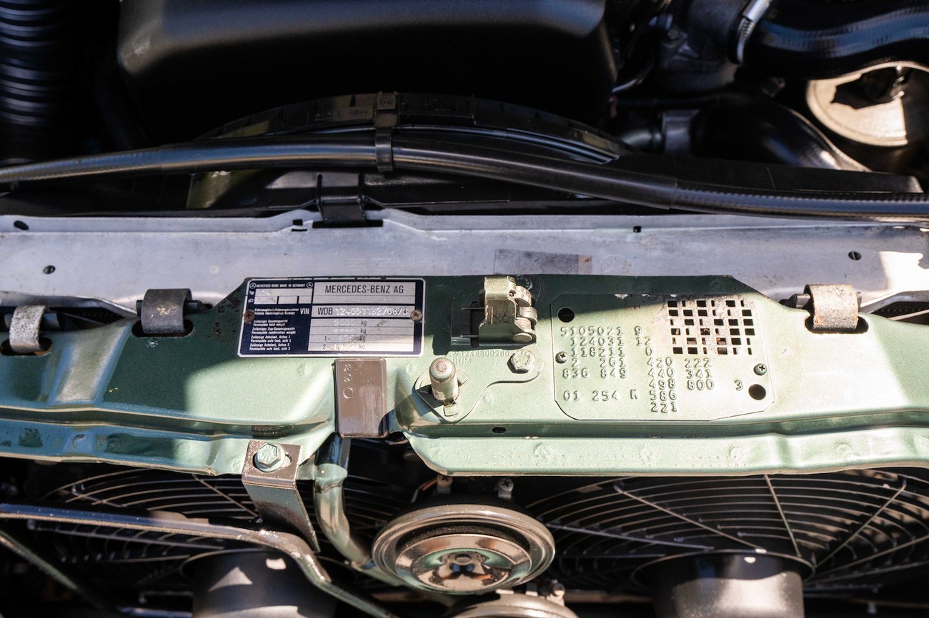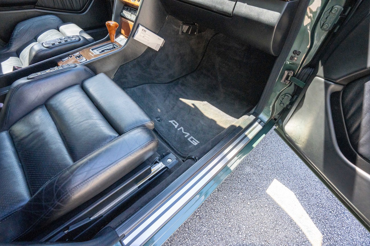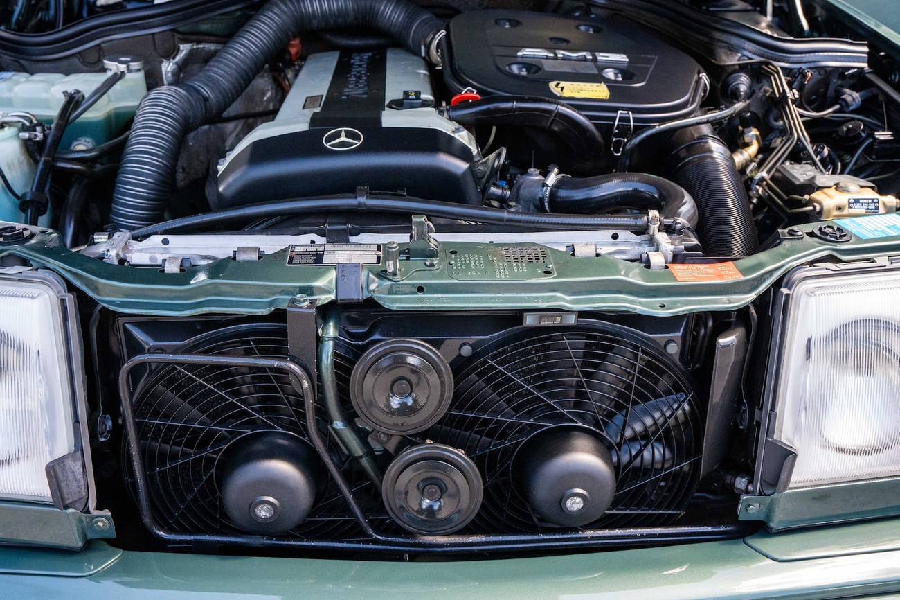 The original 3.0-liter M104 inline-six was bored and stroked to 3.4 liters by AMG in Japan and fitted with custom AMG camshafts which help the engine produce 268 horsepower and 243 lb-ft of torque. Power is sent to the rear wheels through a four-speed automatic transmission. Service upon import in late 2020/early 2021 included all fresh fluids, new tires, engine mounts, transmission mounts, control arms and bump stops. In preparation for the sale, the seller performed a full service on the car which included a top off of all fluids, an oil and filter change, new air filter, new battery, a brake fluid flush and bleed at all calipers, and an A/C R134 recharge. A new hood pad was installed in 2022. The AMG exhaust is stamped and made by Sebring with authentic period correct tips. AMG stickers denoting the engine modifications are found on the valve cover and radiator support.