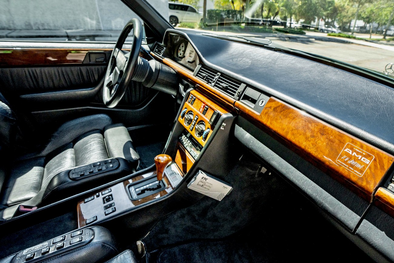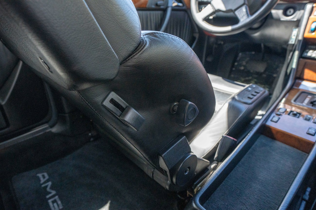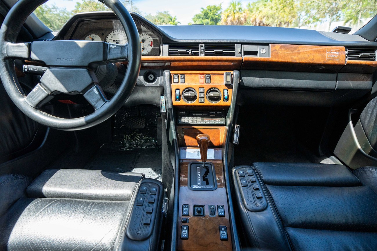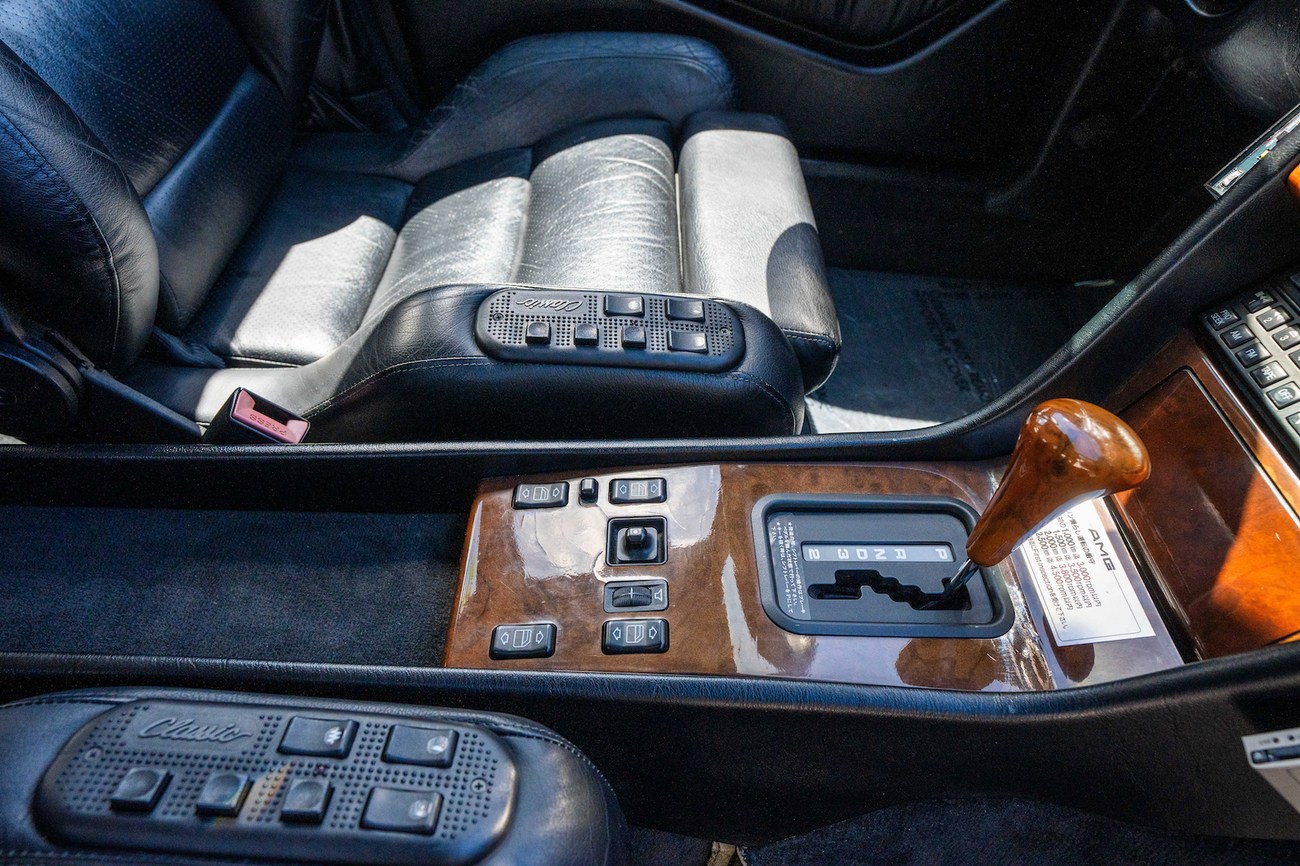 The interior is upholstered in Black Leather (261) and features front power-adjustable Recaro Classic seats which come with their original literature. Burl Walnut wood trim adorns the center console, gear selector, dashboard, and door panels. Additional interior appointments include air conditioning, cruise control, a power-adjustable passenger side mirror, rear headrests, a trunk mounted CD player, and a Panasonic head unit. The steering wheel has been upgraded with a Momo M38 exclusively for AMG and an AMG plaque is located on the ash tray cover.