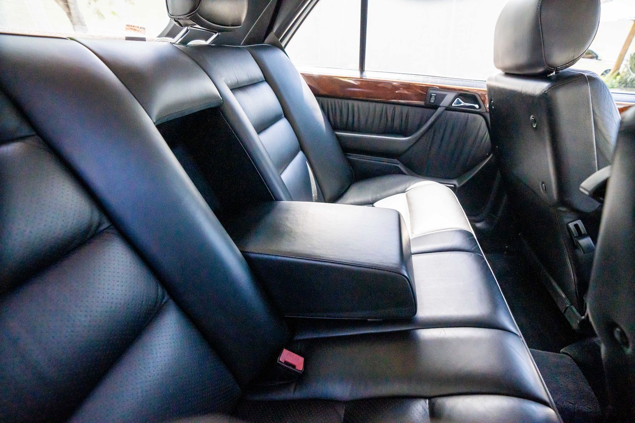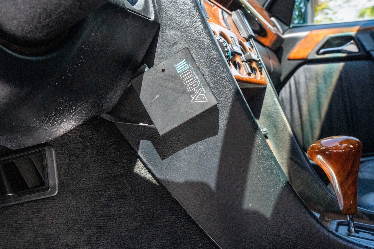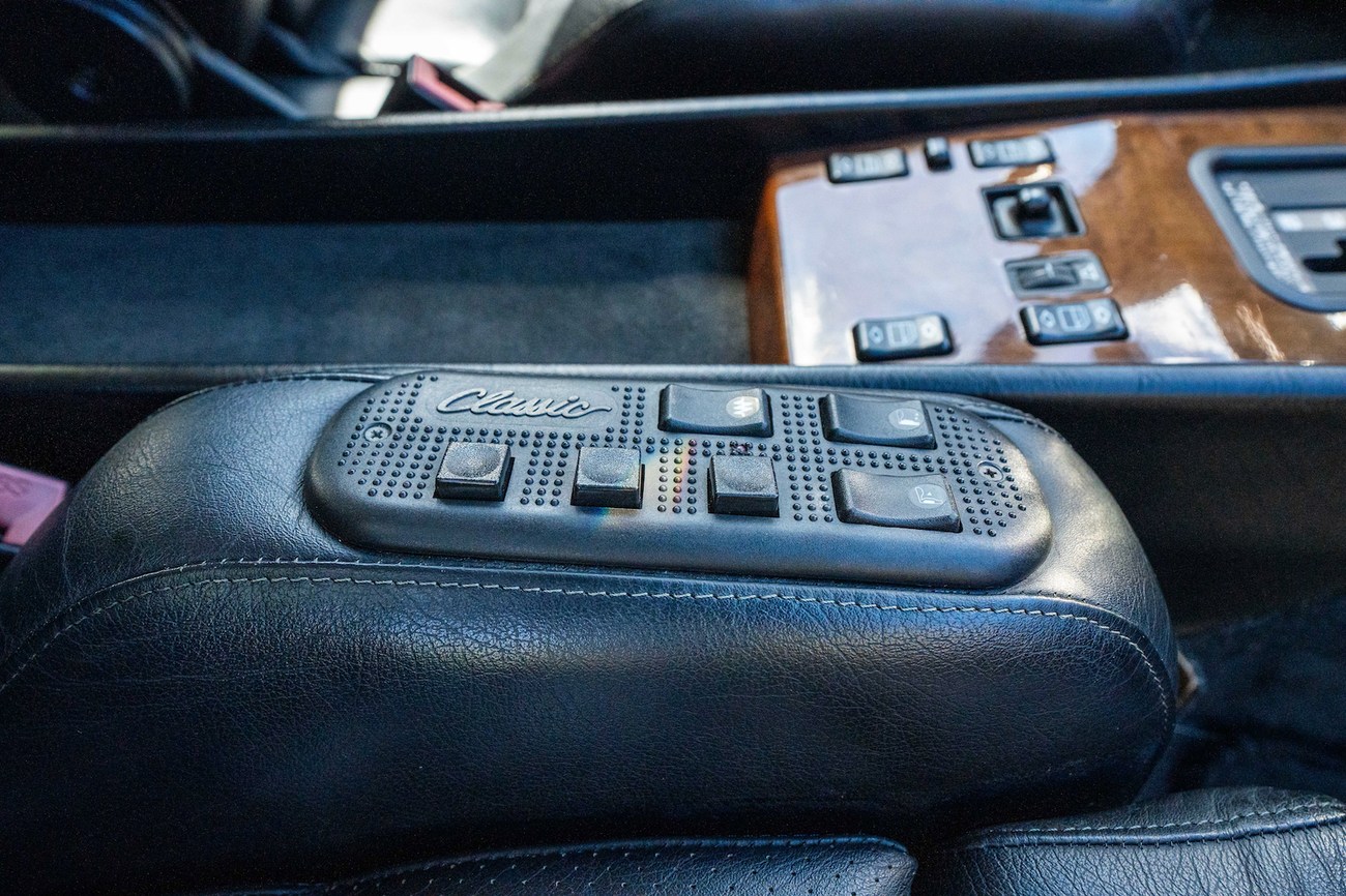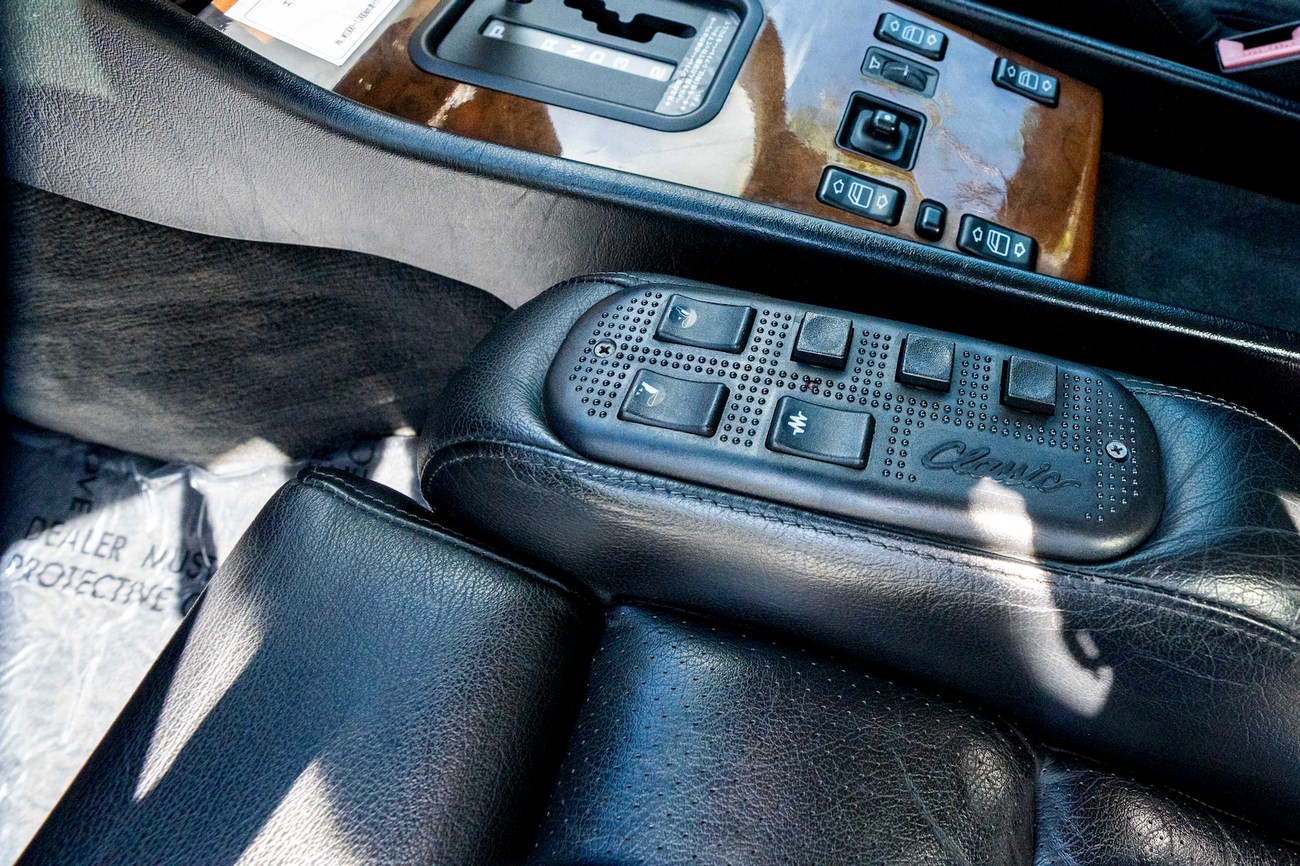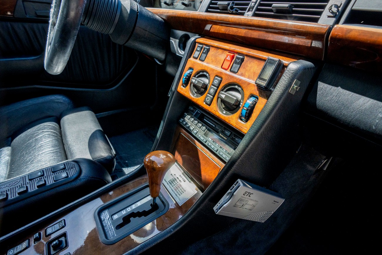 The interior is upholstered in Black Leather (261) and features front power-adjustable Recaro Classic seats which come with their original literature. Burl Walnut wood trim adorns the center console, gear selector, dashboard, and door panels. Additional interior appointments include air conditioning, cruise control, a power-adjustable passenger side mirror, rear headrests, a trunk mounted CD player, and a Panasonic head unit. The steering wheel has been upgraded with a Momo M38 exclusively for AMG and an AMG plaque is located on the ash tray cover.