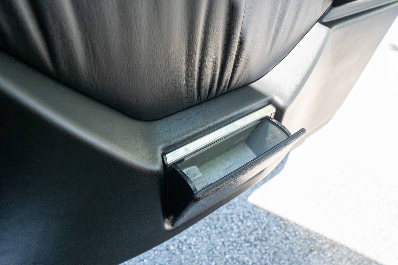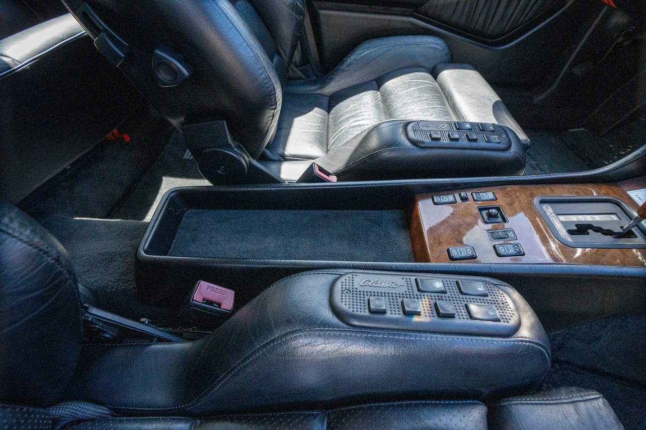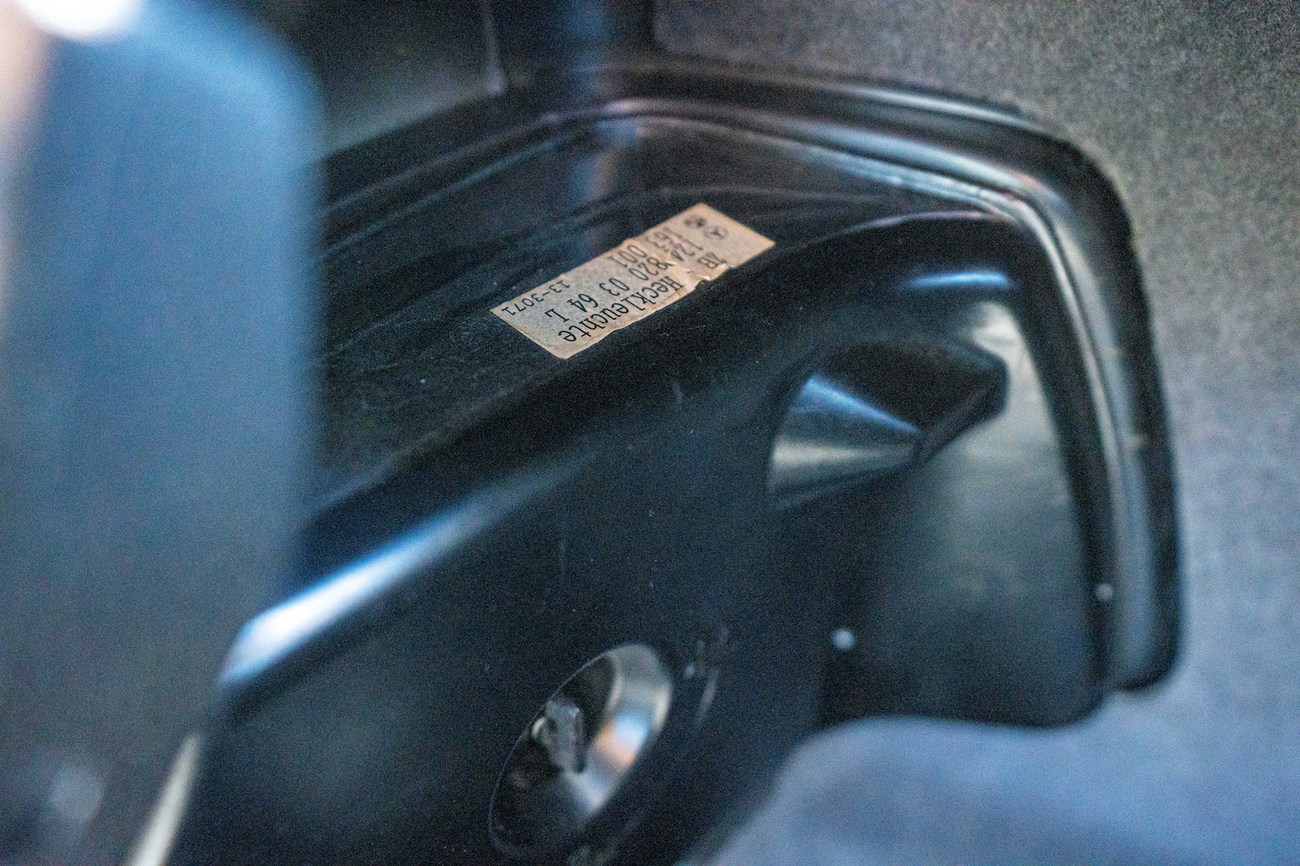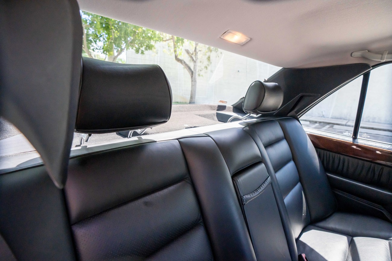 The interior is upholstered in Black Leather (261) and features front power-adjustable Recaro Classic seats which come with their original literature. Burl Walnut wood trim adorns the center console, gear selector, dashboard, and door panels. Additional interior appointments include air conditioning, cruise control, a power-adjustable passenger side mirror, rear headrests, a trunk mounted CD player, and a Panasonic head unit. The steering wheel has been upgraded with a Momo M38 exclusively for AMG and an AMG plaque is located on the ash tray cover.