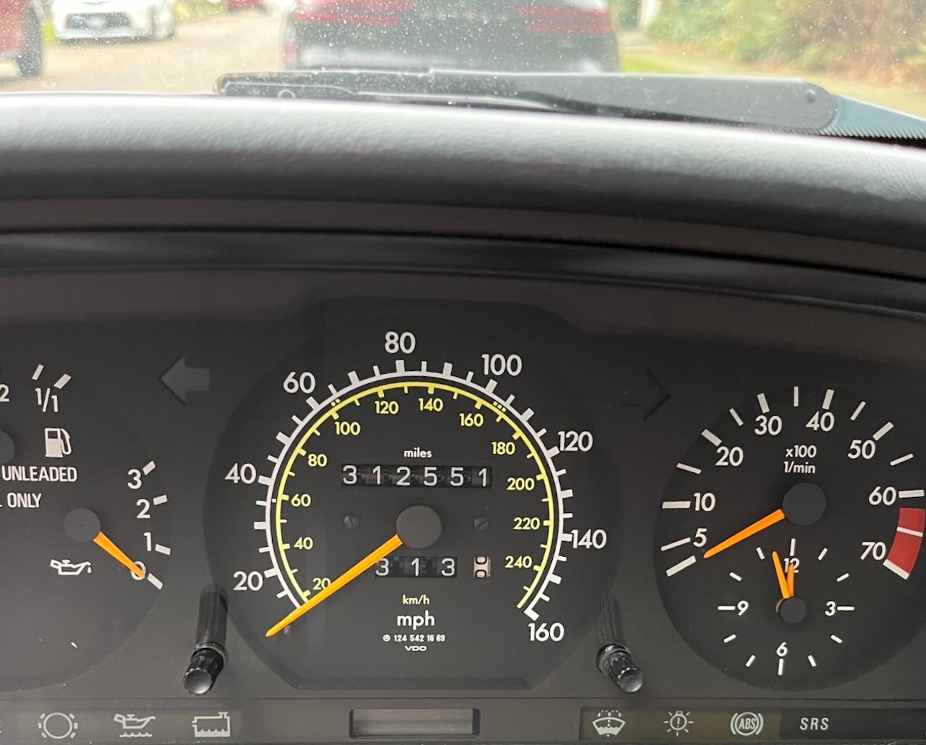The four-spoke steering wheel fronts analog instrumentation including a 160-mph speedometer, an 7k-rpm tachometer, an analog clock and gauges for fuel level, economy, coolant temperature and oil pressure. The six-digit odometer currently shows 313k miles from new.