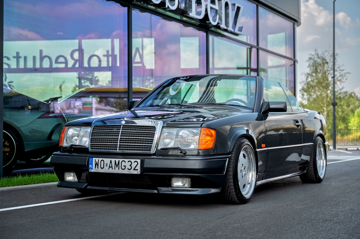 This 1992 Mercedes-Benz 320CE Cabriolet was built for the Japanese market and sold new in Japan. It was modified when new by the selling dealer with an AMG body kit, AMG exhaust, wheels, and AMG interior details. This 320CE is finished in Black Pearl Metallic (199) over Black Leather (261) and is powered by a 3.2-liter 24-valve inline-six linked with a five-speed automatic transmission. Equipment includes power adjustable front seats with driver-side memory, heated front seats, a power adjustable steering column, a power-folding fabric soft top, automatic climate control, cruise control, and a Becker head unit. Noted mechanical services since 2018 include new top hydraulics, an engine reseal, a suspension refresh including shocks and bushings, and regular oil services. With 2 owners noted since new and 97k km (~60k miles) shown, this 1992 320CE Cabriolet is offered with service records, prior registration documents, two key fobs, and a Polish registration.