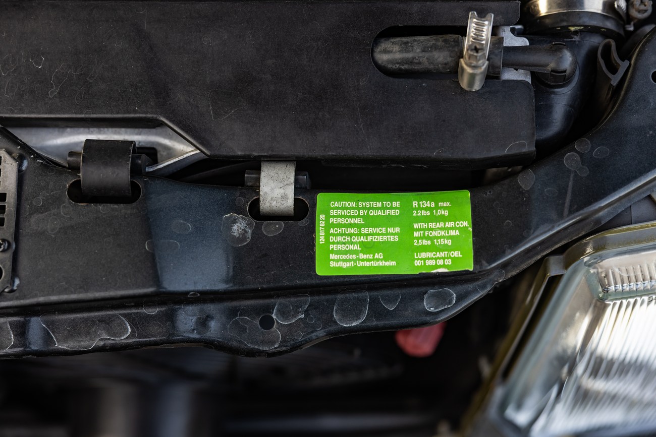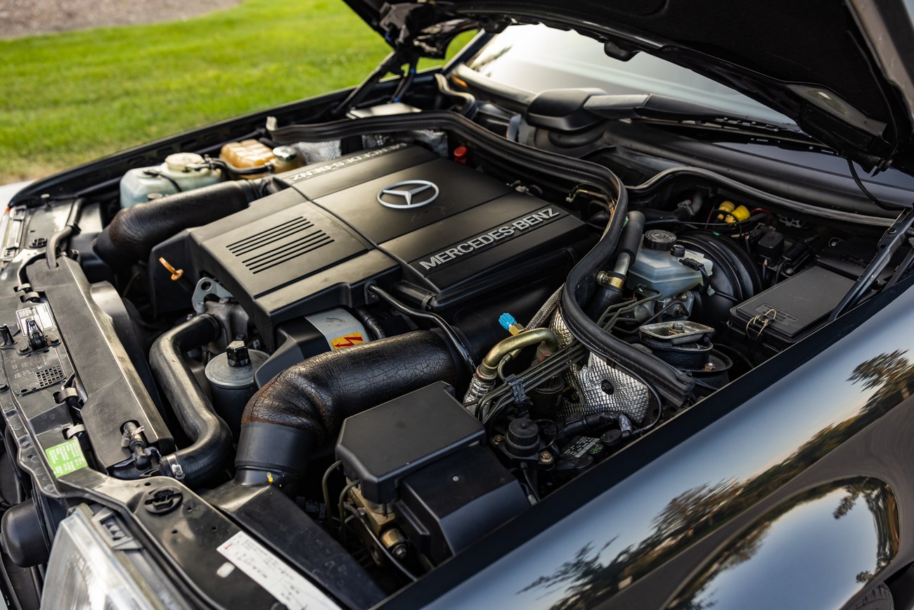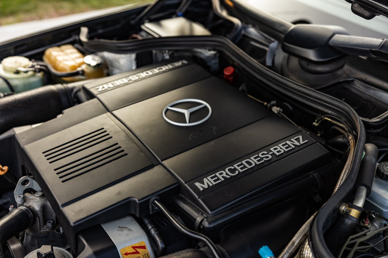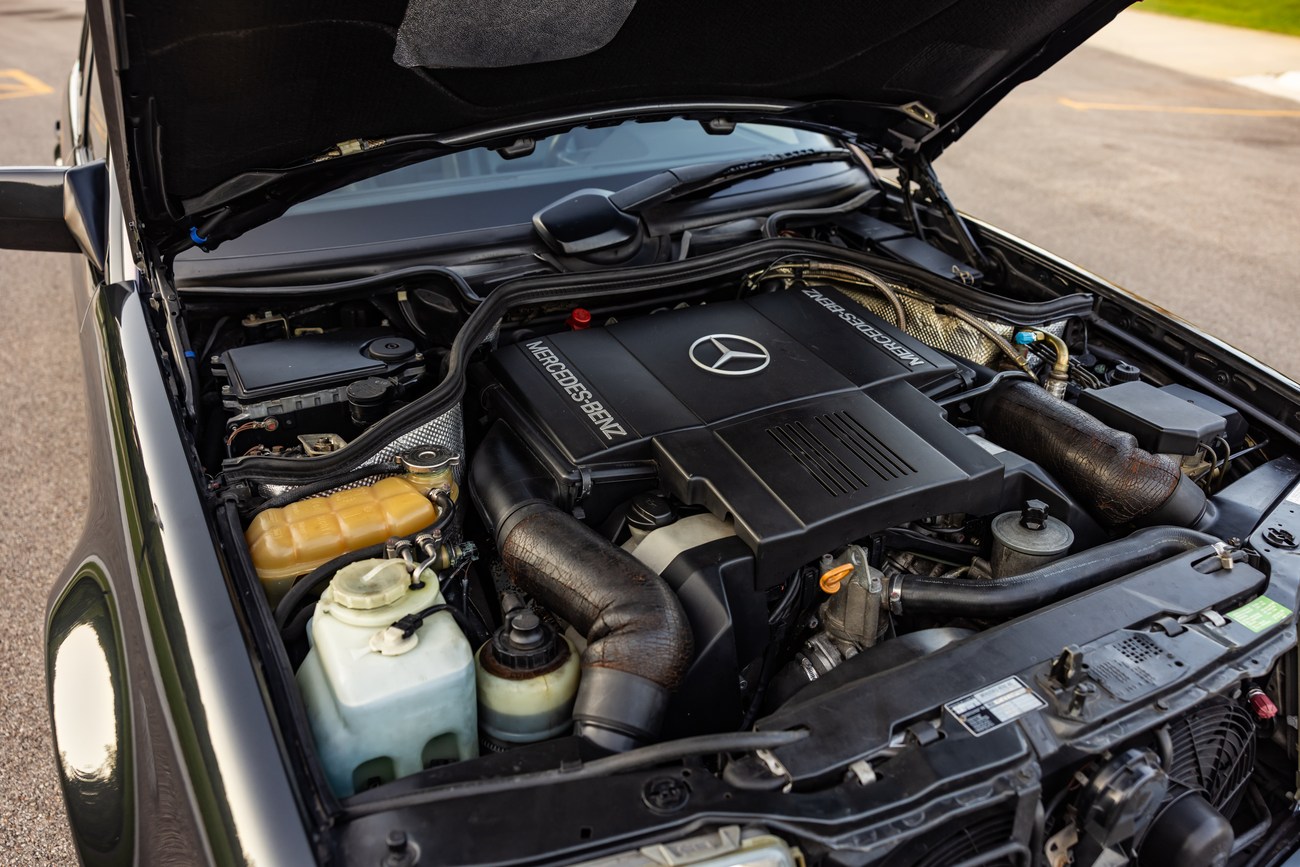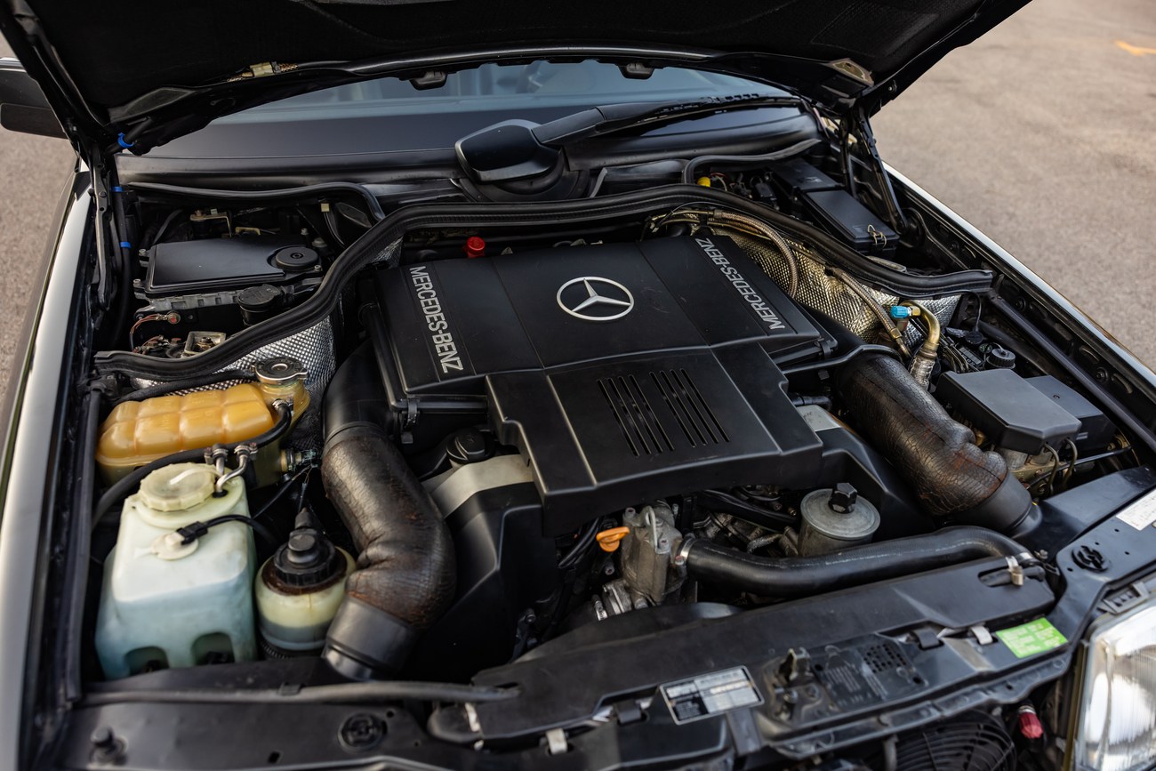 The 5.0-liter M119 DOHC V8 was factory rated at 322 horsepower and 354 lb-ft of torque. Power is sent to the rear wheels through a four-speed automatic transmission. The most recent service in August 2024 included the replacement of the camshaft seals, distributor caps and rotor, and clutch fan, along with a new fuel filter, fuel pump, and fuel lines. Prior service performed included a new air conditioning compressor and receiver/driver in November 2023, new front shocks and tie rods in September 2022, and new spark plugs and engine air filters in February 2022. Underbody photos are provided in the gallery.