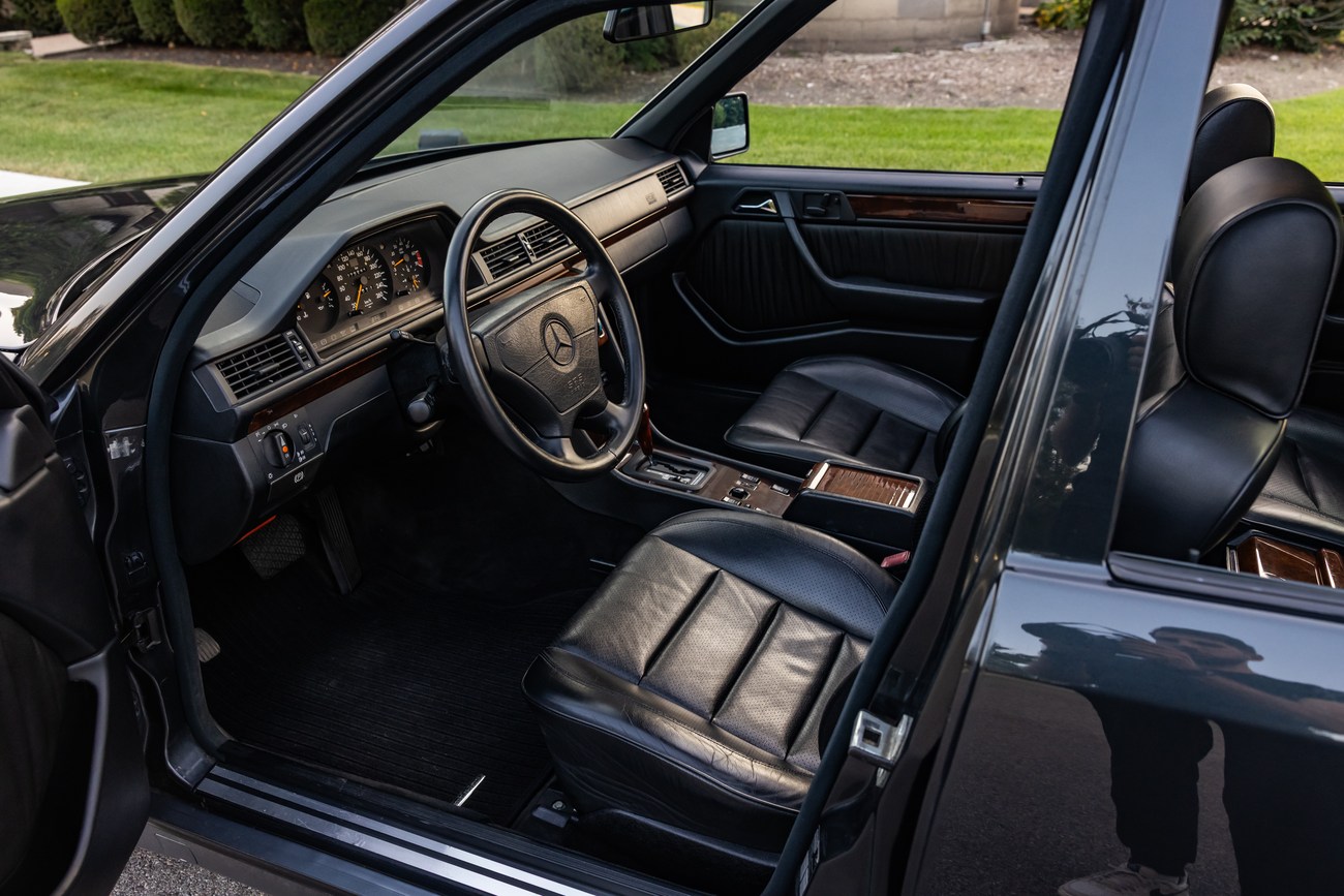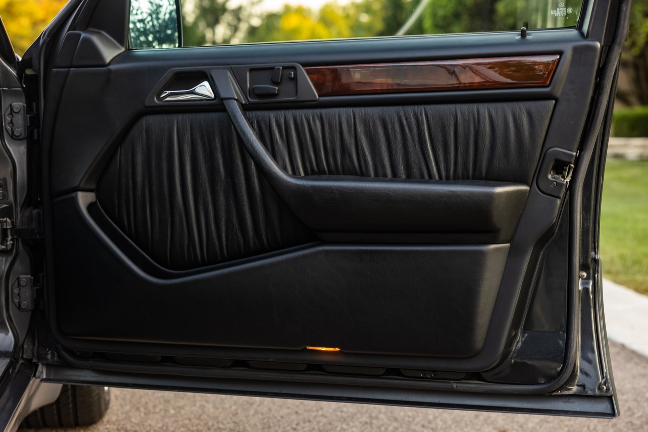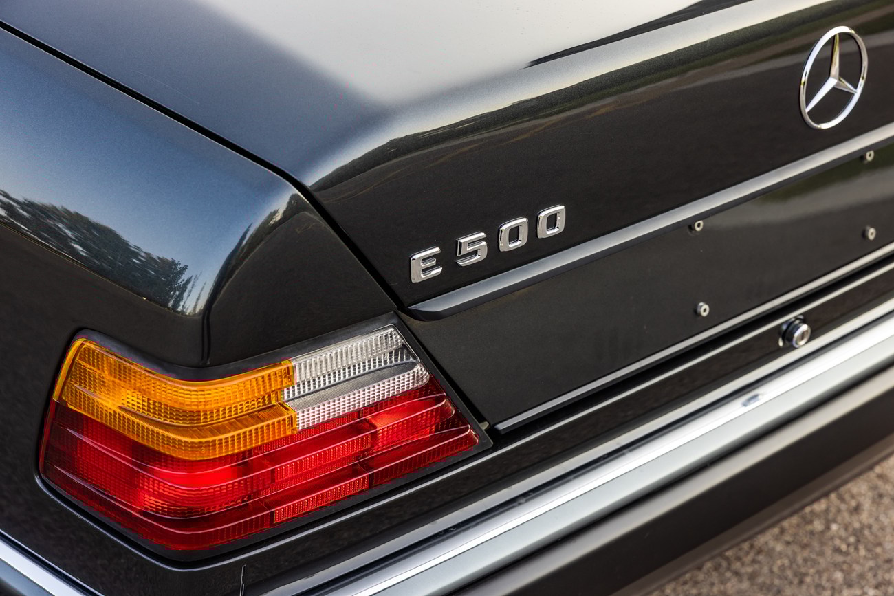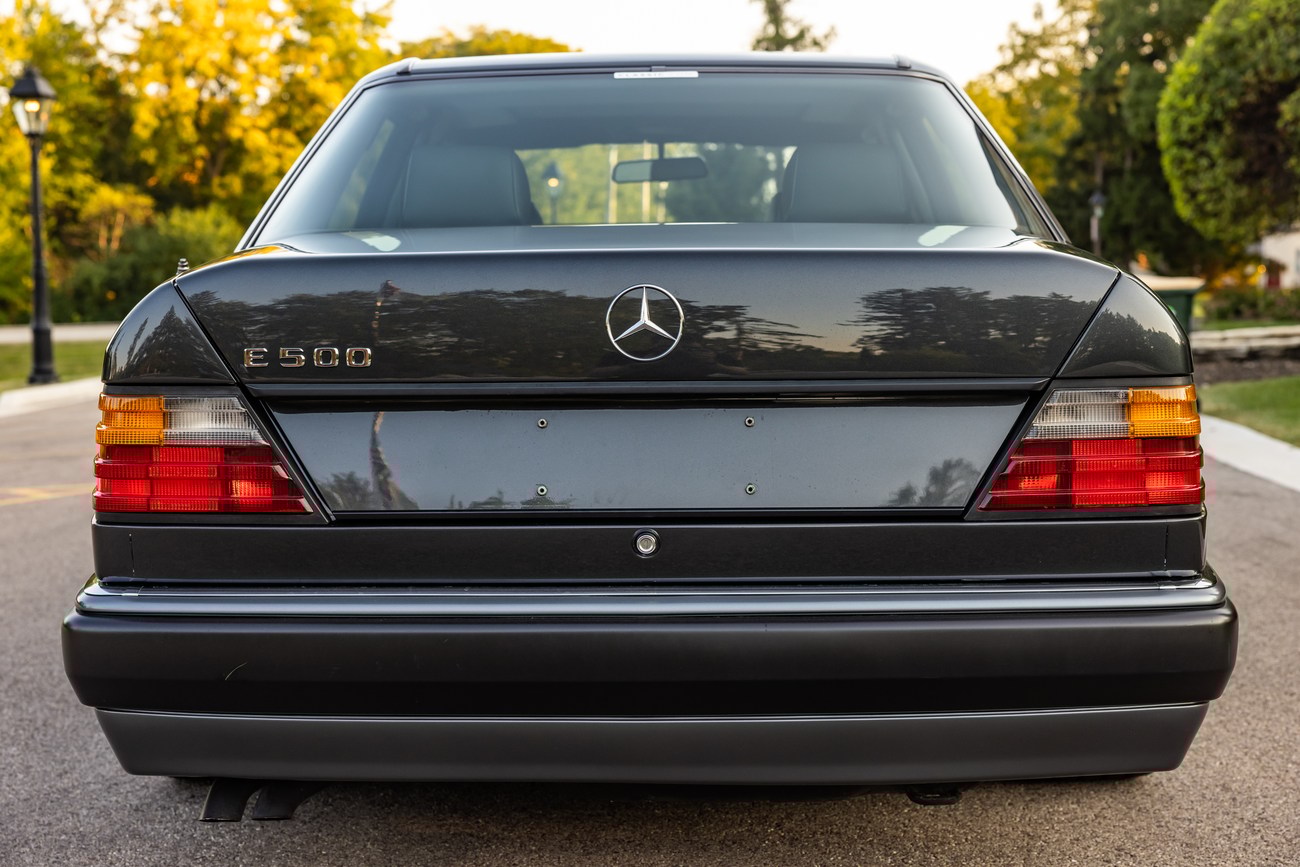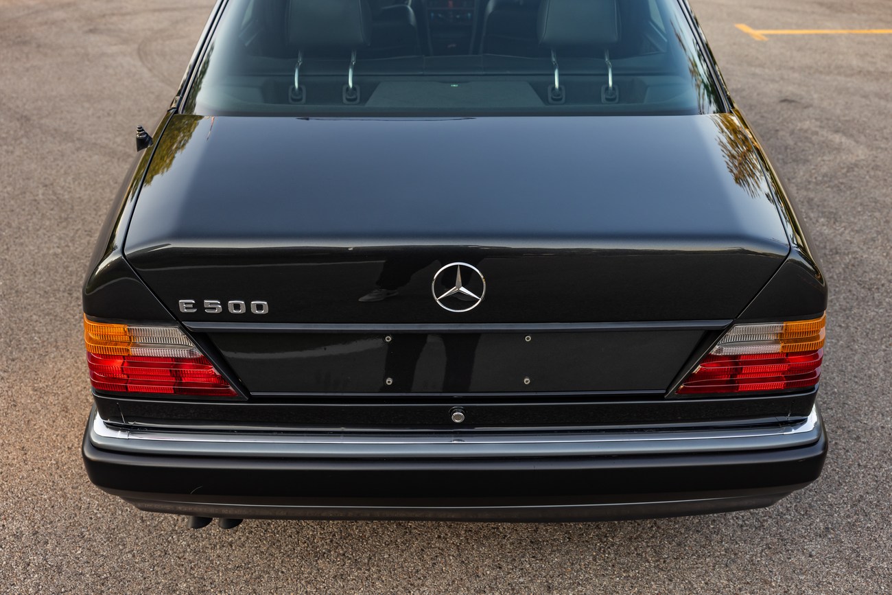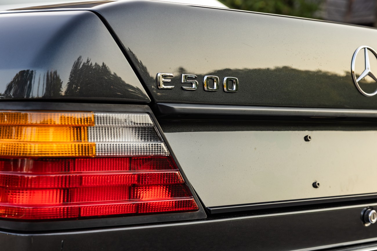 The body is finished in Black Pearl Metallic (199) with grey lower cladding. The 500E was assembled by Porsche and featured wheel arch flares, revised bodywork, and a lower ride height when compared to a standard W124 models. Additional exterior features include original Euro-spec 500E-specific headlights with wipers, integrated fog lights, a retractable antenna, and a power sunroof. The seller notes the lower cladding was refinished and rust repair was performed around the taillights and on the trunk by Michaelian Restoration of Stuart, Florida, in August 2022. The original "500E" badge has been replaced with the updated "E500" lettering on the trunk lid.