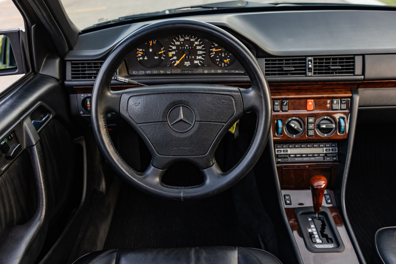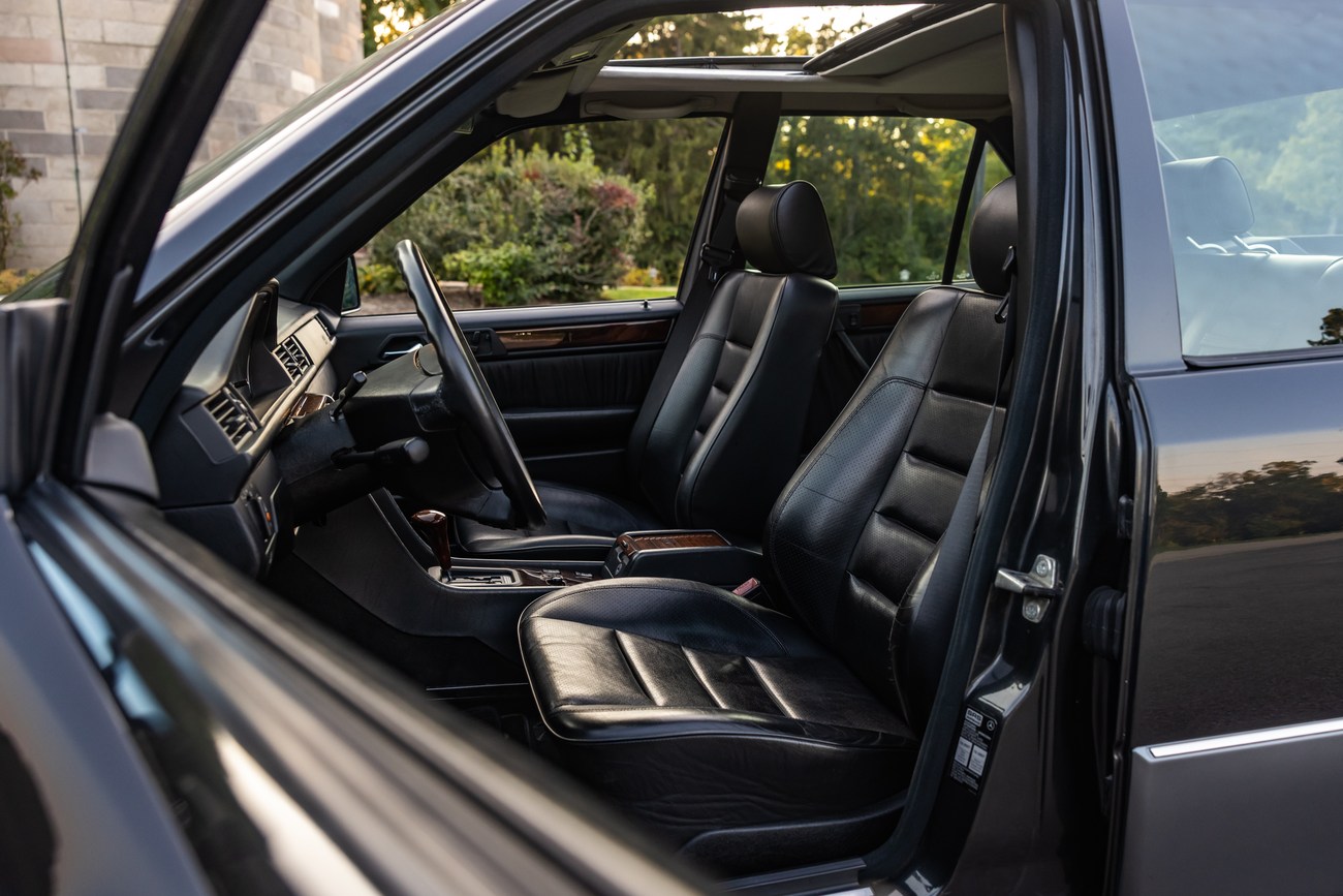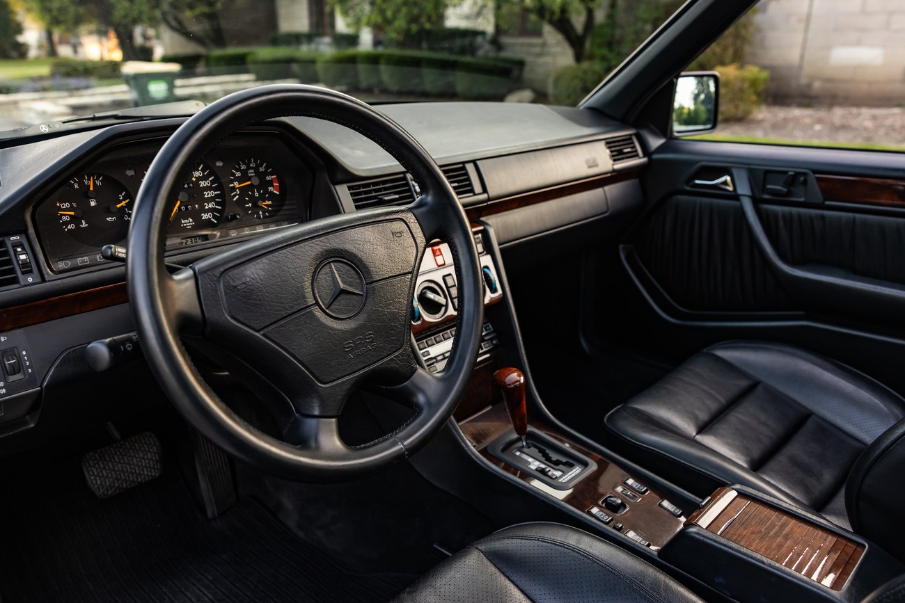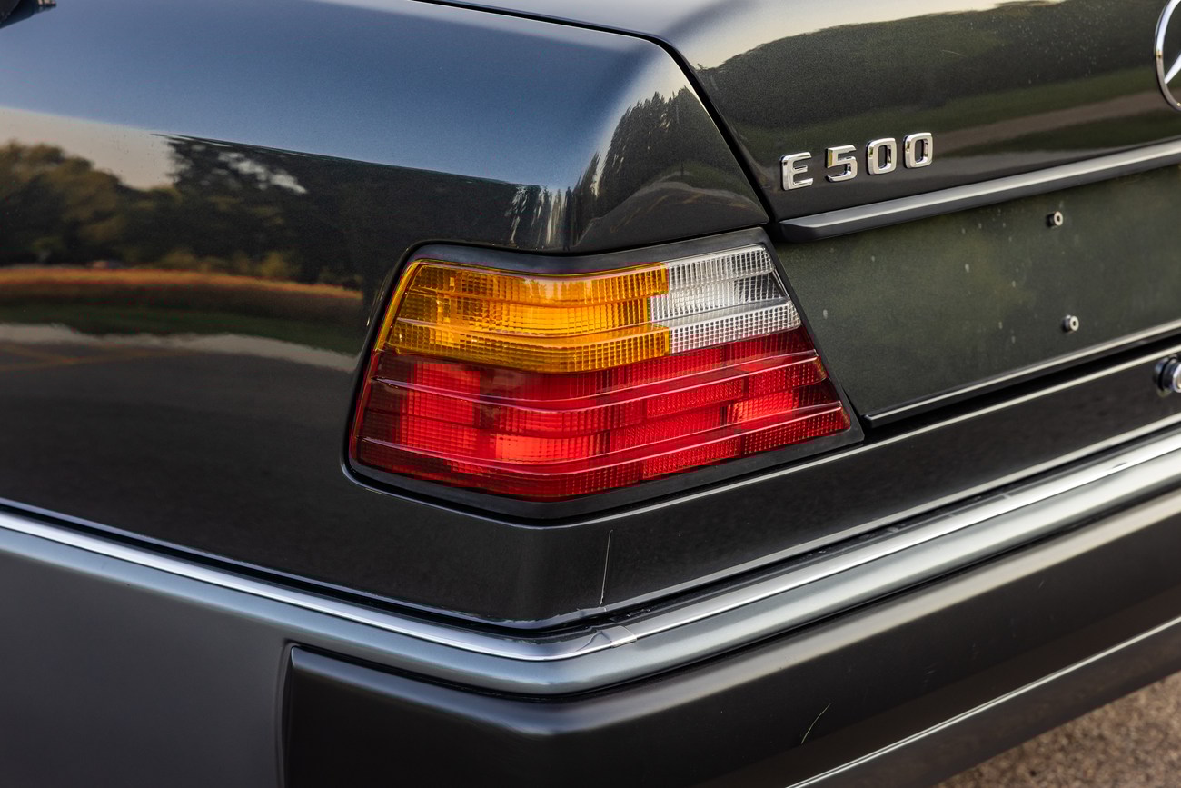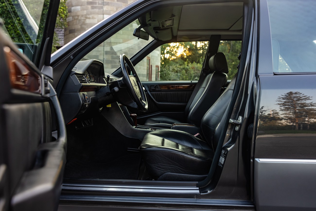 The body is finished in Black Pearl Metallic (199) with grey lower cladding. The 500E was assembled by Porsche and featured wheel arch flares, revised bodywork, and a lower ride height when compared to a standard W124 models. Additional exterior features include original Euro-spec 500E-specific headlights with wipers, integrated fog lights, a retractable antenna, and a power sunroof. The seller notes the lower cladding was refinished and rust repair was performed around the taillights and on the trunk by Michaelian Restoration of Stuart, Florida, in August 2022. The original "500E" badge has been replaced with the updated "E500" lettering on the trunk lid.