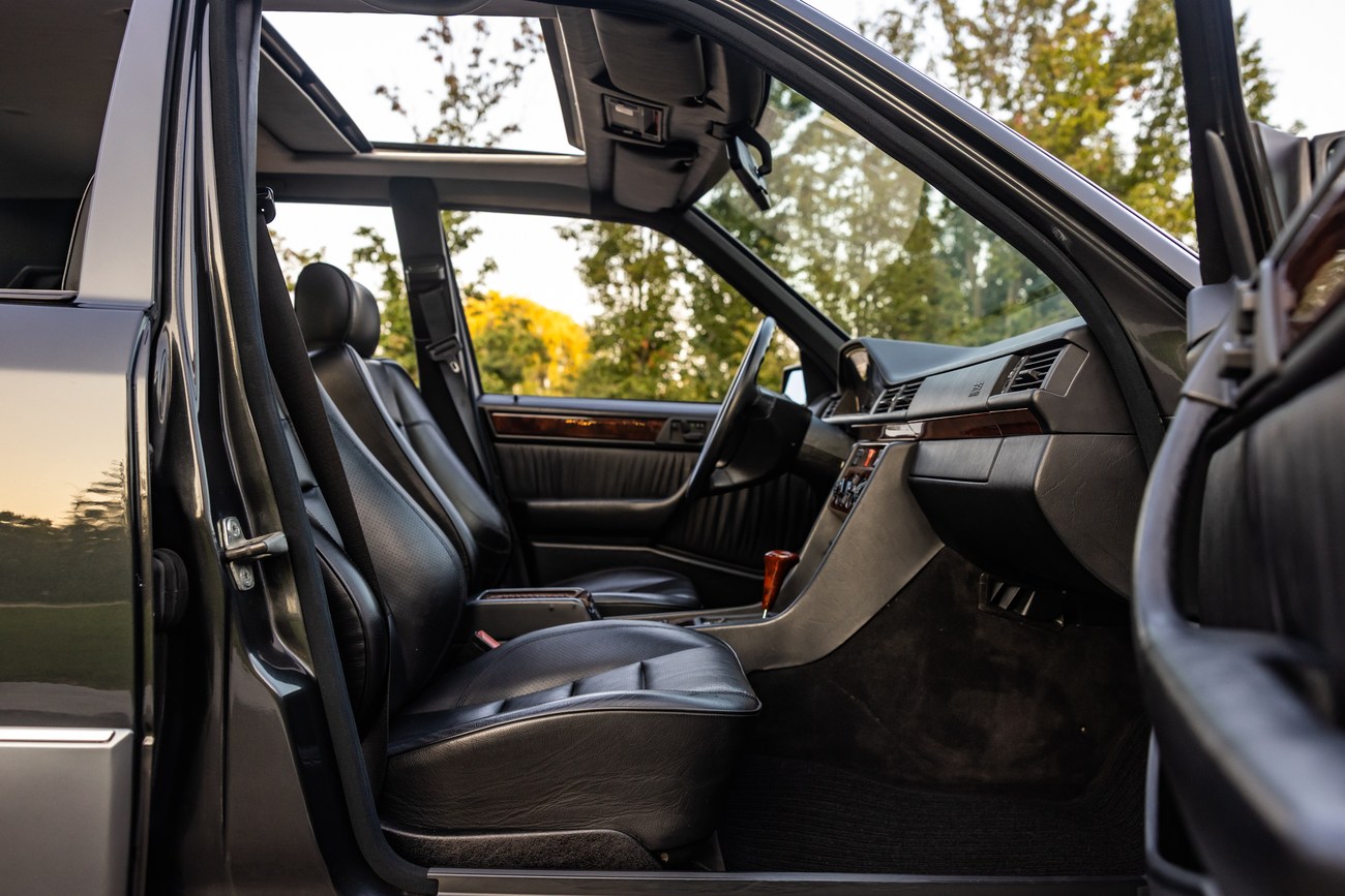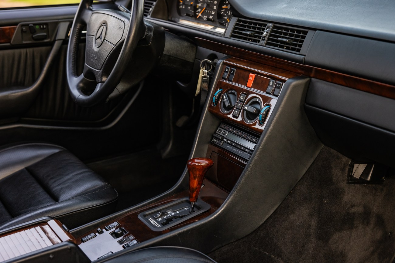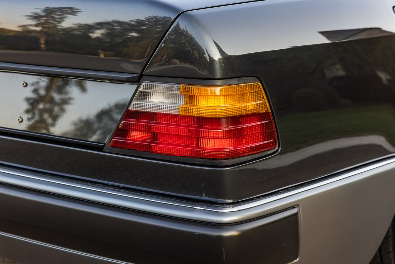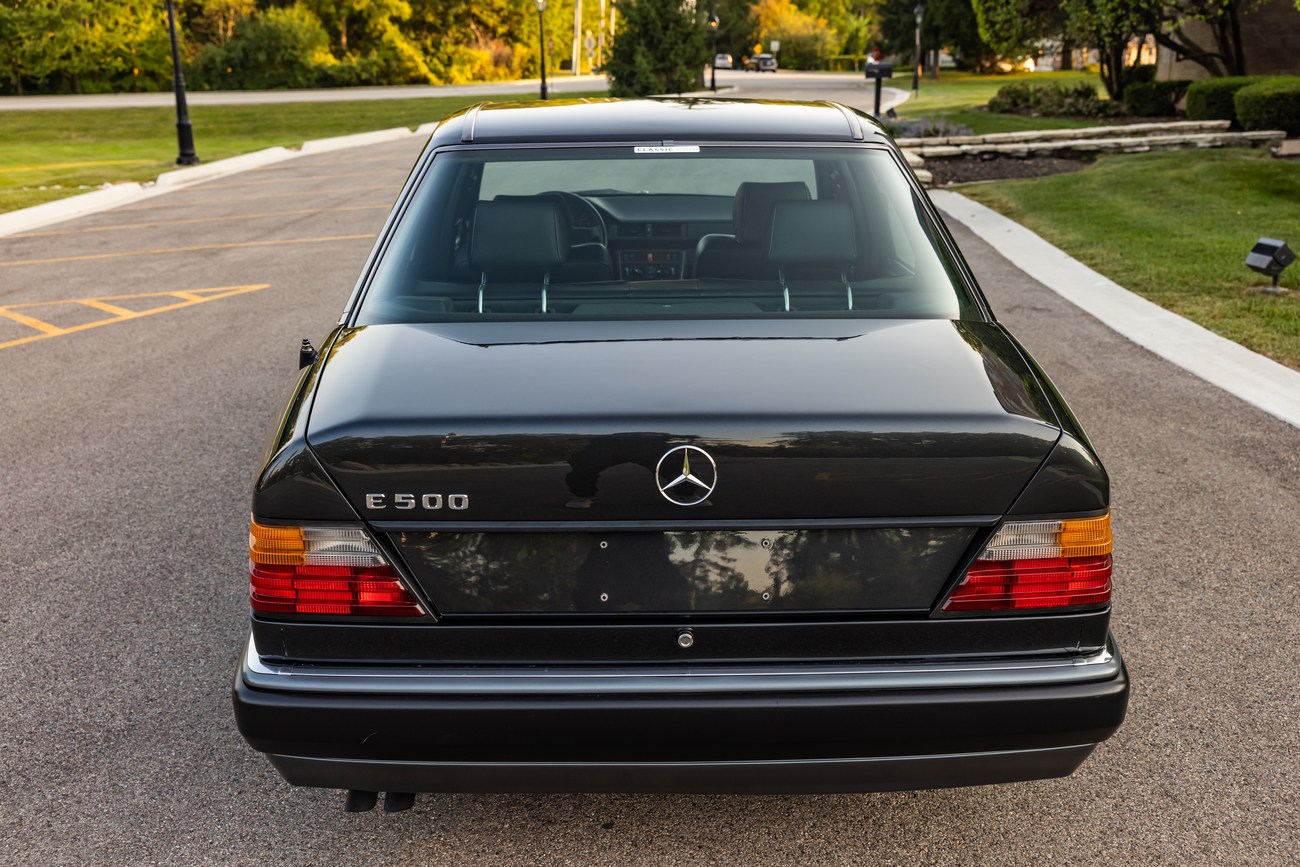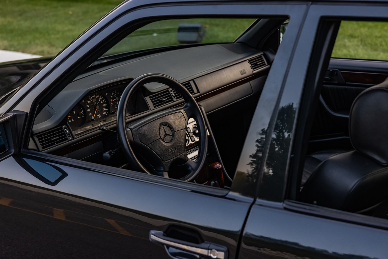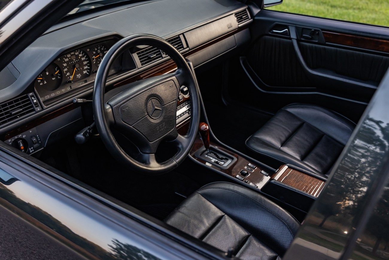 The body is finished in Black Pearl Metallic (199) with grey lower cladding. The 500E was assembled by Porsche and featured wheel arch flares, revised bodywork, and a lower ride height when compared to a standard W124 models. Additional exterior features include original Euro-spec 500E-specific headlights with wipers, integrated fog lights, a retractable antenna, and a power sunroof. The seller notes the lower cladding was refinished and rust repair was performed around the taillights and on the trunk by Michaelian Restoration of Stuart, Florida, in August 2022. The original "500E" badge has been replaced with the updated "E500" lettering on the trunk lid.