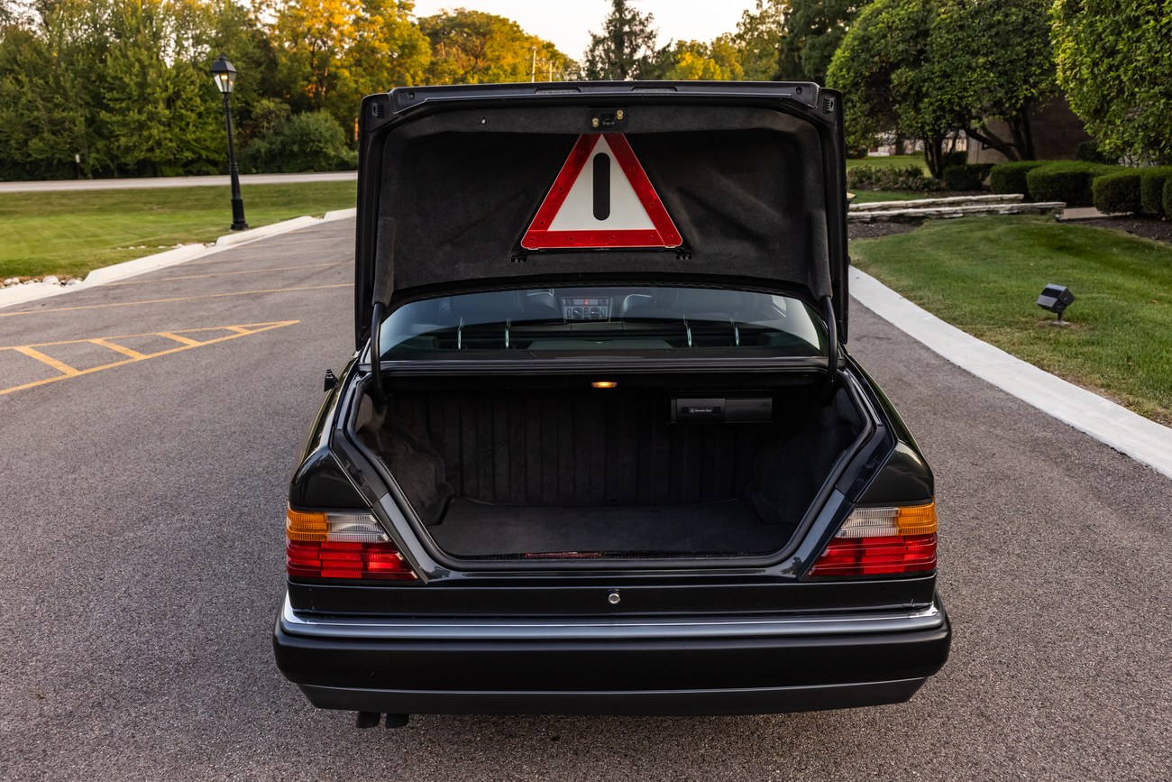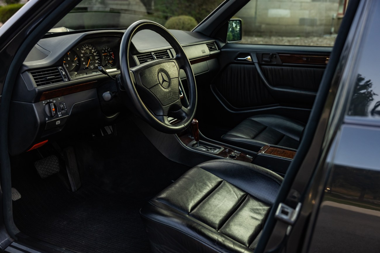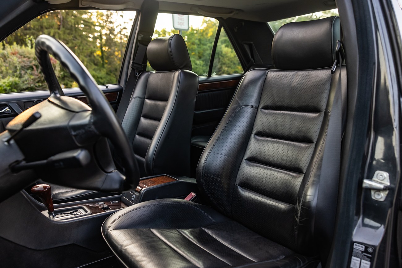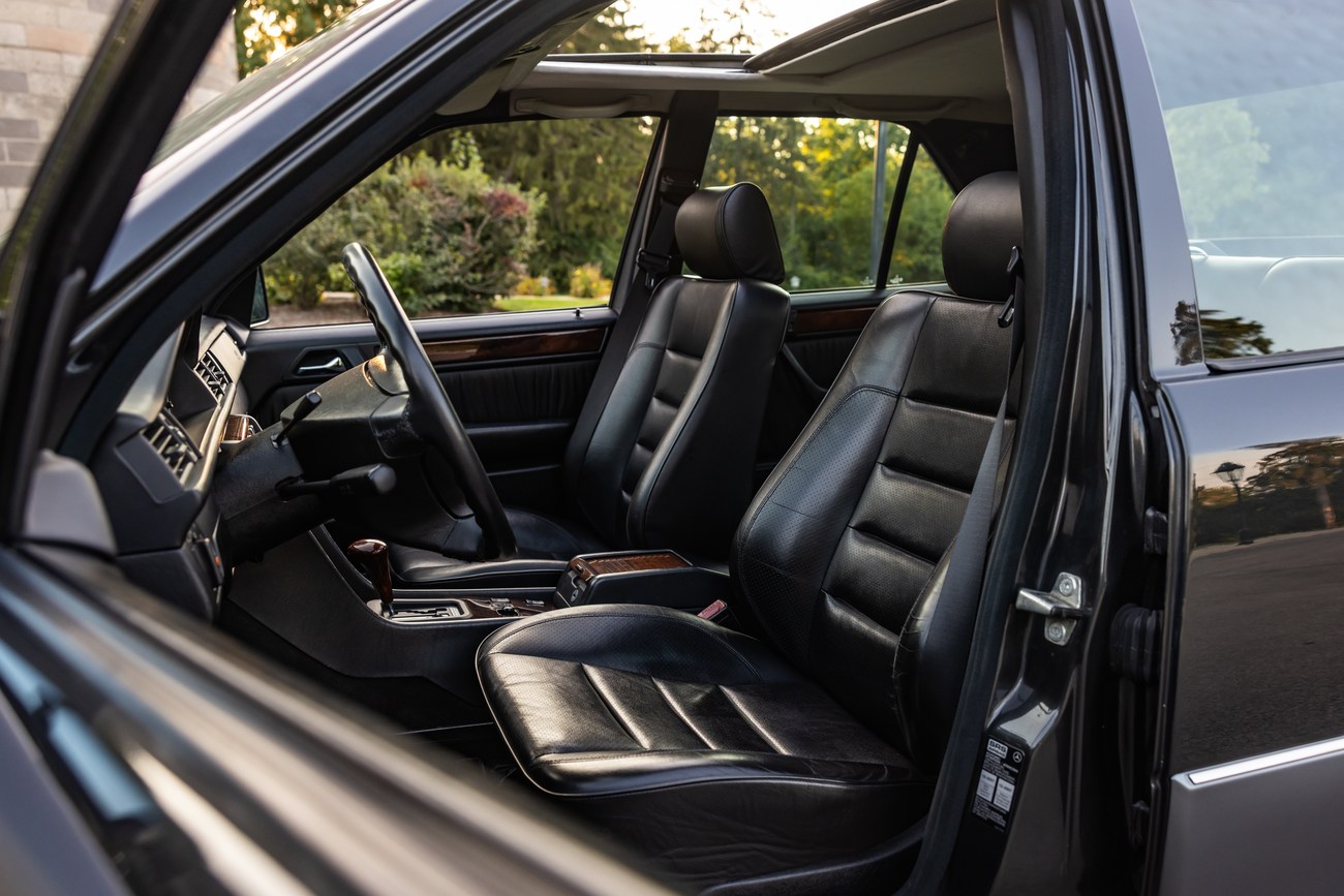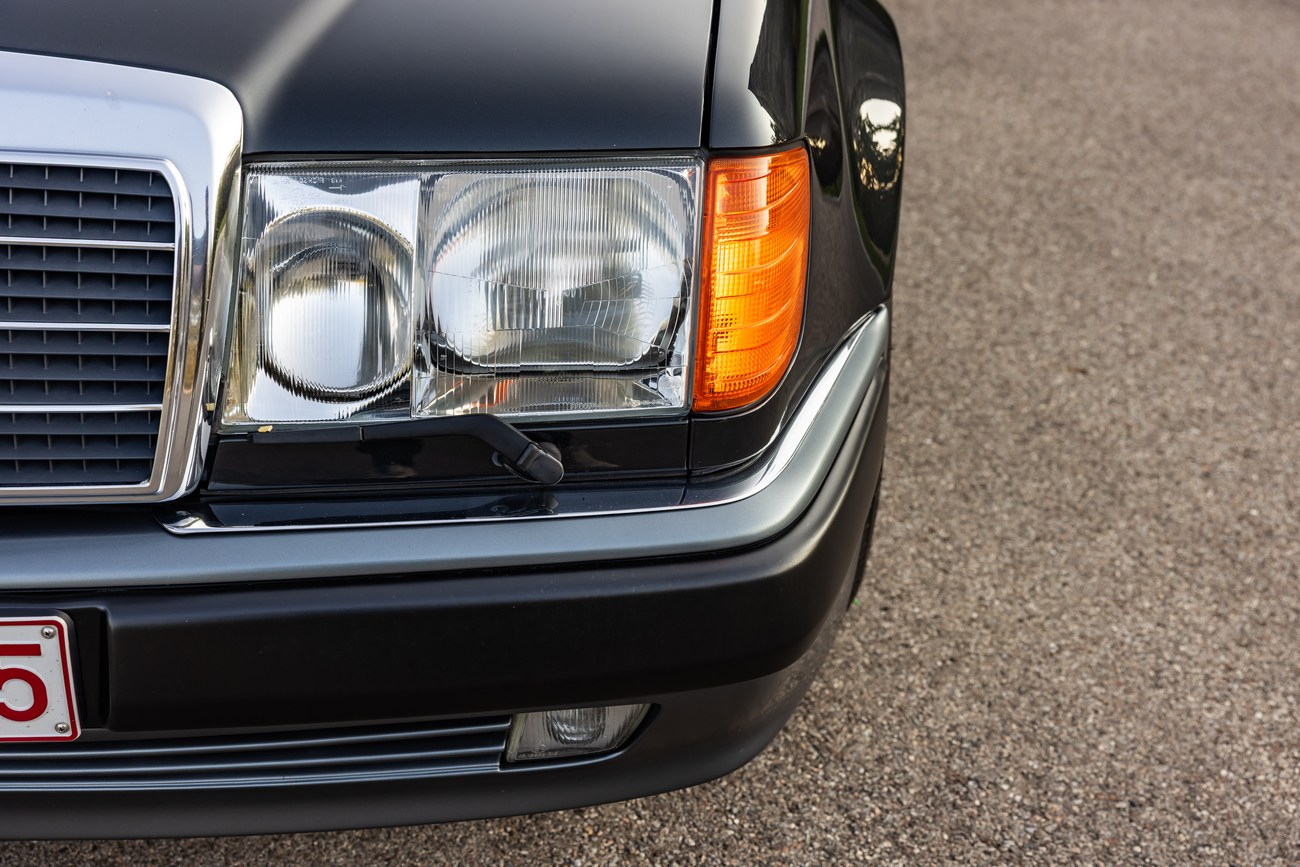 The body is finished in Black Pearl Metallic (199) with grey lower cladding. The 500E was assembled by Porsche and featured wheel arch flares, revised bodywork, and a lower ride height when compared to a standard W124 models. Additional exterior features include original Euro-spec 500E-specific headlights with wipers, integrated fog lights, a retractable antenna, and a power sunroof. The seller notes the lower cladding was refinished and rust repair was performed around the taillights and on the trunk by Michaelian Restoration of Stuart, Florida, in August 2022. The original "500E" badge has been replaced with the updated "E500" lettering on the trunk lid.