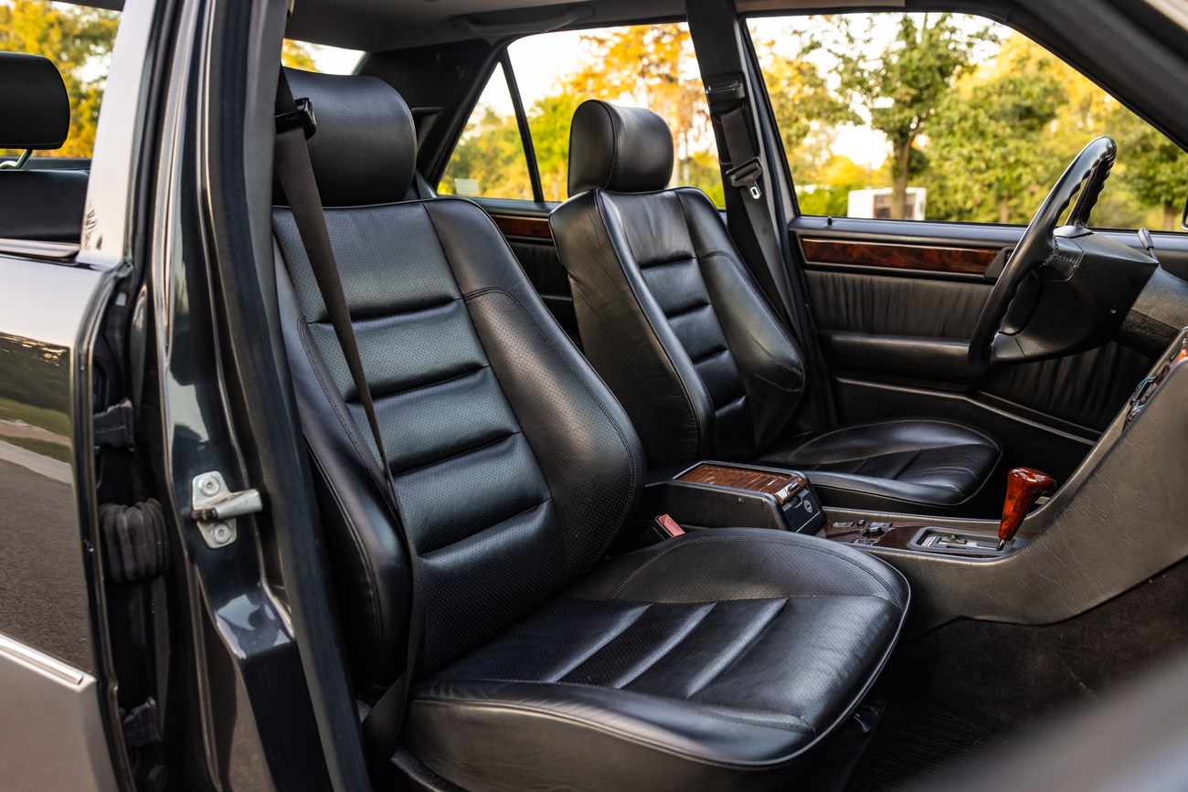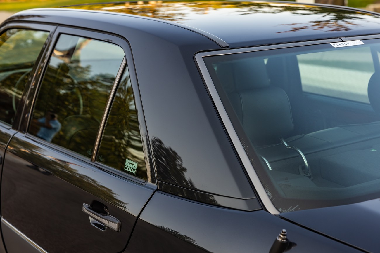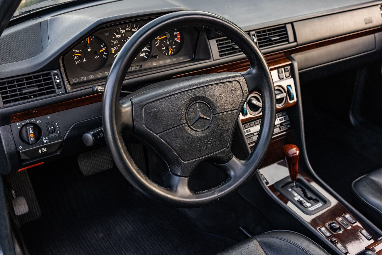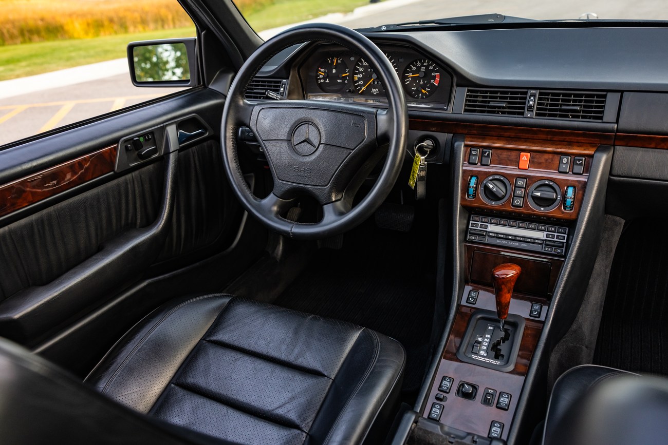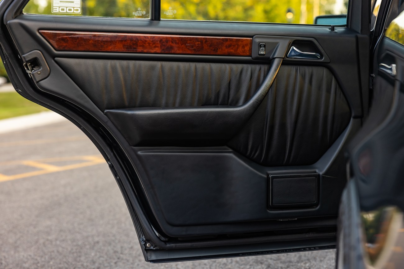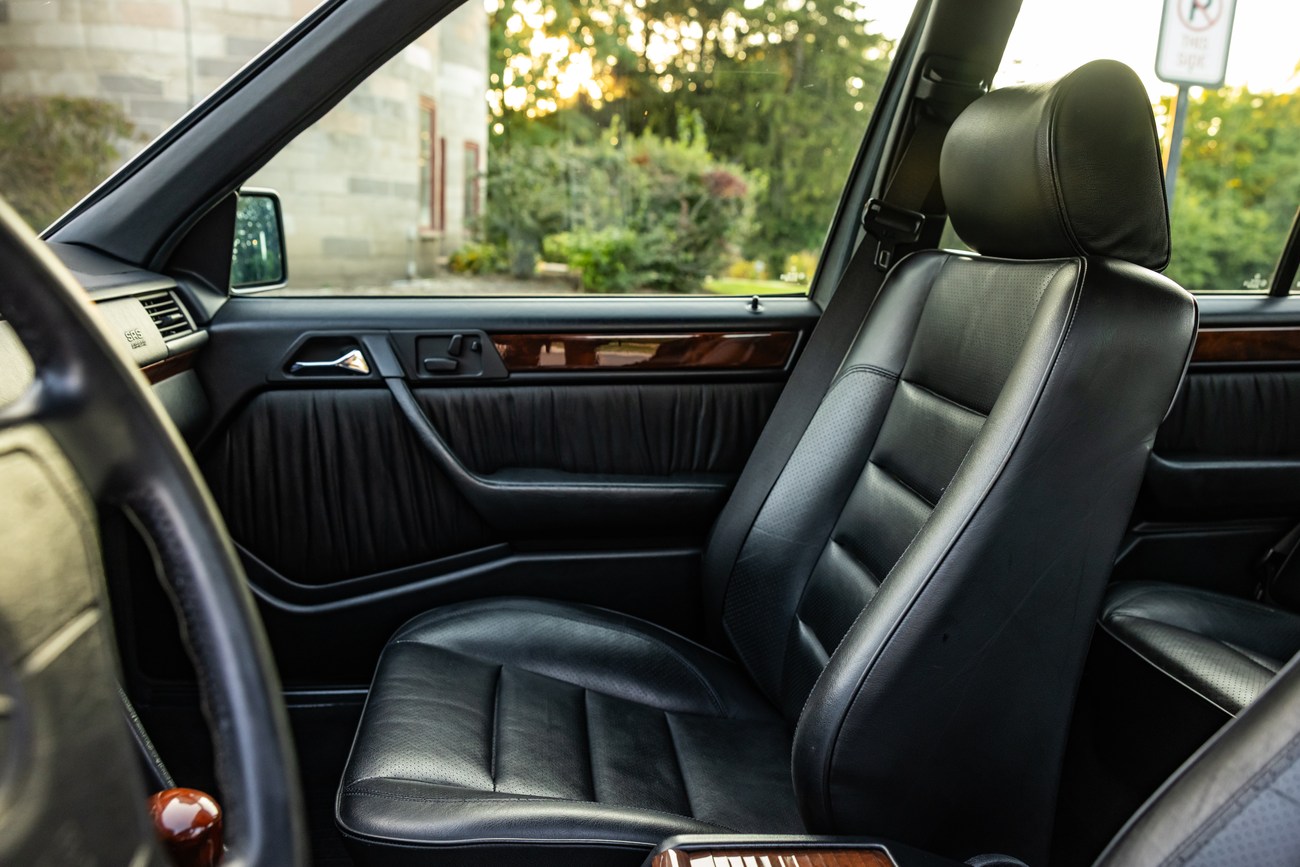 The body is finished in Black Pearl Metallic (199) with grey lower cladding. The 500E was assembled by Porsche and featured wheel arch flares, revised bodywork, and a lower ride height when compared to a standard W124 models. Additional exterior features include original Euro-spec 500E-specific headlights with wipers, integrated fog lights, a retractable antenna, and a power sunroof. The seller notes the lower cladding was refinished and rust repair was performed around the taillights and on the trunk by Michaelian Restoration of Stuart, Florida, in August 2022. The original "500E" badge has been replaced with the updated "E500" lettering on the trunk lid.