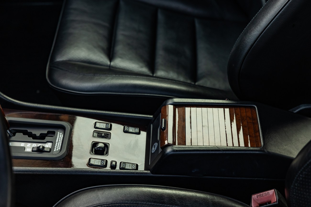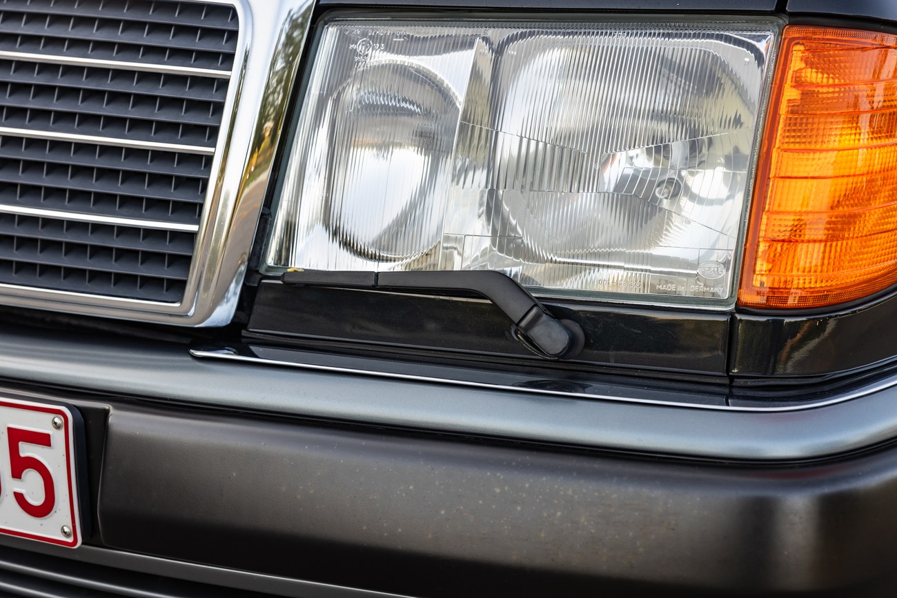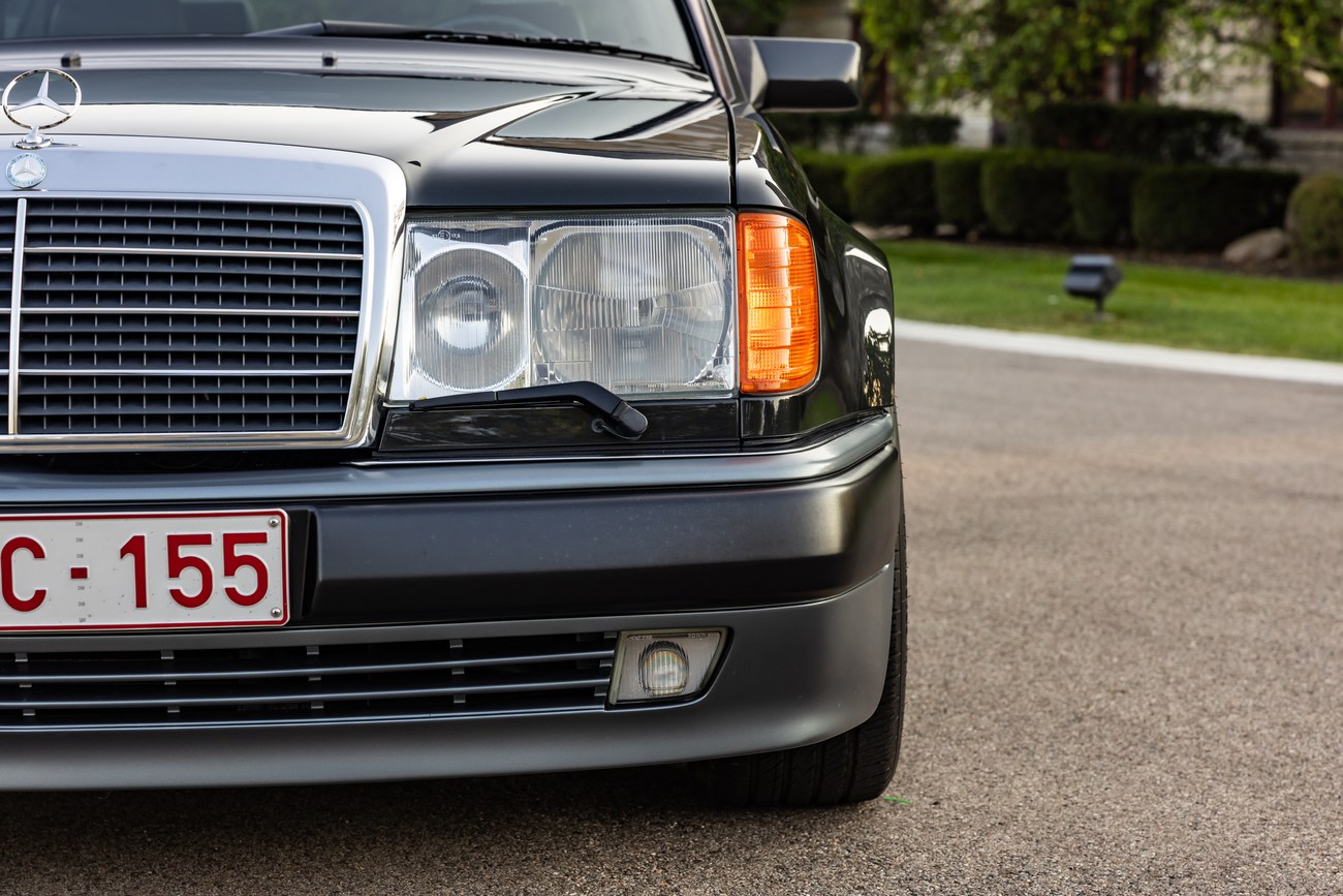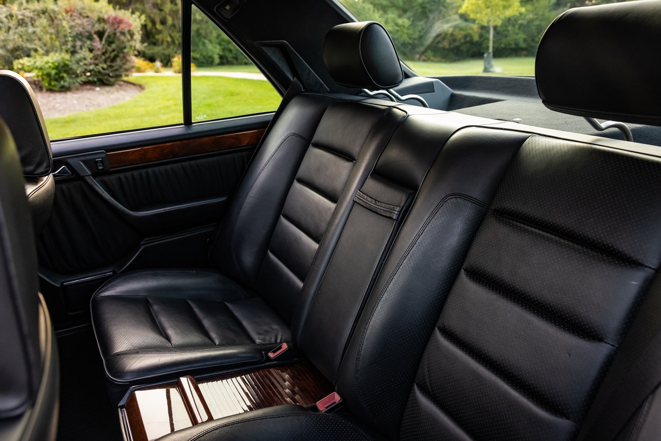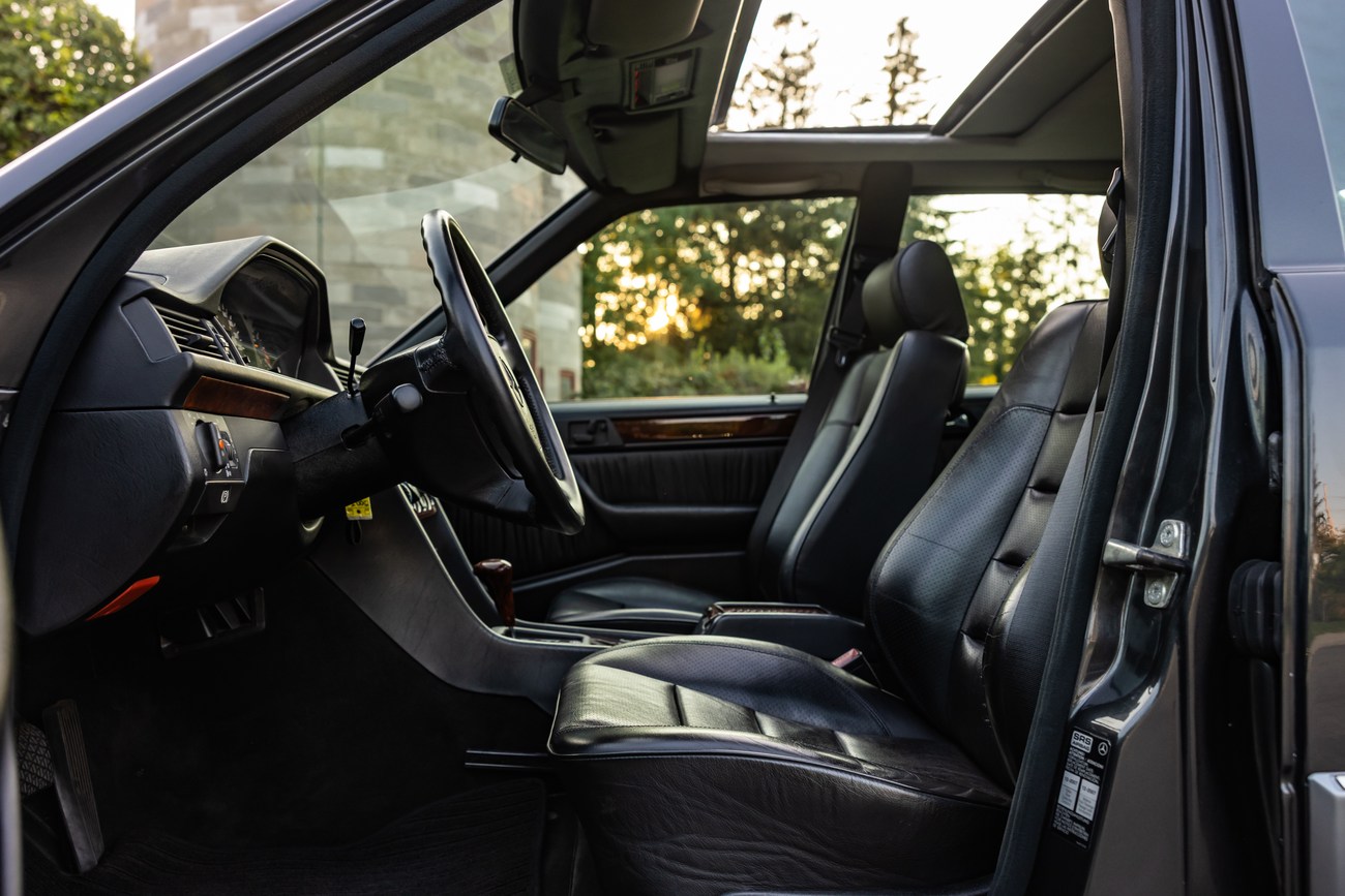 The body is finished in Black Pearl Metallic (199) with grey lower cladding. The 500E was assembled by Porsche and featured wheel arch flares, revised bodywork, and a lower ride height when compared to a standard W124 models. Additional exterior features include original Euro-spec 500E-specific headlights with wipers, integrated fog lights, a retractable antenna, and a power sunroof. The seller notes the lower cladding was refinished and rust repair was performed around the taillights and on the trunk by Michaelian Restoration of Stuart, Florida, in August 2022. The original "500E" badge has been replaced with the updated "E500" lettering on the trunk lid.