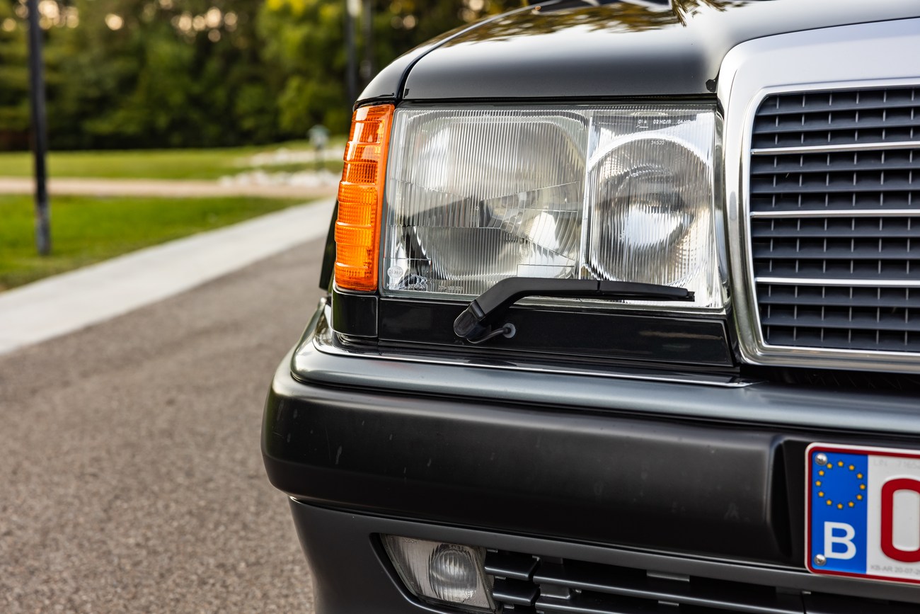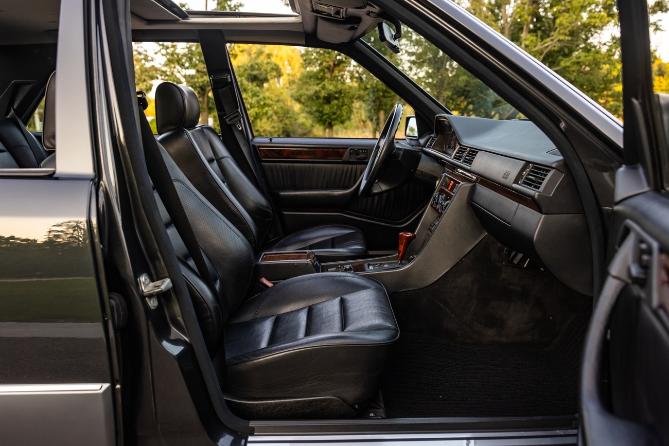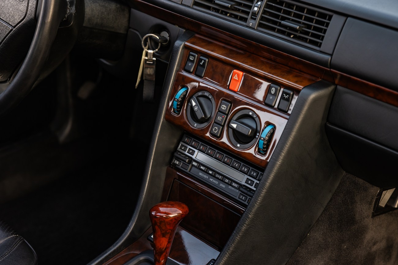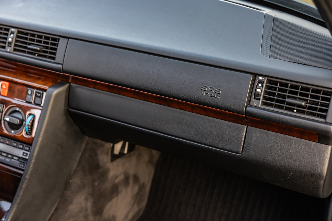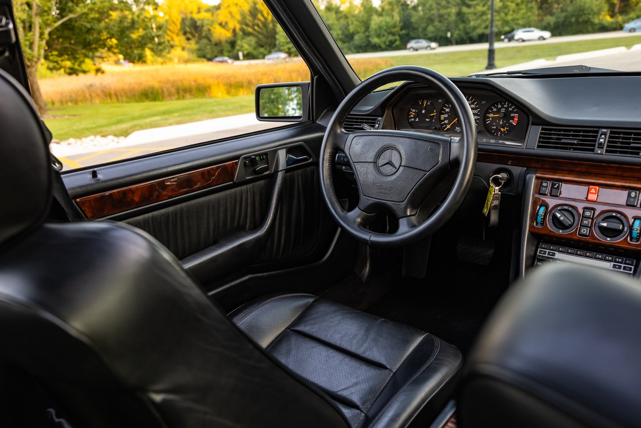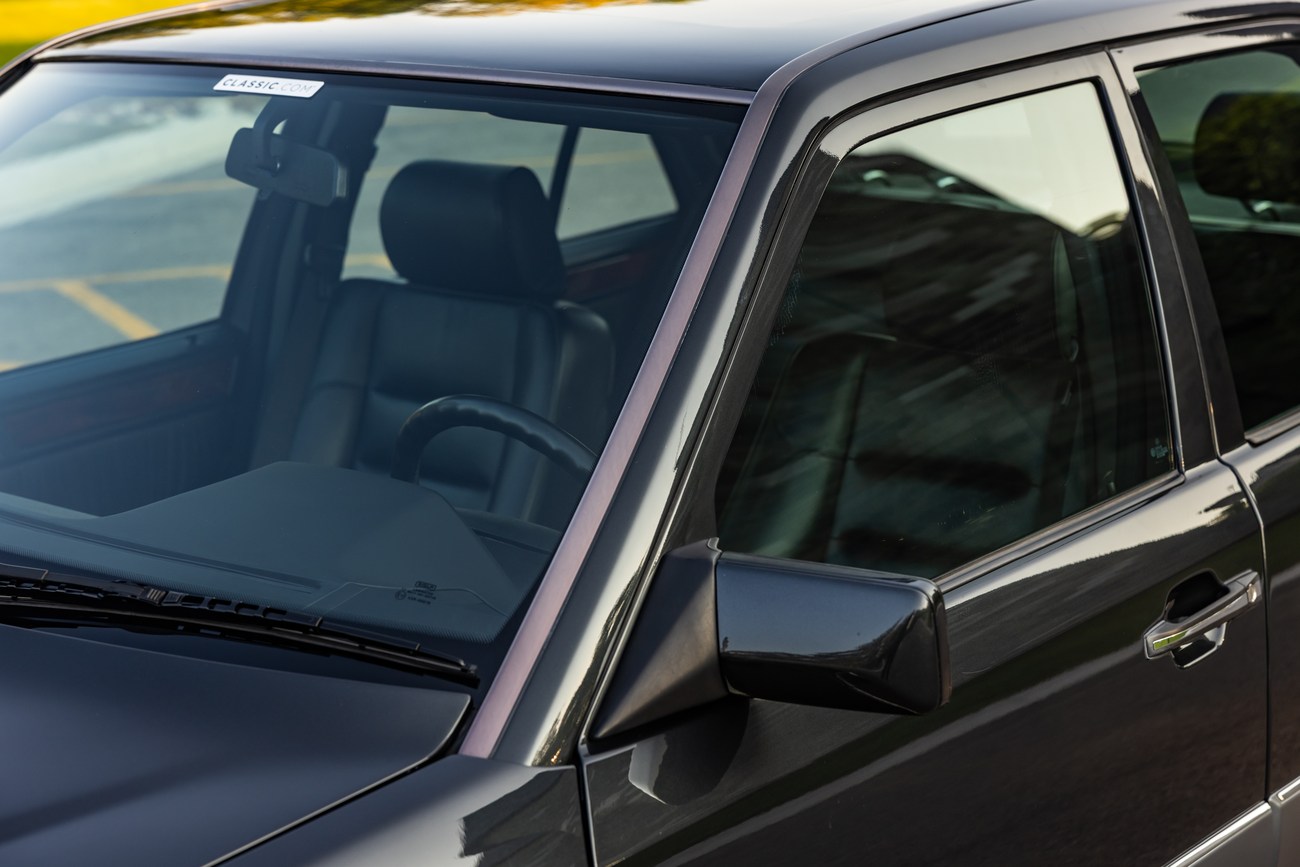 The body is finished in Black Pearl Metallic (199) with grey lower cladding. The 500E was assembled by Porsche and featured wheel arch flares, revised bodywork, and a lower ride height when compared to a standard W124 models. Additional exterior features include original Euro-spec 500E-specific headlights with wipers, integrated fog lights, a retractable antenna, and a power sunroof. The seller notes the lower cladding was refinished and rust repair was performed around the taillights and on the trunk by Michaelian Restoration of Stuart, Florida, in August 2022. The original "500E" badge has been replaced with the updated "E500" lettering on the trunk lid.