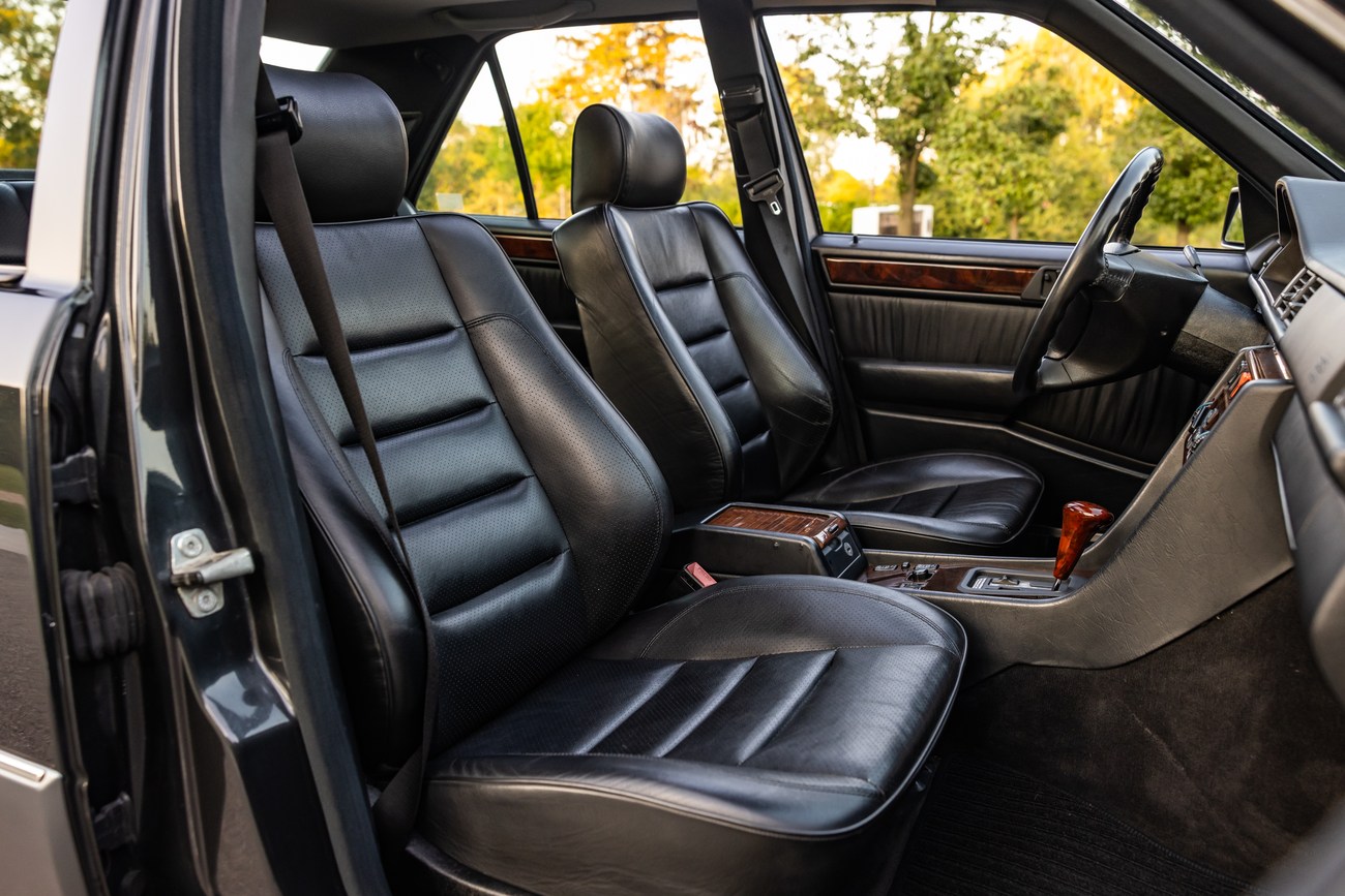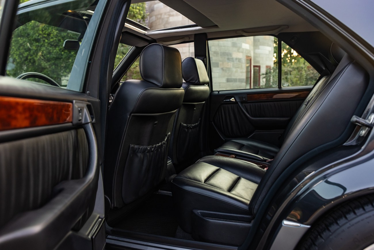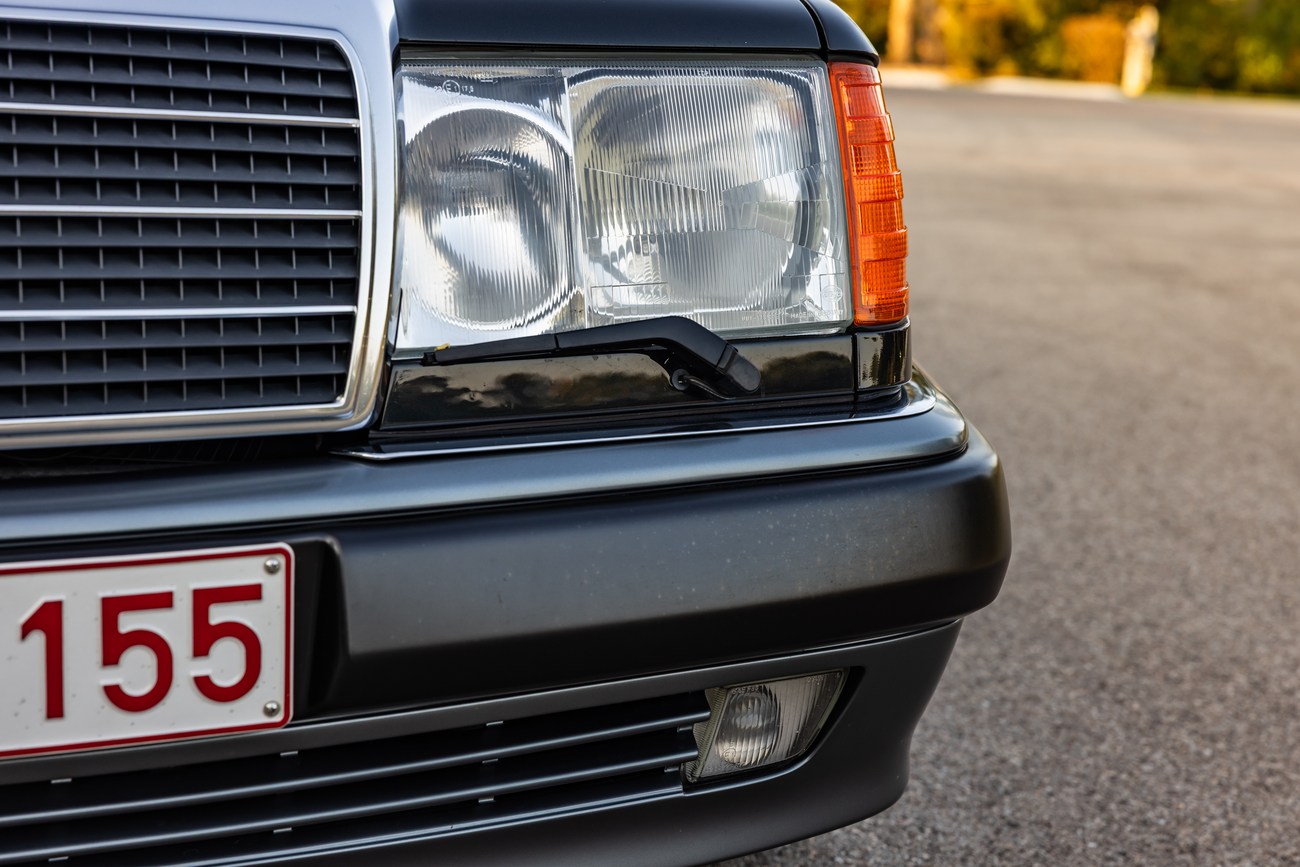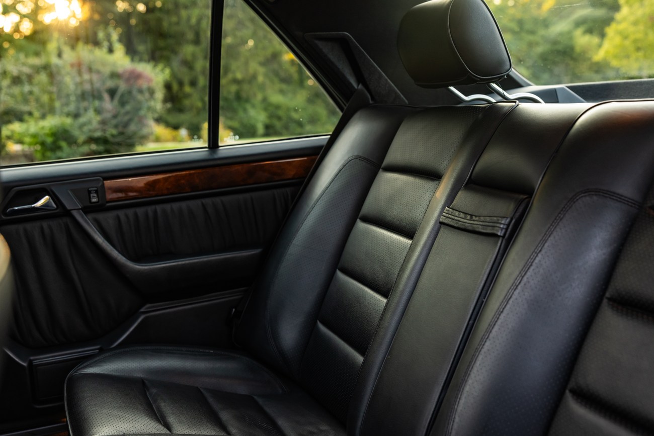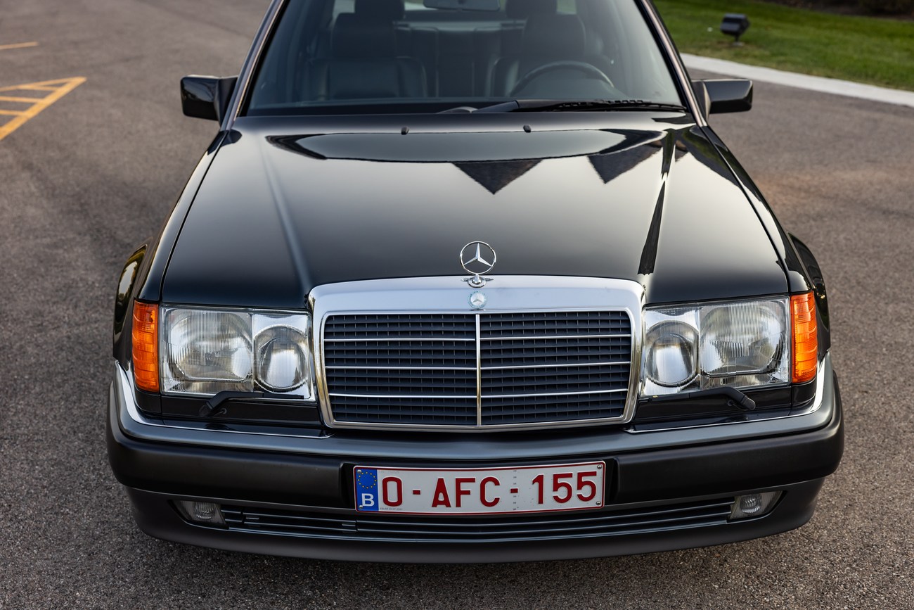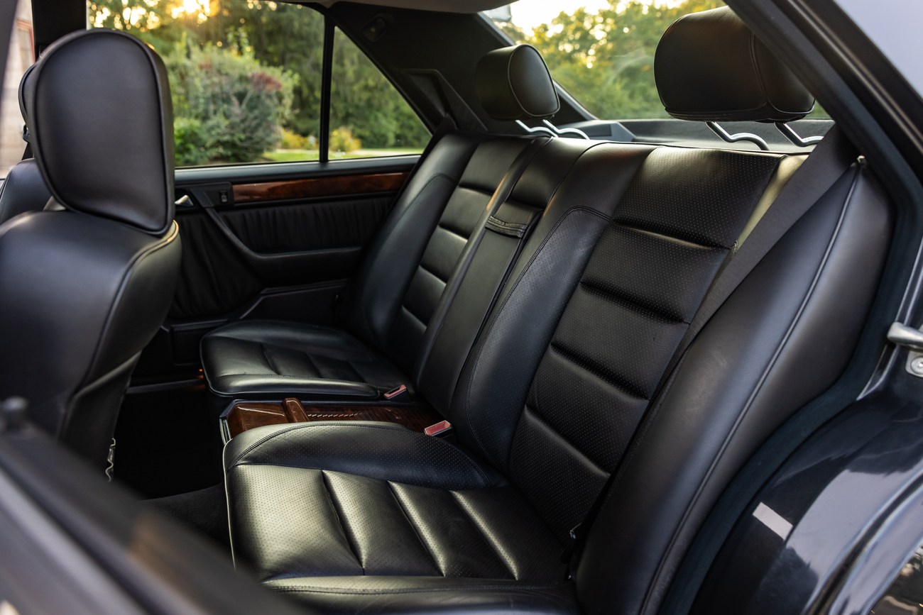 The body is finished in Black Pearl Metallic (199) with grey lower cladding. The 500E was assembled by Porsche and featured wheel arch flares, revised bodywork, and a lower ride height when compared to a standard W124 models. Additional exterior features include original Euro-spec 500E-specific headlights with wipers, integrated fog lights, a retractable antenna, and a power sunroof. The seller notes the lower cladding was refinished and rust repair was performed around the taillights and on the trunk by Michaelian Restoration of Stuart, Florida, in August 2022. The original "500E" badge has been replaced with the updated "E500" lettering on the trunk lid.