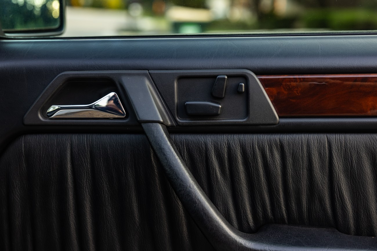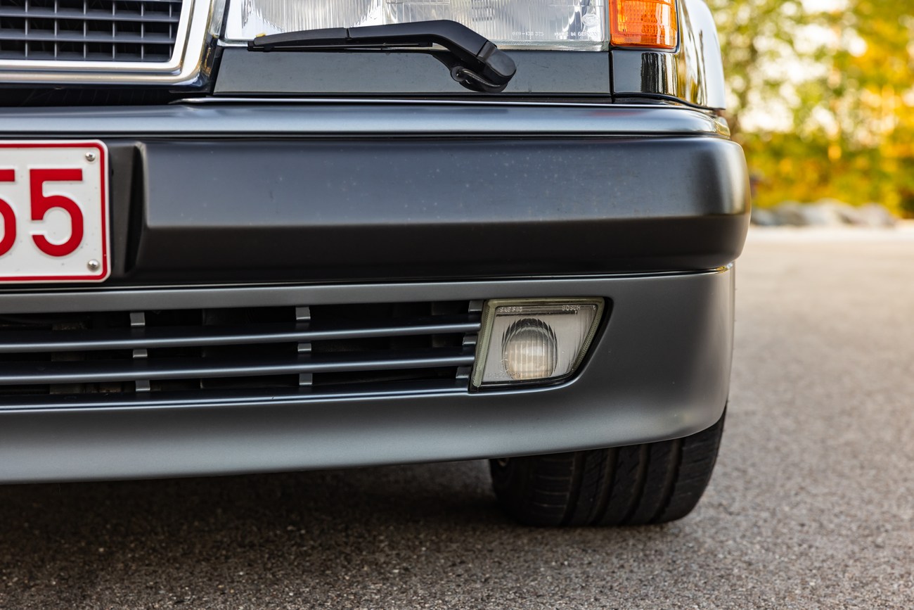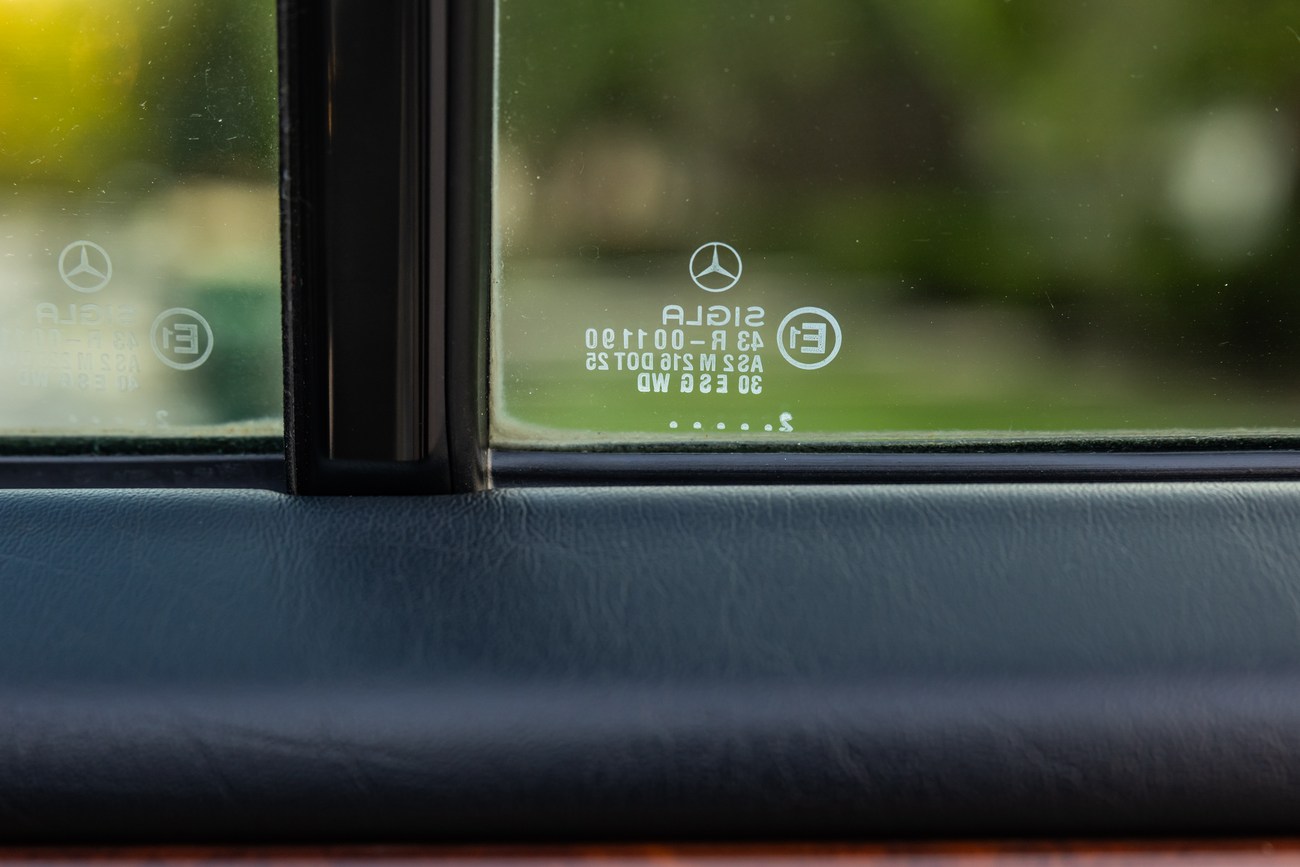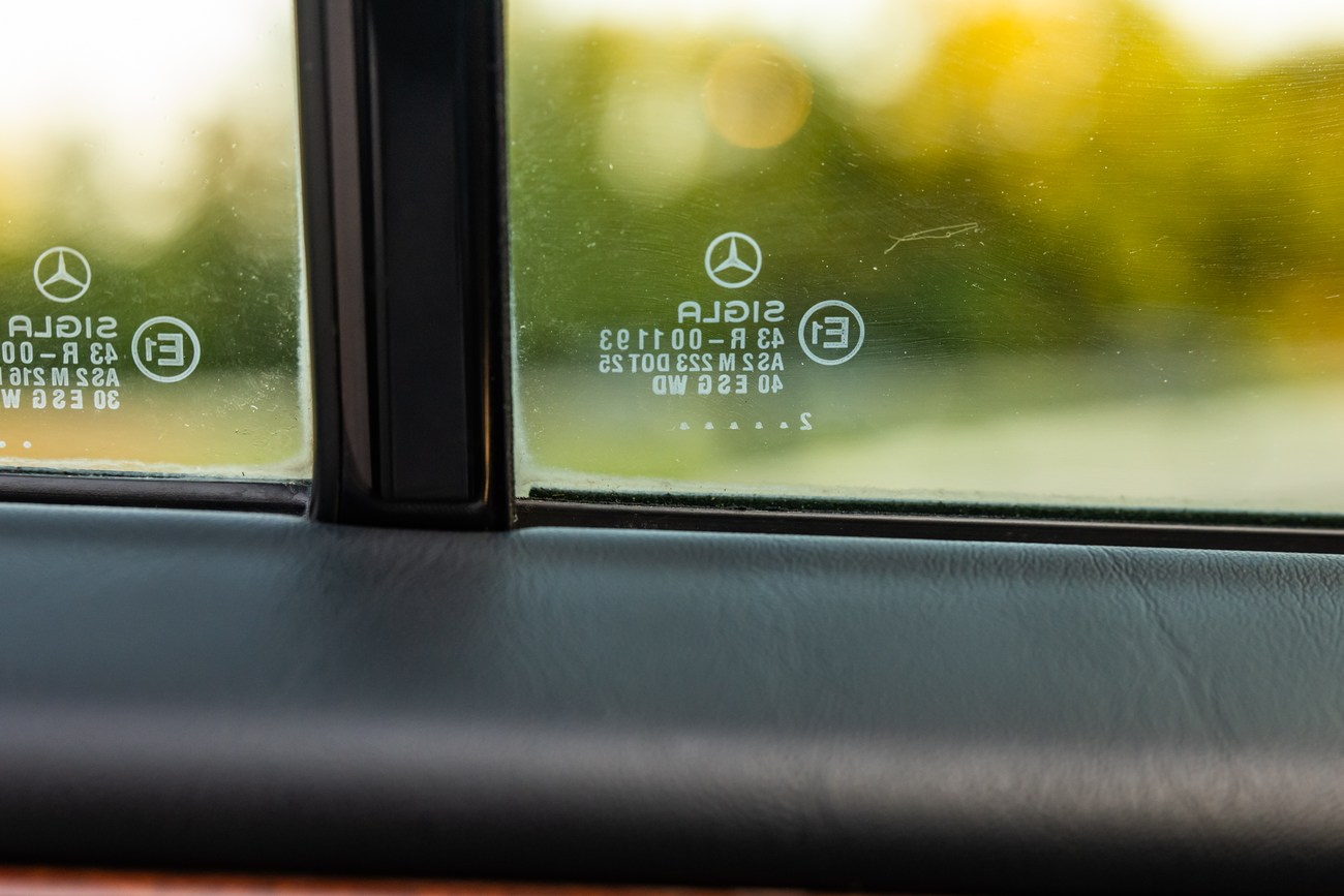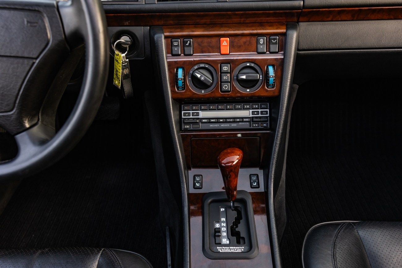 The body is finished in Black Pearl Metallic (199) with grey lower cladding. The 500E was assembled by Porsche and featured wheel arch flares, revised bodywork, and a lower ride height when compared to a standard W124 models. Additional exterior features include original Euro-spec 500E-specific headlights with wipers, integrated fog lights, a retractable antenna, and a power sunroof. The seller notes the lower cladding was refinished and rust repair was performed around the taillights and on the trunk by Michaelian Restoration of Stuart, Florida, in August 2022. The original "500E" badge has been replaced with the updated "E500" lettering on the trunk lid.
