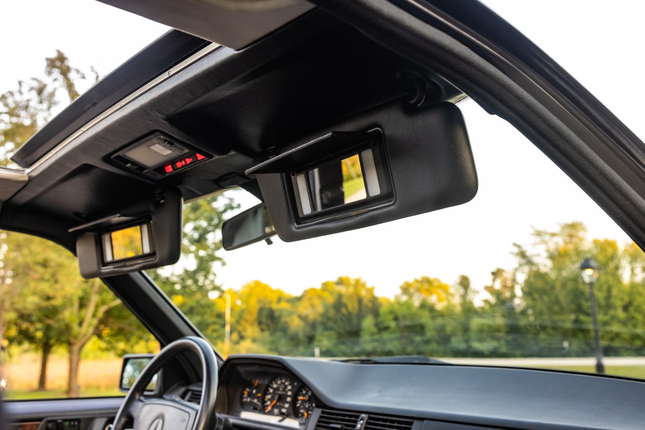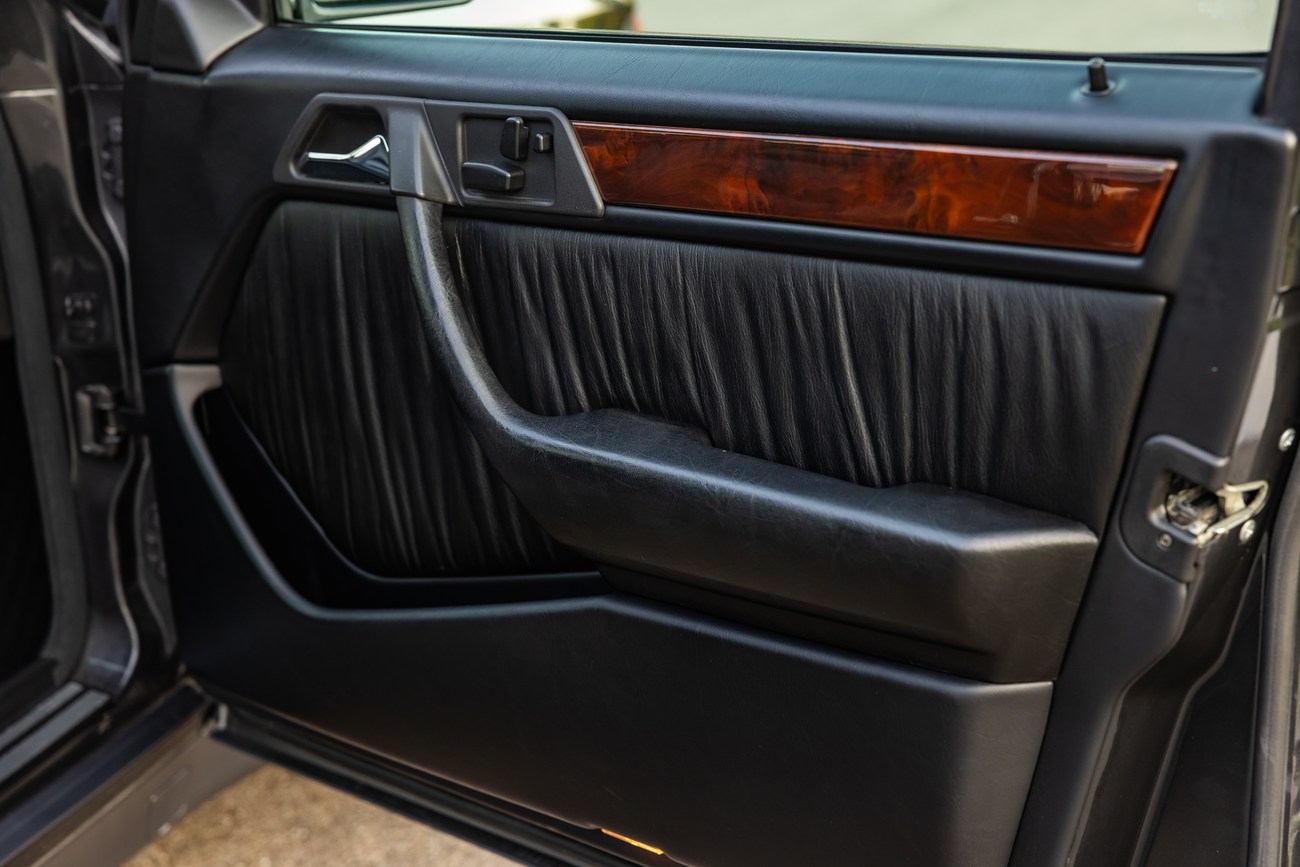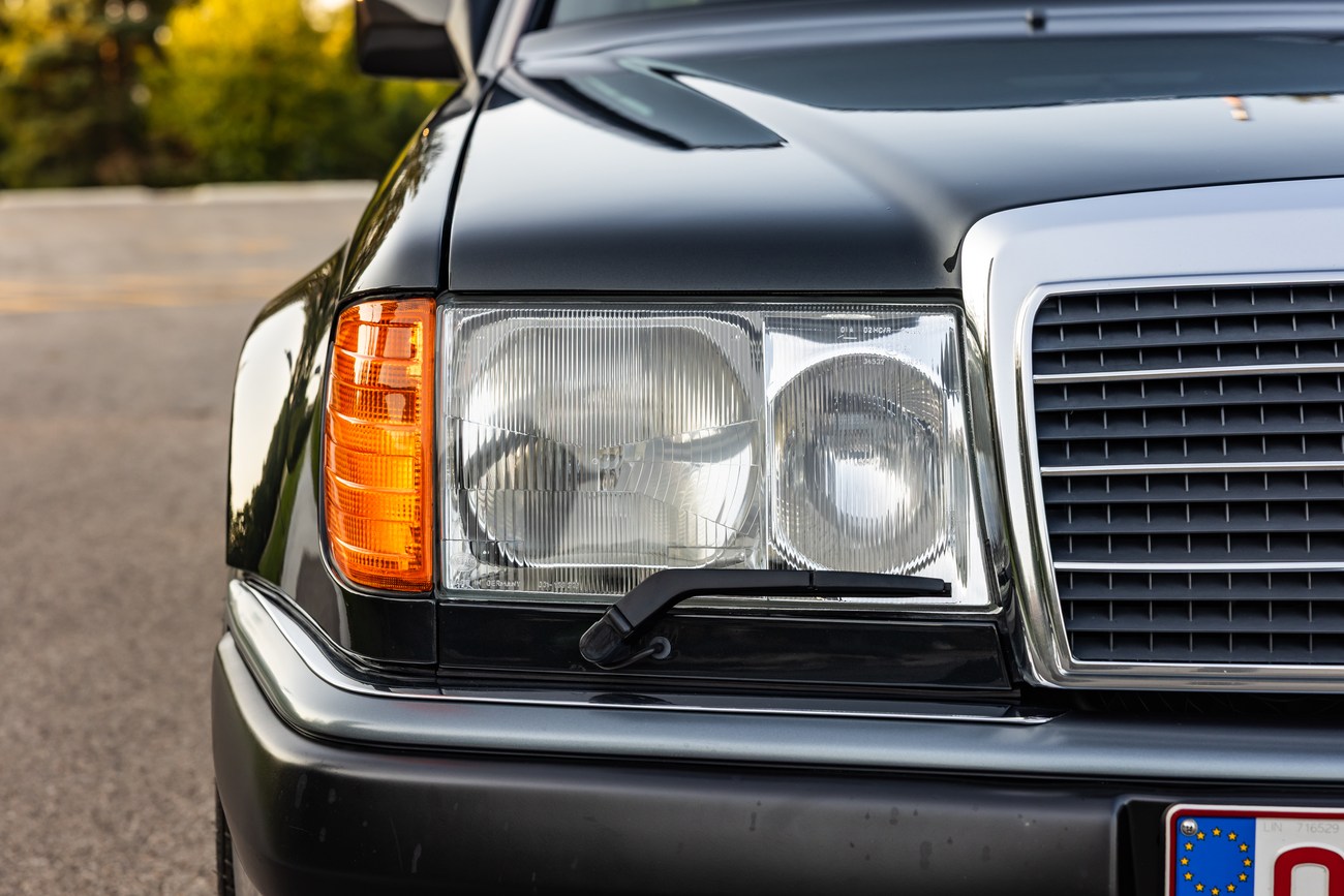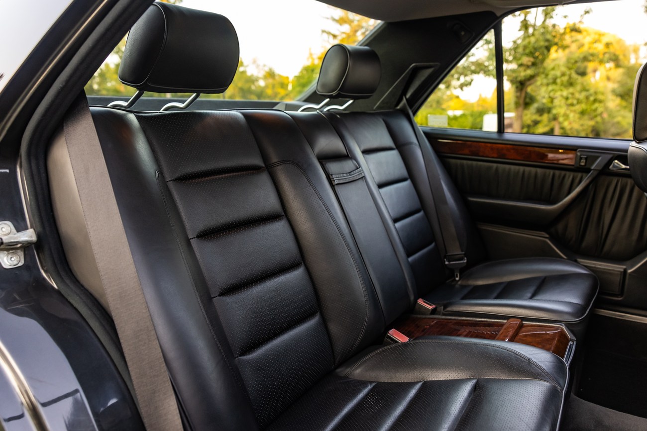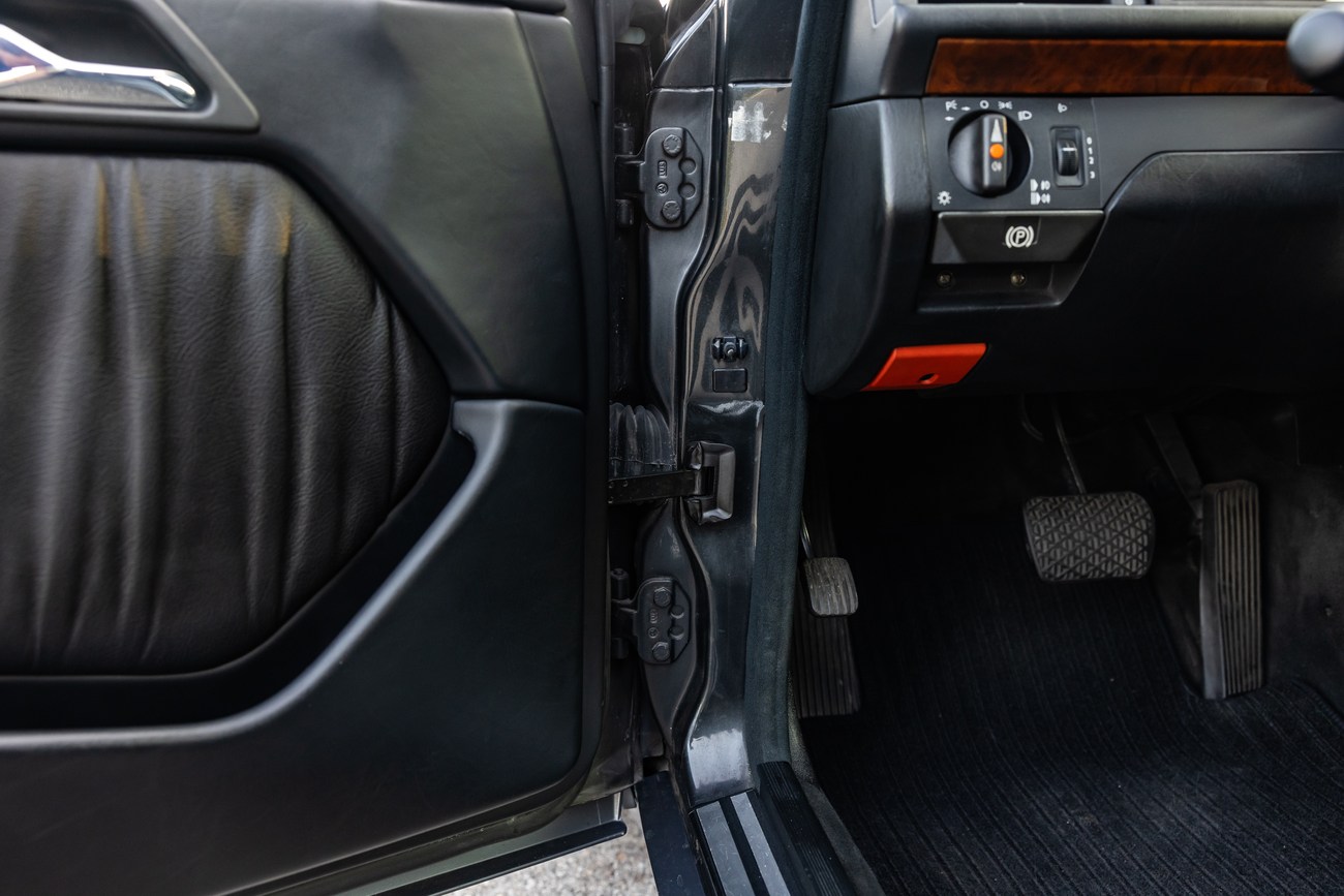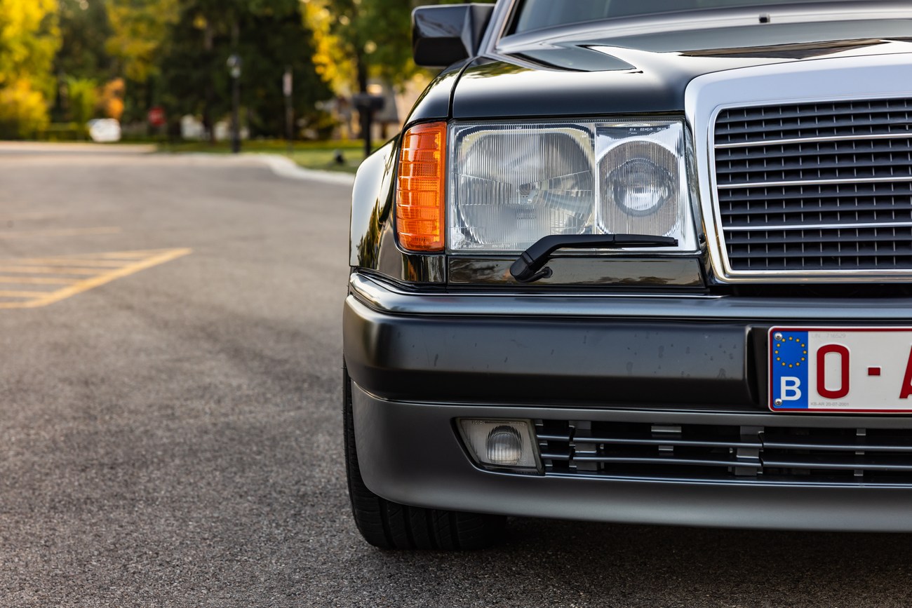 The body is finished in Black Pearl Metallic (199) with grey lower cladding. The 500E was assembled by Porsche and featured wheel arch flares, revised bodywork, and a lower ride height when compared to a standard W124 models. Additional exterior features include original Euro-spec 500E-specific headlights with wipers, integrated fog lights, a retractable antenna, and a power sunroof. The seller notes the lower cladding was refinished and rust repair was performed around the taillights and on the trunk by Michaelian Restoration of Stuart, Florida, in August 2022. The original "500E" badge has been replaced with the updated "E500" lettering on the trunk lid.