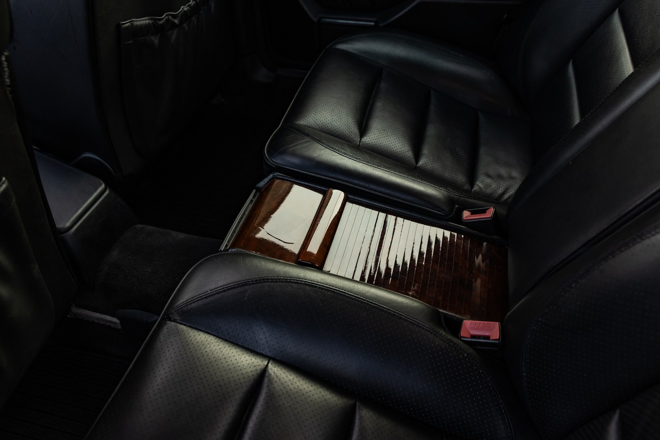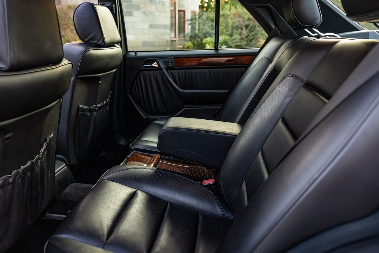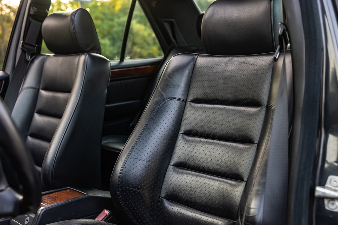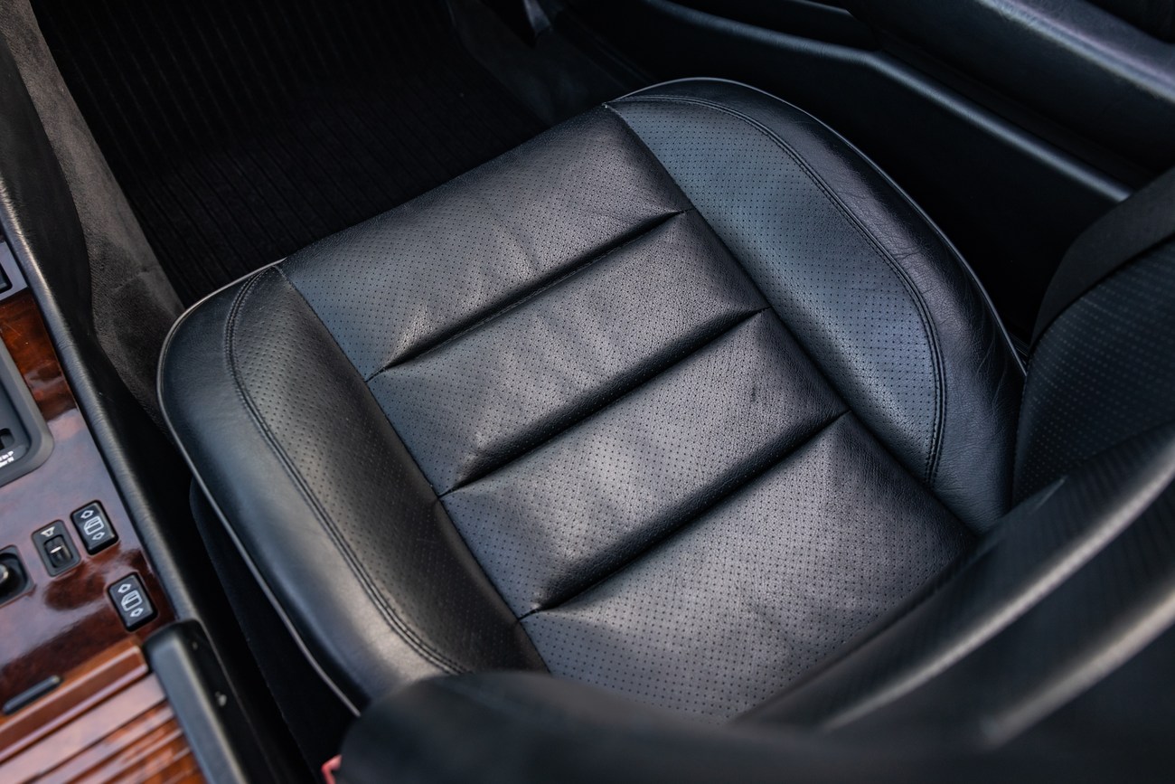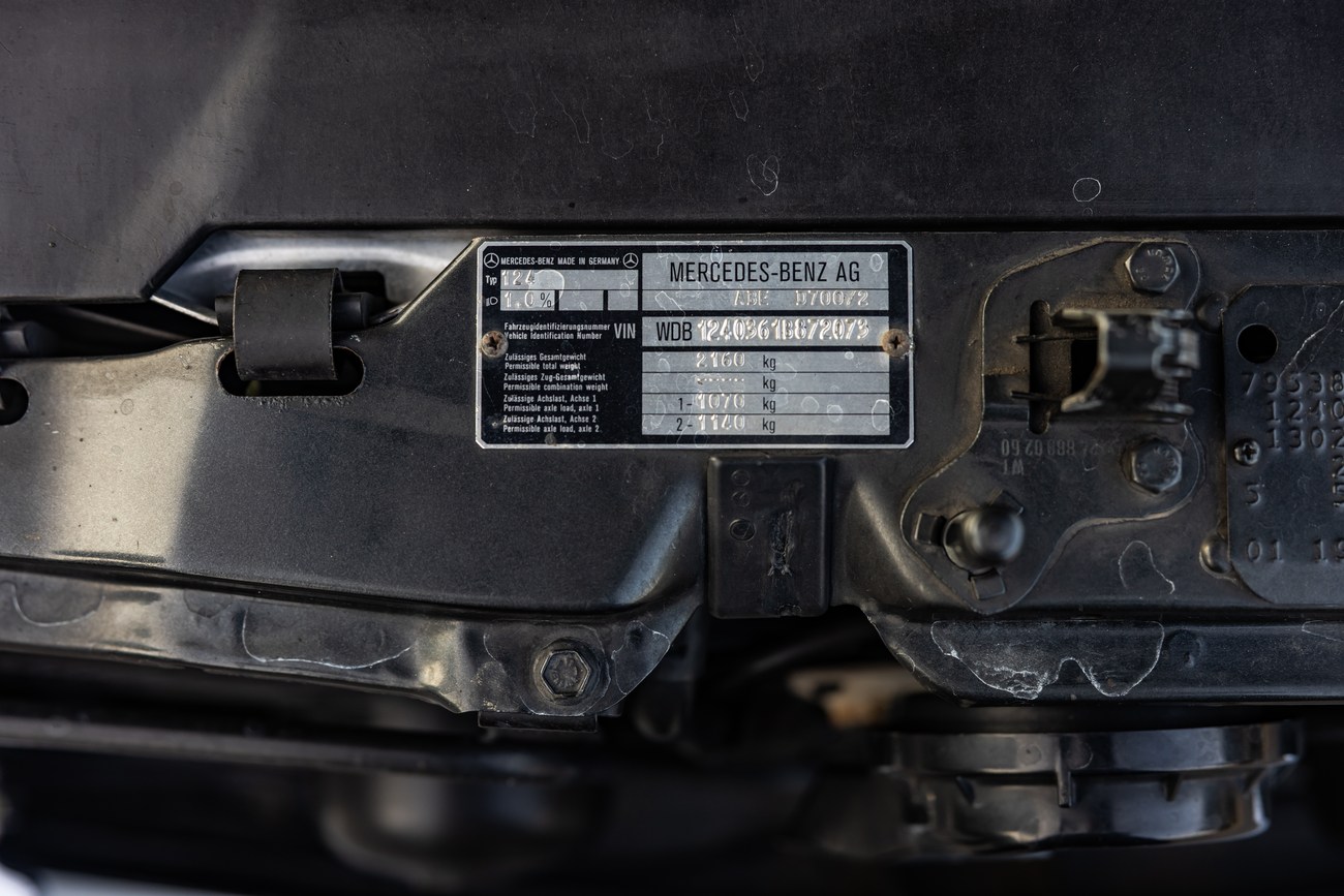 The body is finished in Black Pearl Metallic (199) with grey lower cladding. The 500E was assembled by Porsche and featured wheel arch flares, revised bodywork, and a lower ride height when compared to a standard W124 models. Additional exterior features include original Euro-spec 500E-specific headlights with wipers, integrated fog lights, a retractable antenna, and a power sunroof. The seller notes the lower cladding was refinished and rust repair was performed around the taillights and on the trunk by Michaelian Restoration of Stuart, Florida, in August 2022. The original "500E" badge has been replaced with the updated "E500" lettering on the trunk lid.