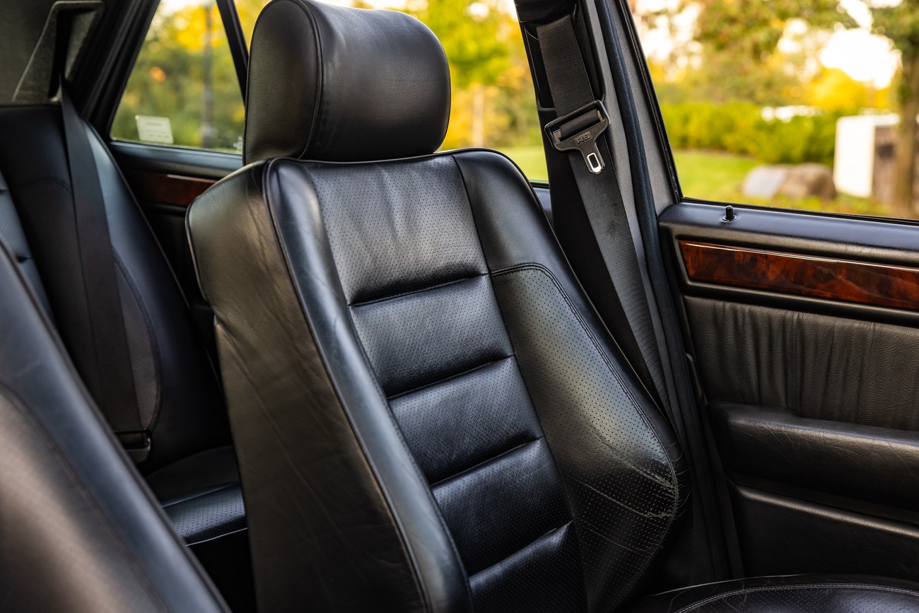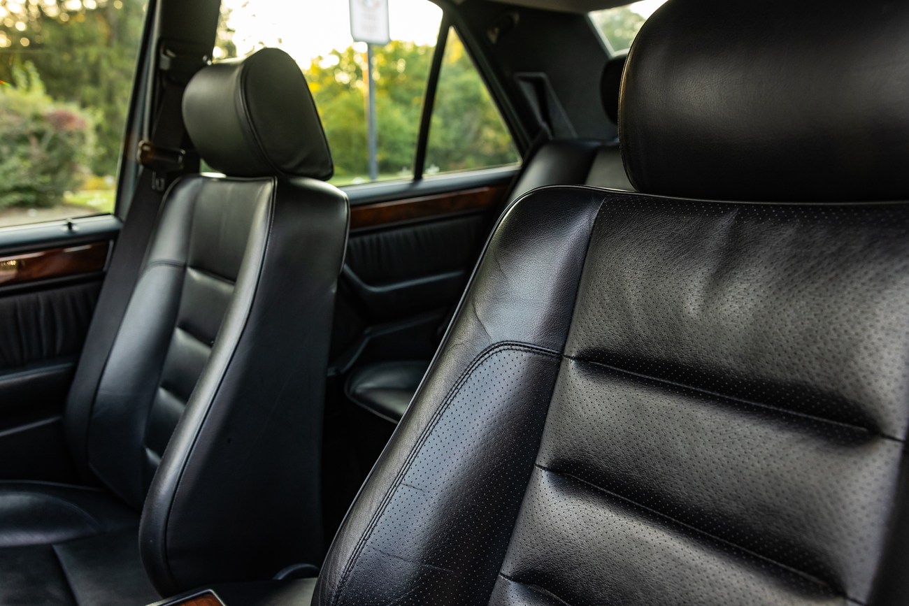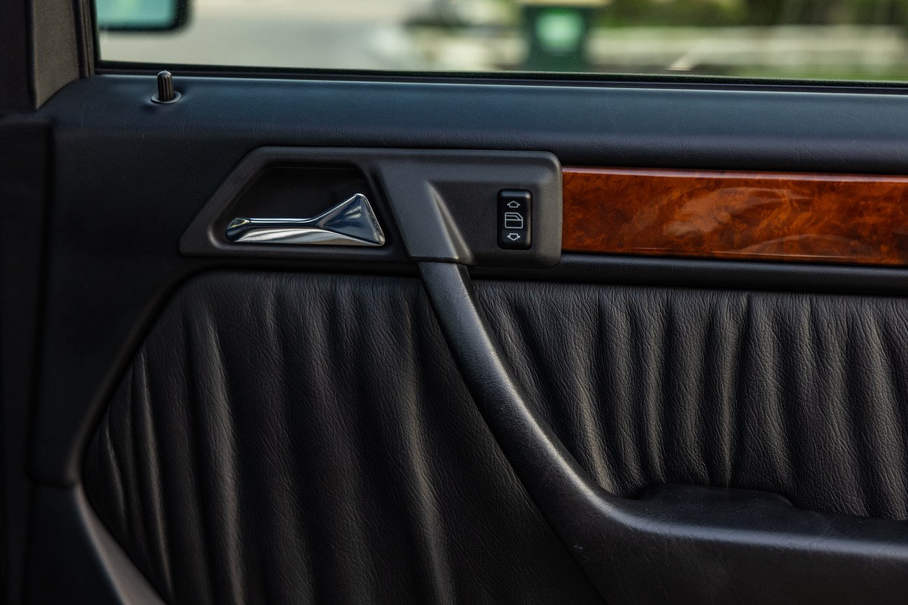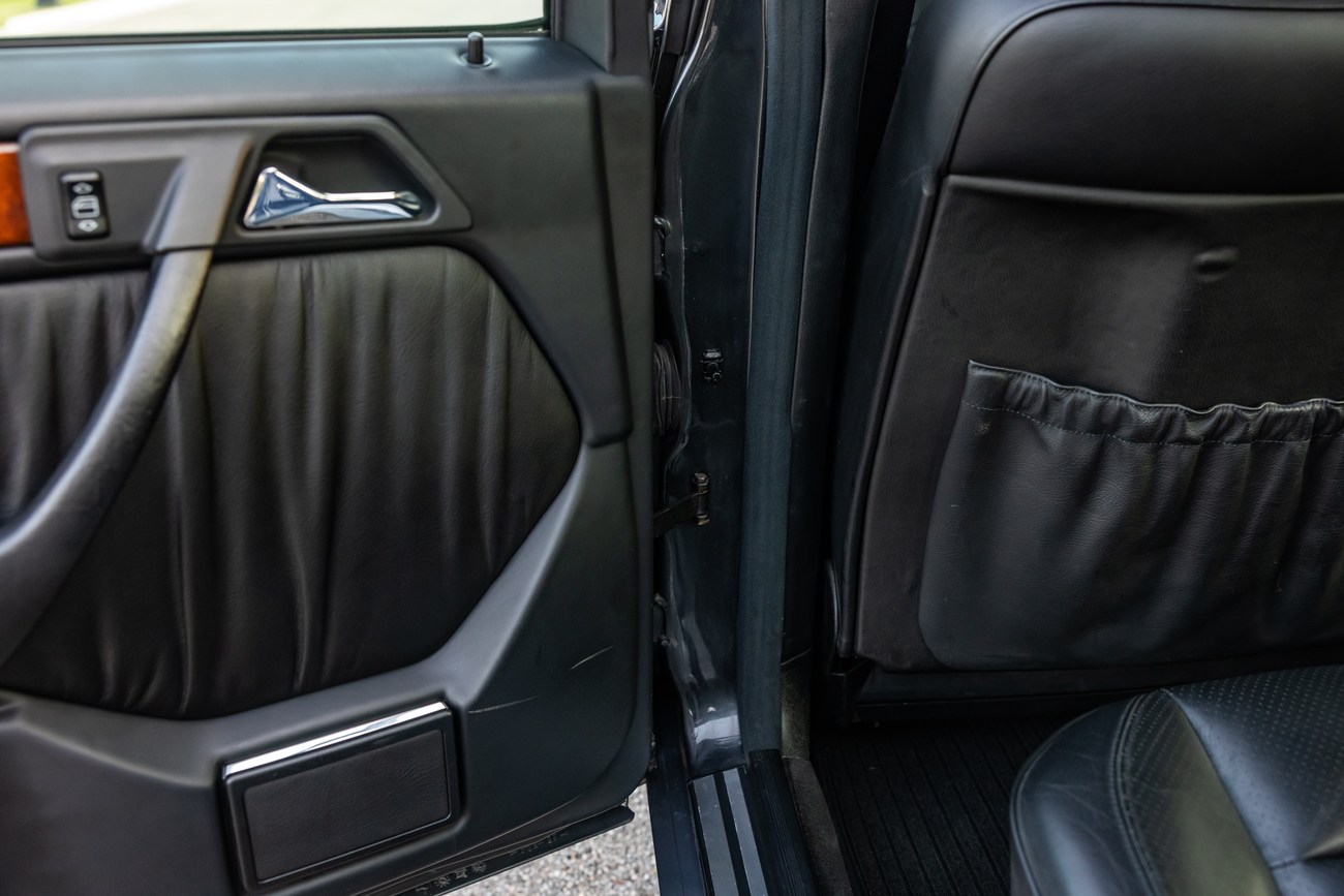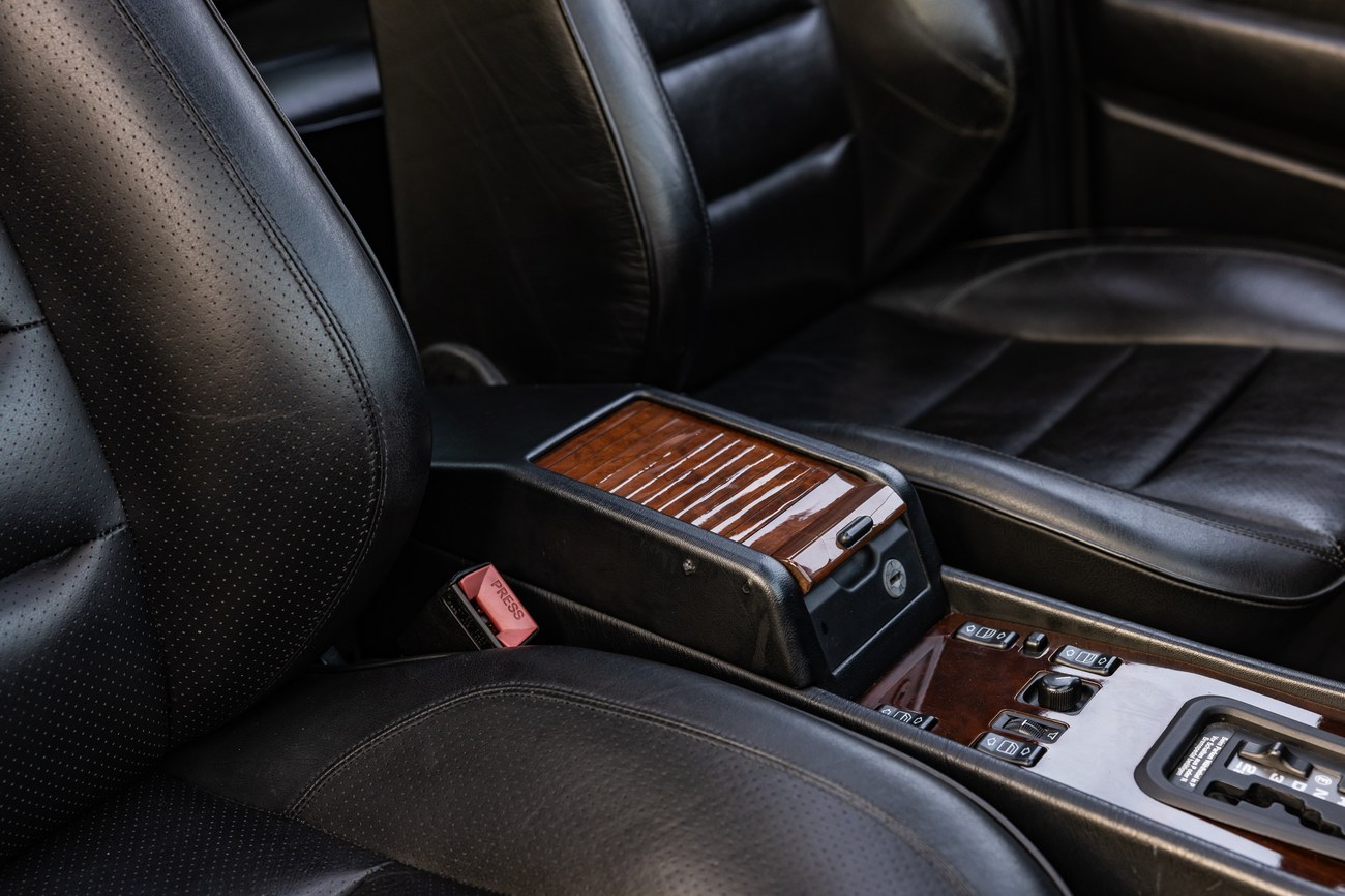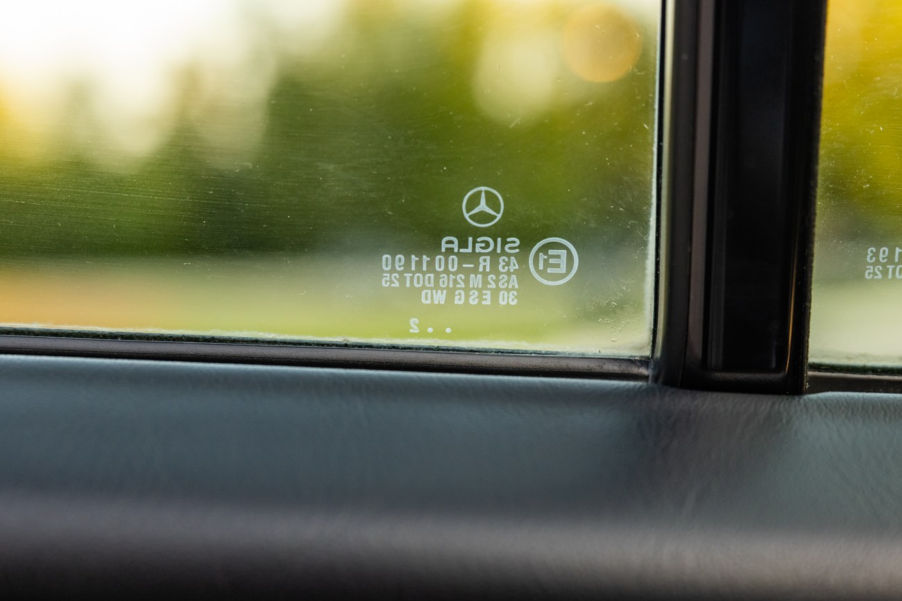 The body is finished in Black Pearl Metallic (199) with grey lower cladding. The 500E was assembled by Porsche and featured wheel arch flares, revised bodywork, and a lower ride height when compared to a standard W124 models. Additional exterior features include original Euro-spec 500E-specific headlights with wipers, integrated fog lights, a retractable antenna, and a power sunroof. The seller notes the lower cladding was refinished and rust repair was performed around the taillights and on the trunk by Michaelian Restoration of Stuart, Florida, in August 2022. The original "500E" badge has been replaced with the updated "E500" lettering on the trunk lid.