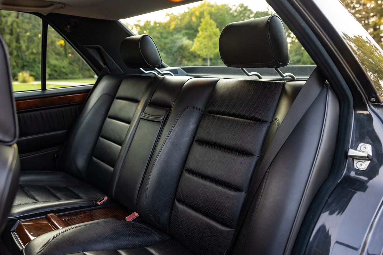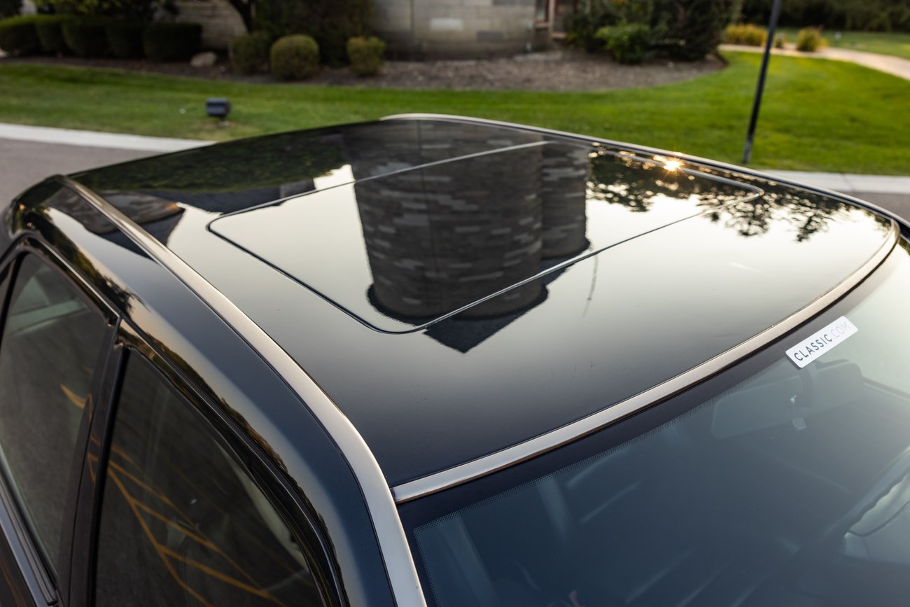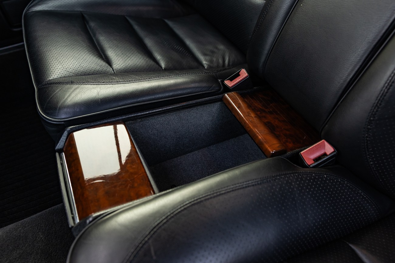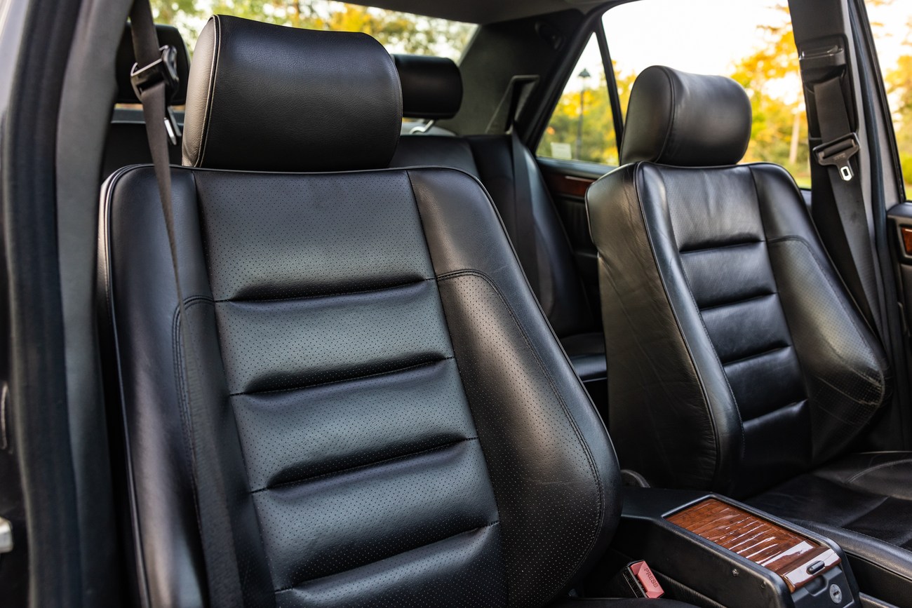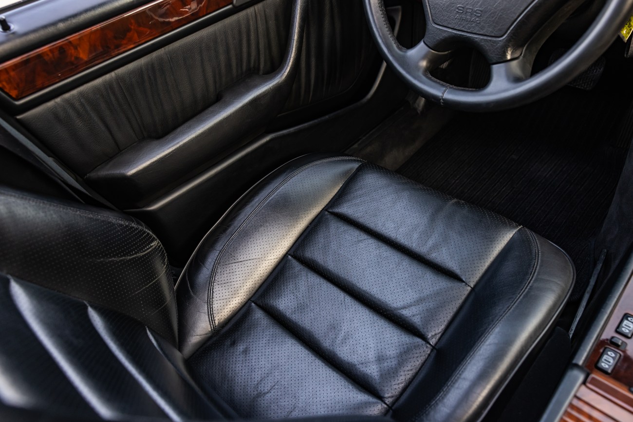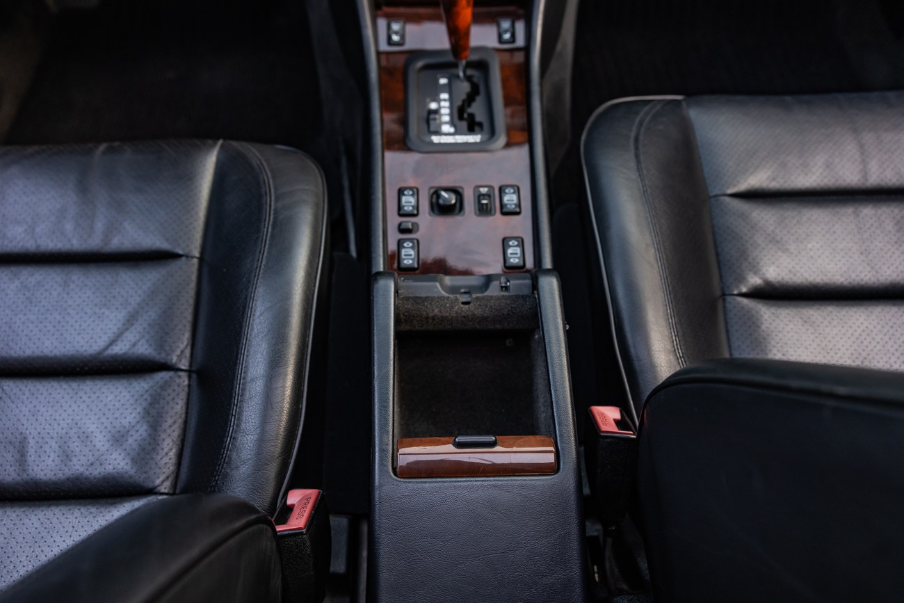 The body is finished in Black Pearl Metallic (199) with grey lower cladding. The 500E was assembled by Porsche and featured wheel arch flares, revised bodywork, and a lower ride height when compared to a standard W124 models. Additional exterior features include original Euro-spec 500E-specific headlights with wipers, integrated fog lights, a retractable antenna, and a power sunroof. The seller notes the lower cladding was refinished and rust repair was performed around the taillights and on the trunk by Michaelian Restoration of Stuart, Florida, in August 2022. The original "500E" badge has been replaced with the updated "E500" lettering on the trunk lid.