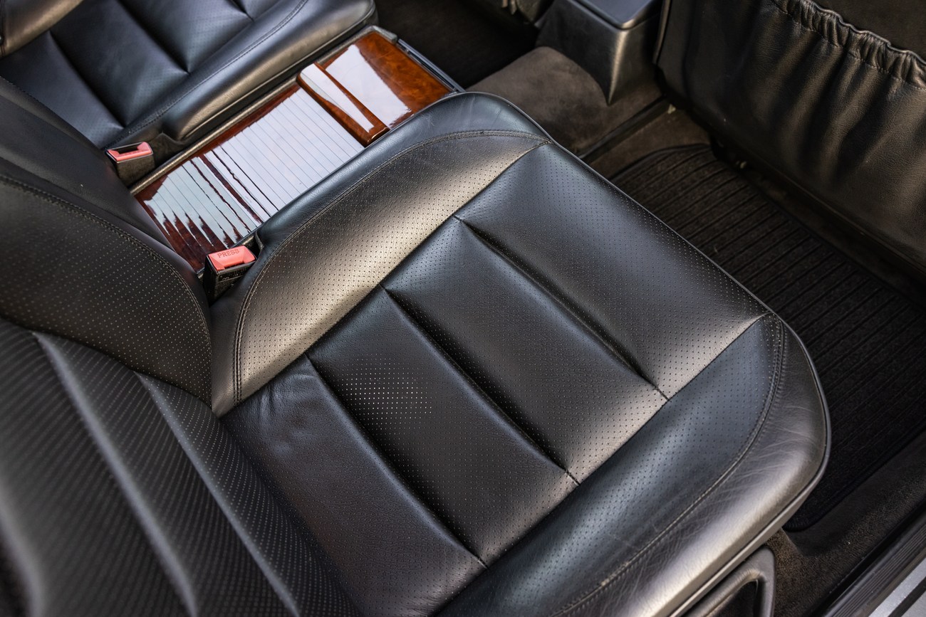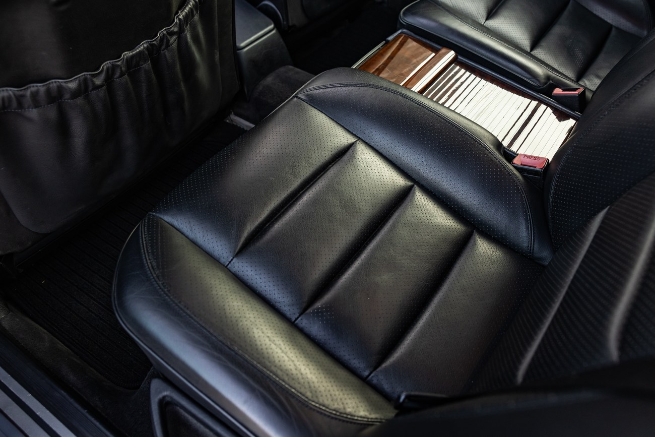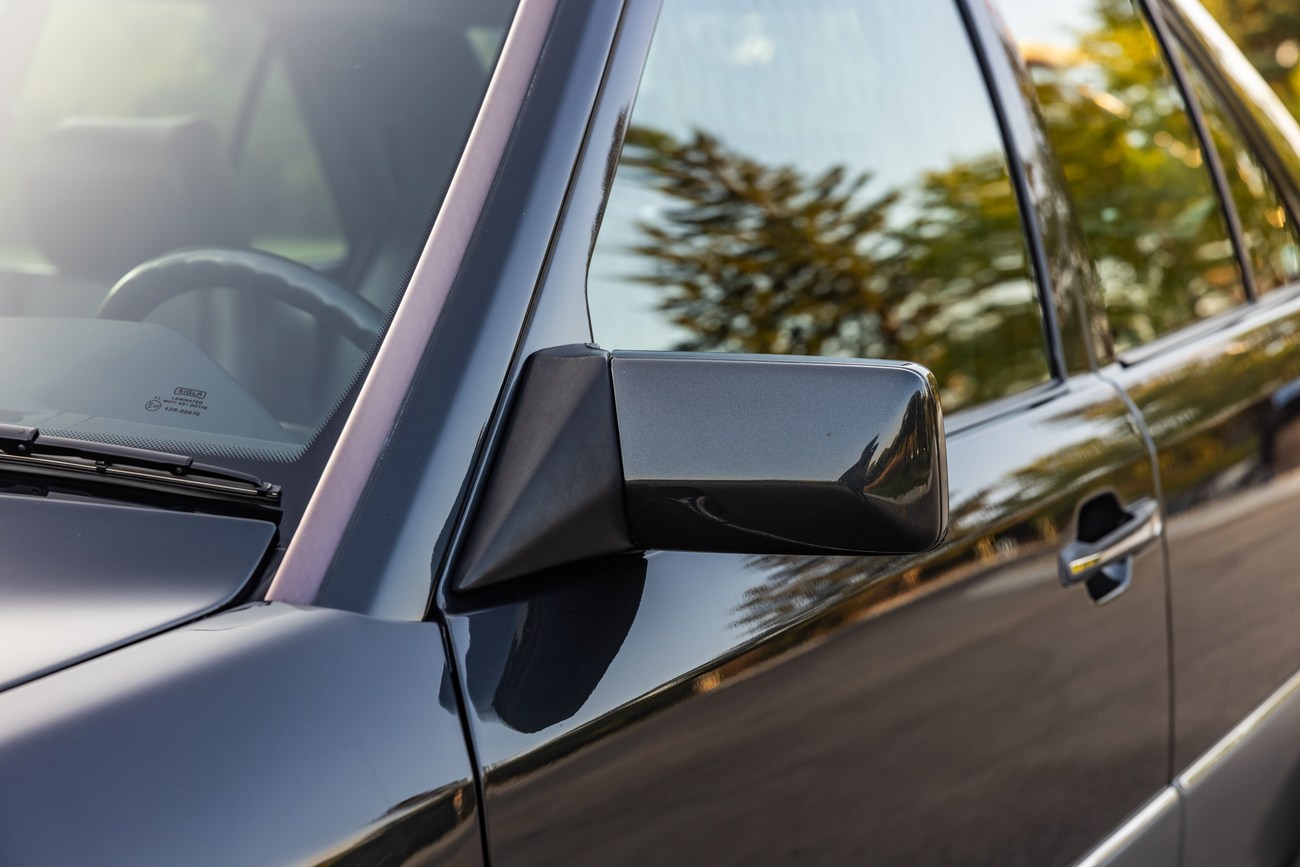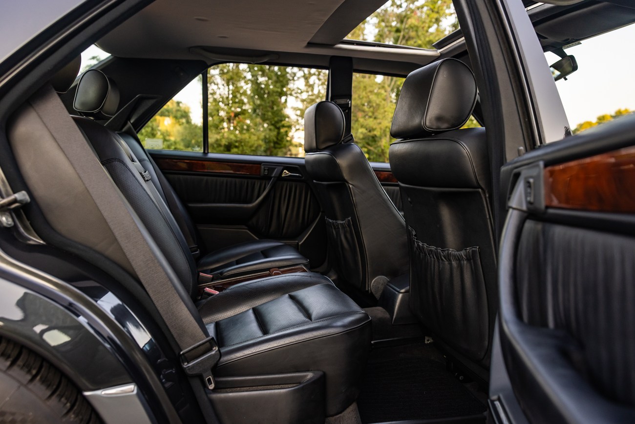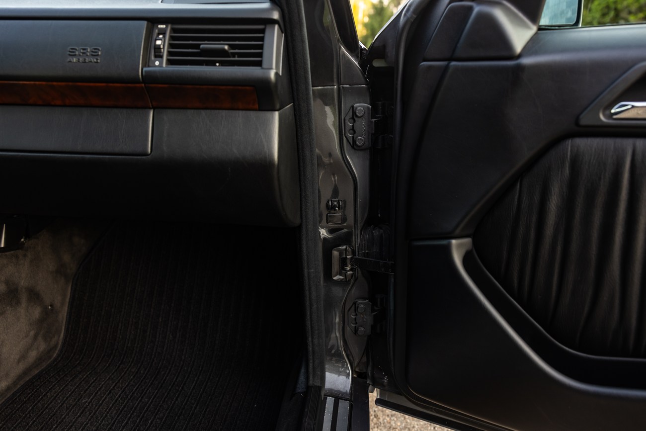 The body is finished in Black Pearl Metallic (199) with grey lower cladding. The 500E was assembled by Porsche and featured wheel arch flares, revised bodywork, and a lower ride height when compared to a standard W124 models. Additional exterior features include original Euro-spec 500E-specific headlights with wipers, integrated fog lights, a retractable antenna, and a power sunroof. The seller notes the lower cladding was refinished and rust repair was performed around the taillights and on the trunk by Michaelian Restoration of Stuart, Florida, in August 2022. The original "500E" badge has been replaced with the updated "E500" lettering on the trunk lid.