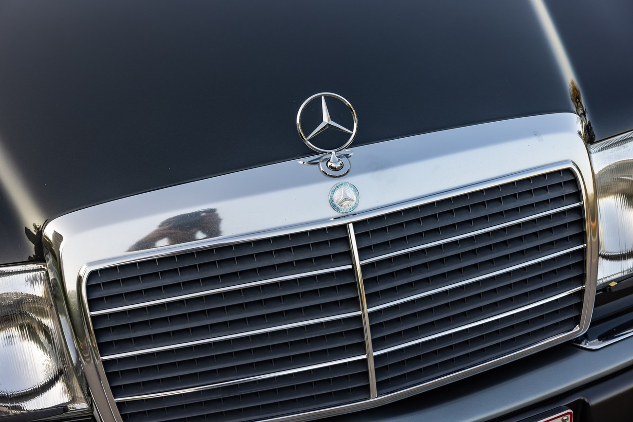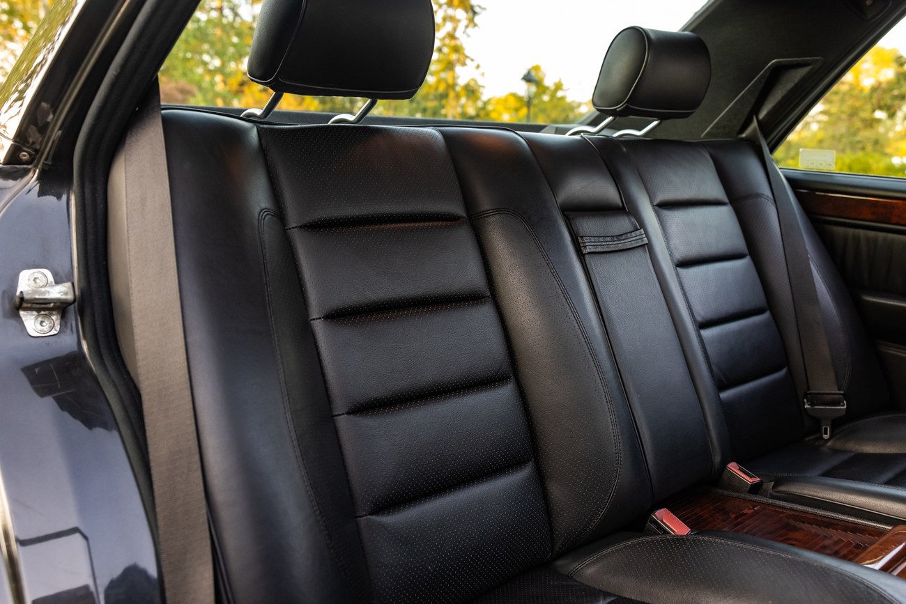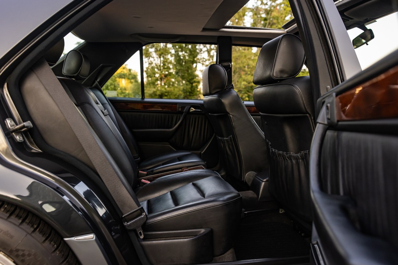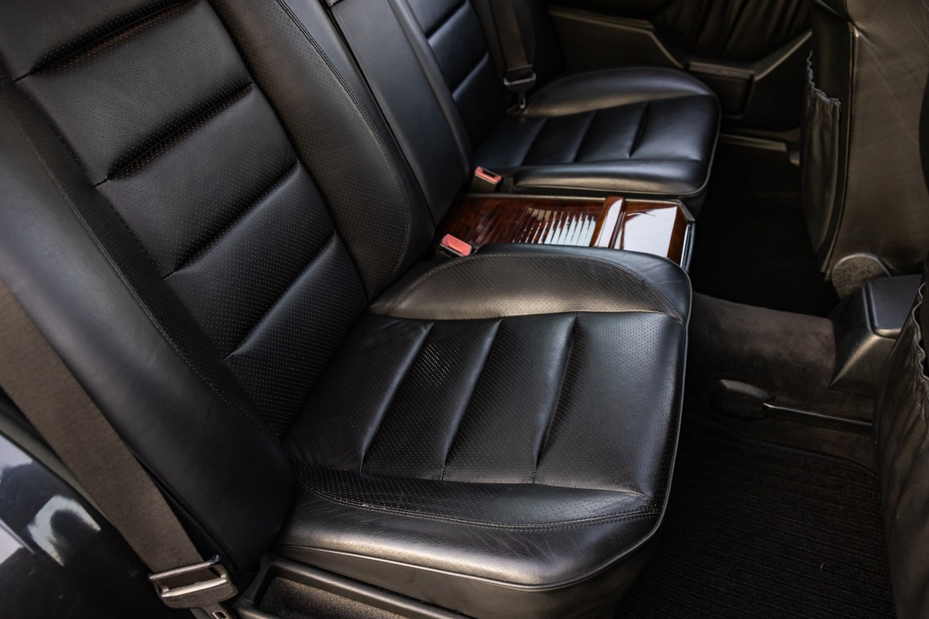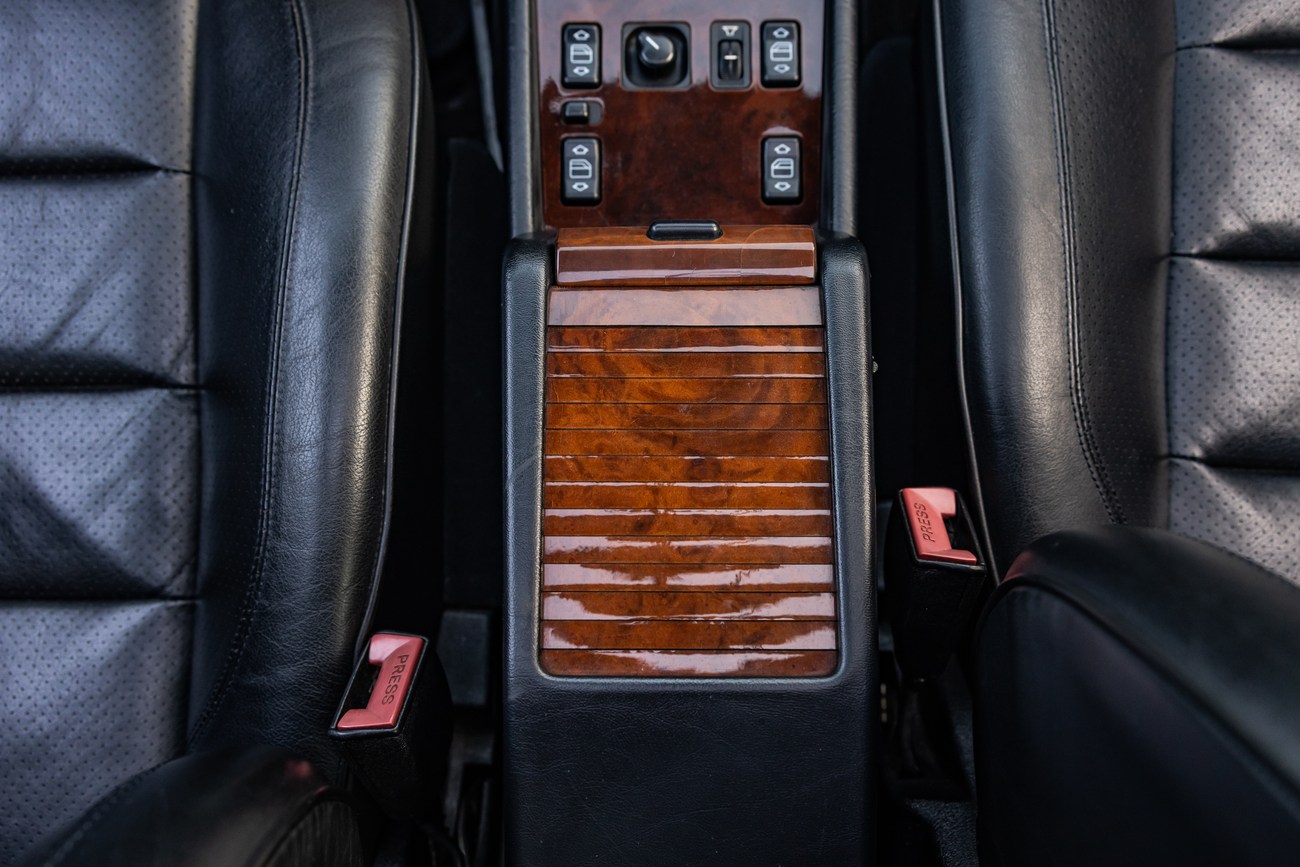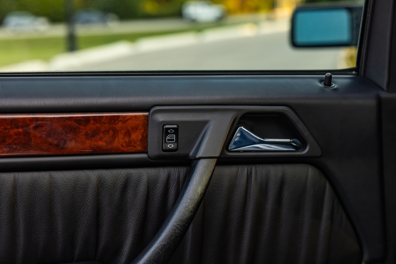 The body is finished in Black Pearl Metallic (199) with grey lower cladding. The 500E was assembled by Porsche and featured wheel arch flares, revised bodywork, and a lower ride height when compared to a standard W124 models. Additional exterior features include original Euro-spec 500E-specific headlights with wipers, integrated fog lights, a retractable antenna, and a power sunroof. The seller notes the lower cladding was refinished and rust repair was performed around the taillights and on the trunk by Michaelian Restoration of Stuart, Florida, in August 2022. The original "500E" badge has been replaced with the updated "E500" lettering on the trunk lid.