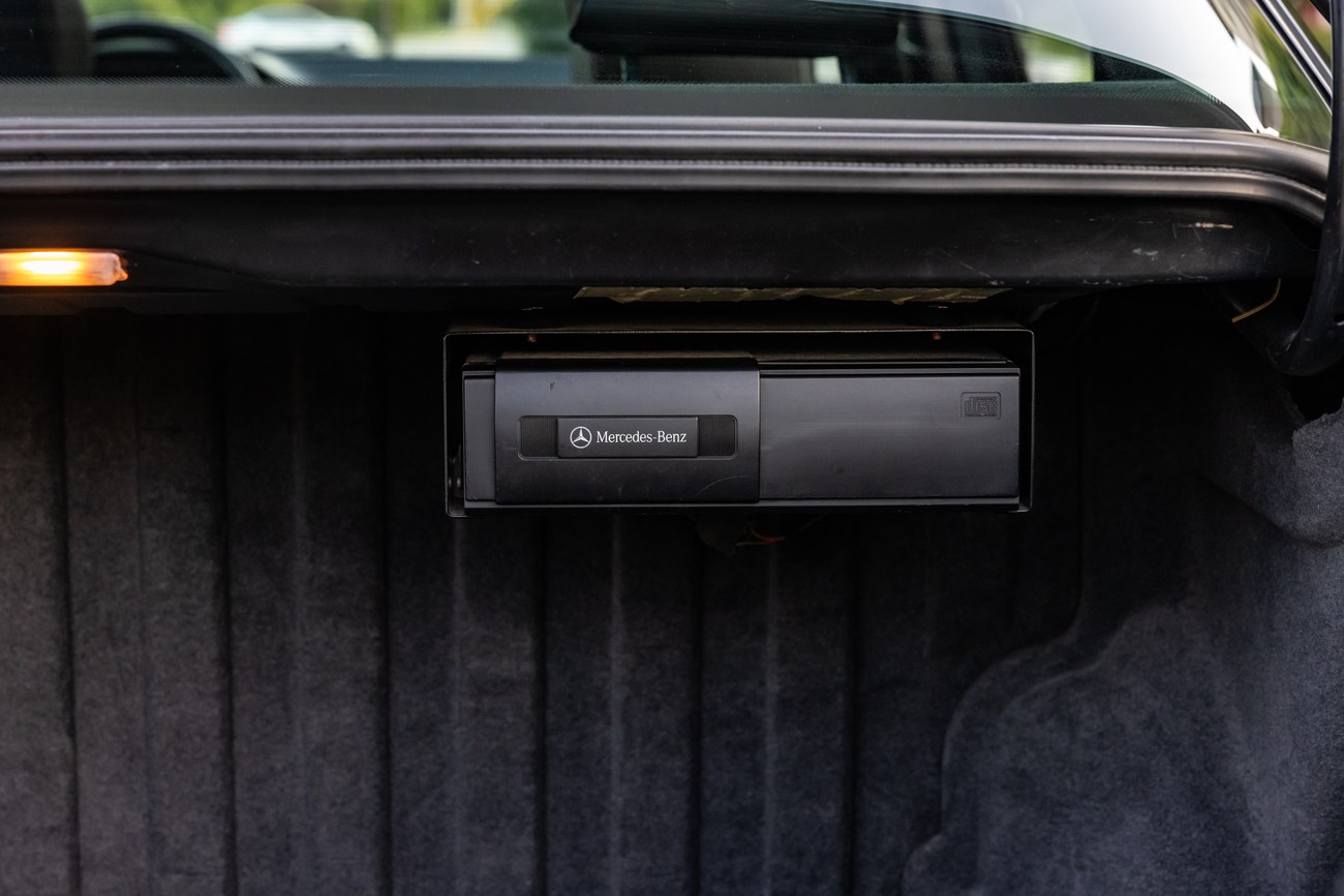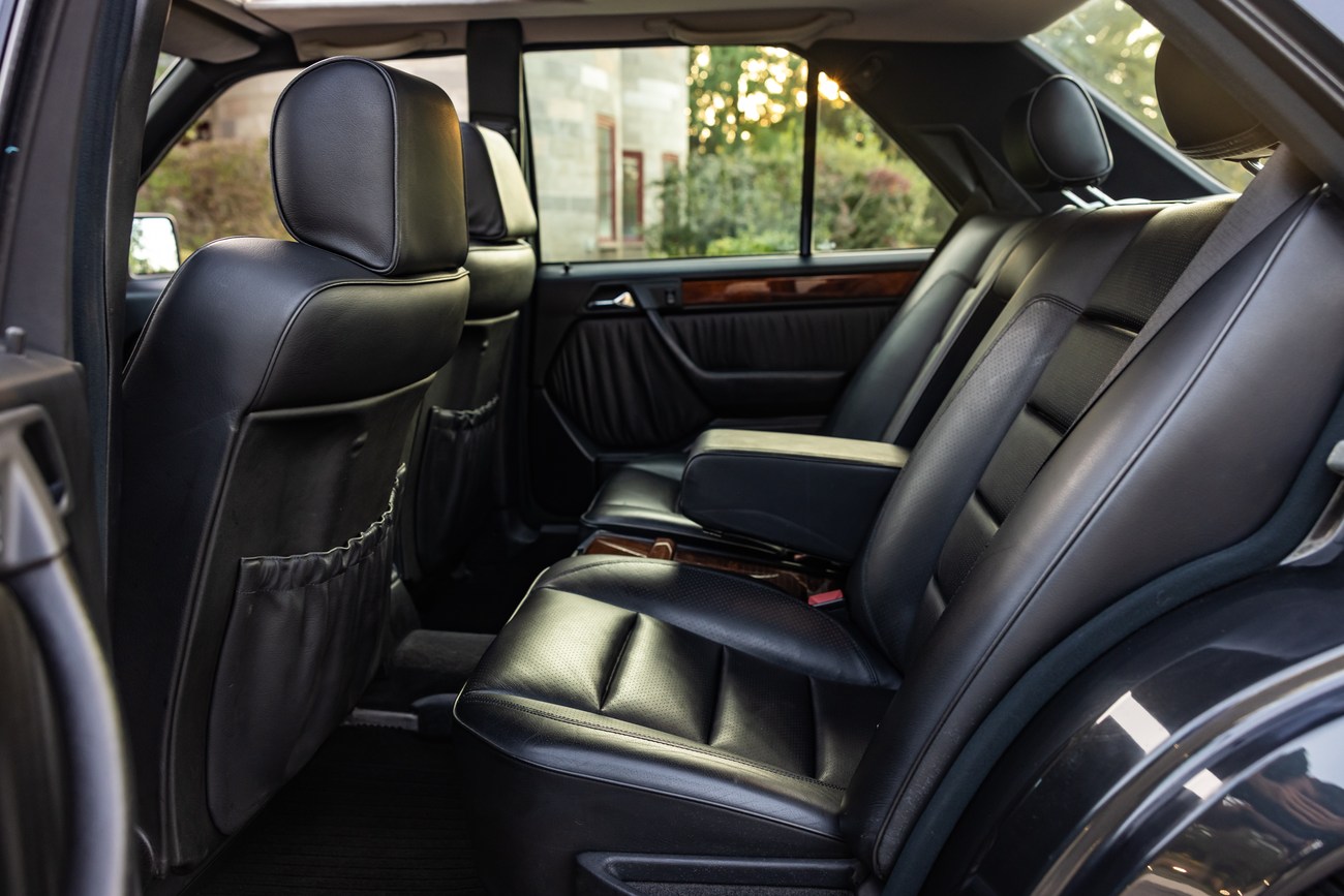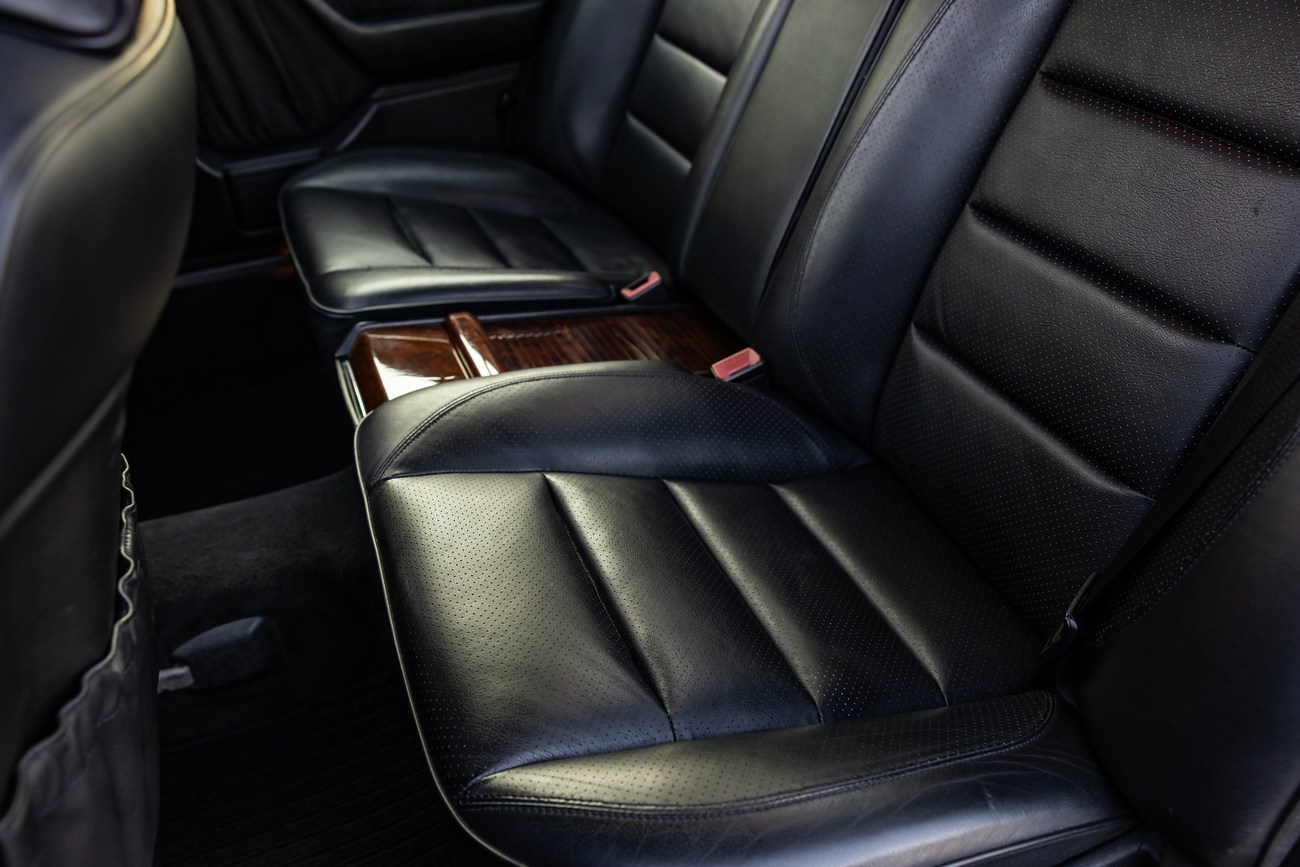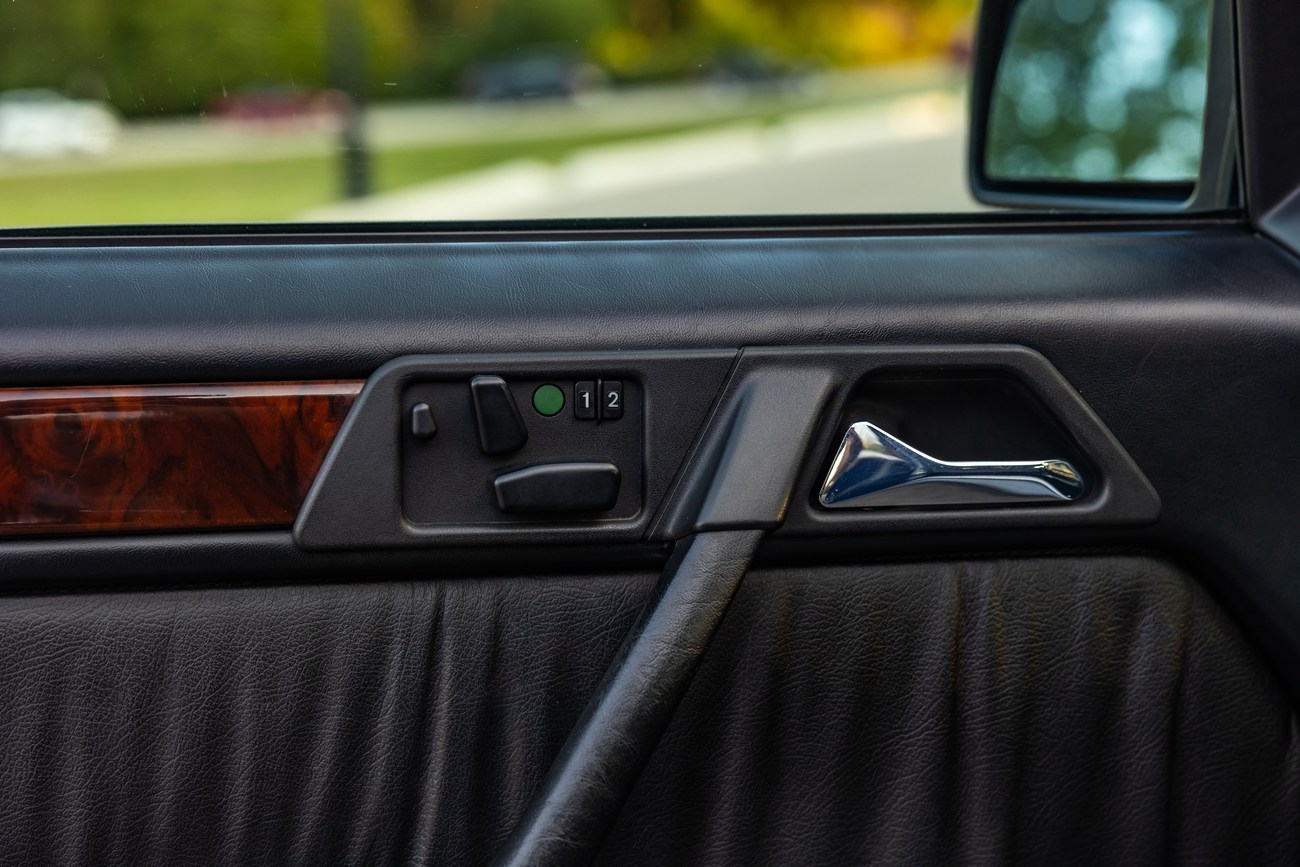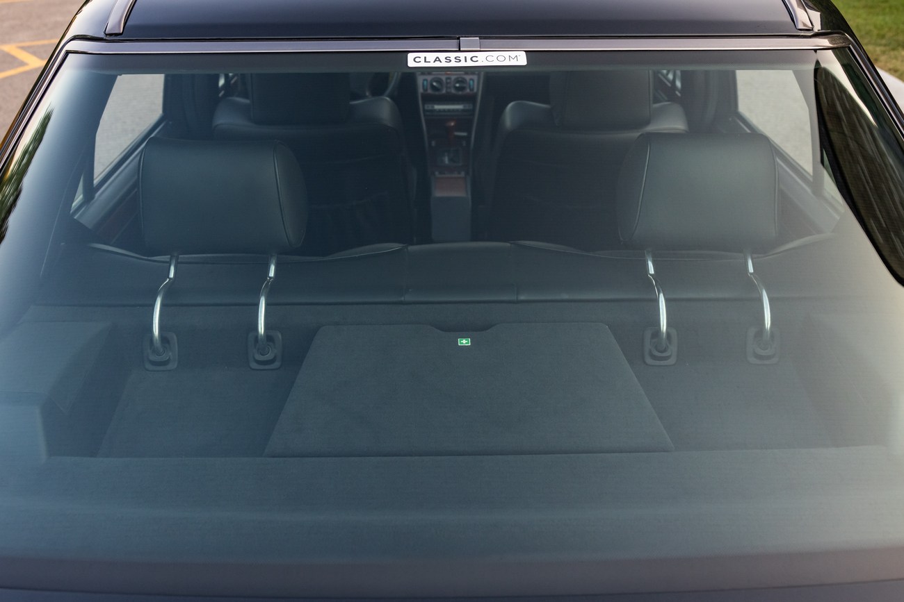 The body is finished in Black Pearl Metallic (199) with grey lower cladding. The 500E was assembled by Porsche and featured wheel arch flares, revised bodywork, and a lower ride height when compared to a standard W124 models. Additional exterior features include original Euro-spec 500E-specific headlights with wipers, integrated fog lights, a retractable antenna, and a power sunroof. The seller notes the lower cladding was refinished and rust repair was performed around the taillights and on the trunk by Michaelian Restoration of Stuart, Florida, in August 2022. The original "500E" badge has been replaced with the updated "E500" lettering on the trunk lid.