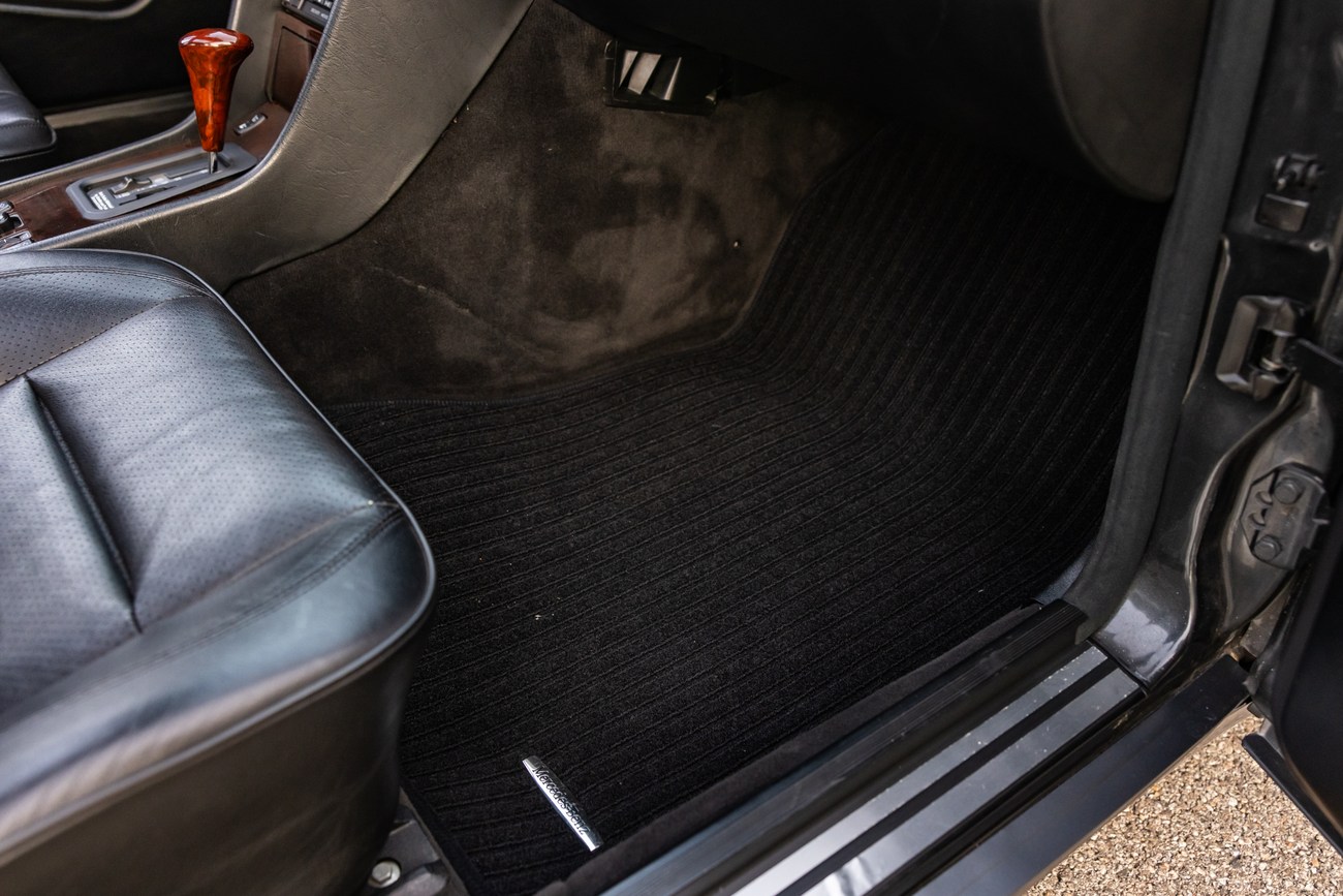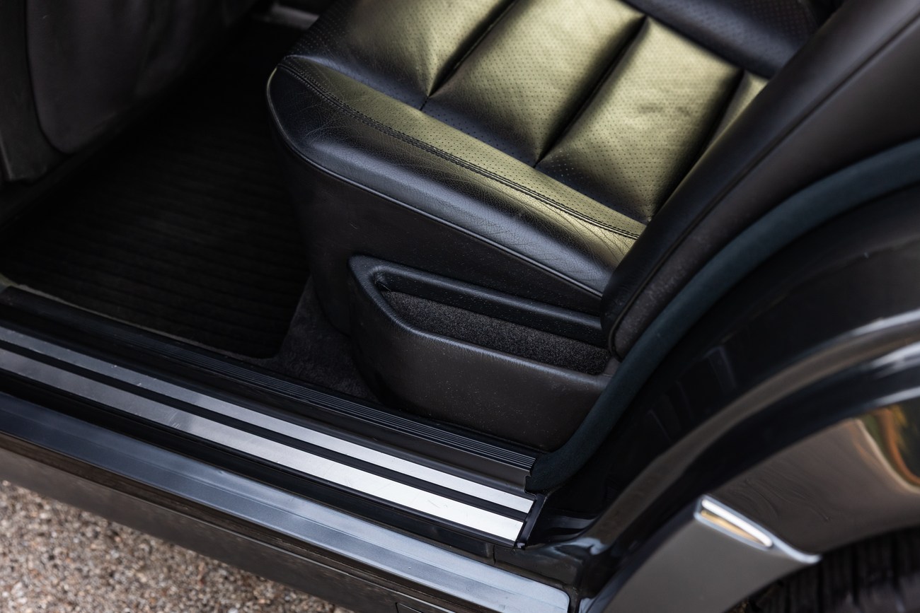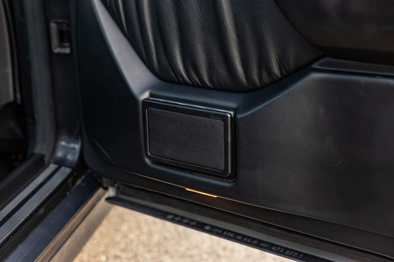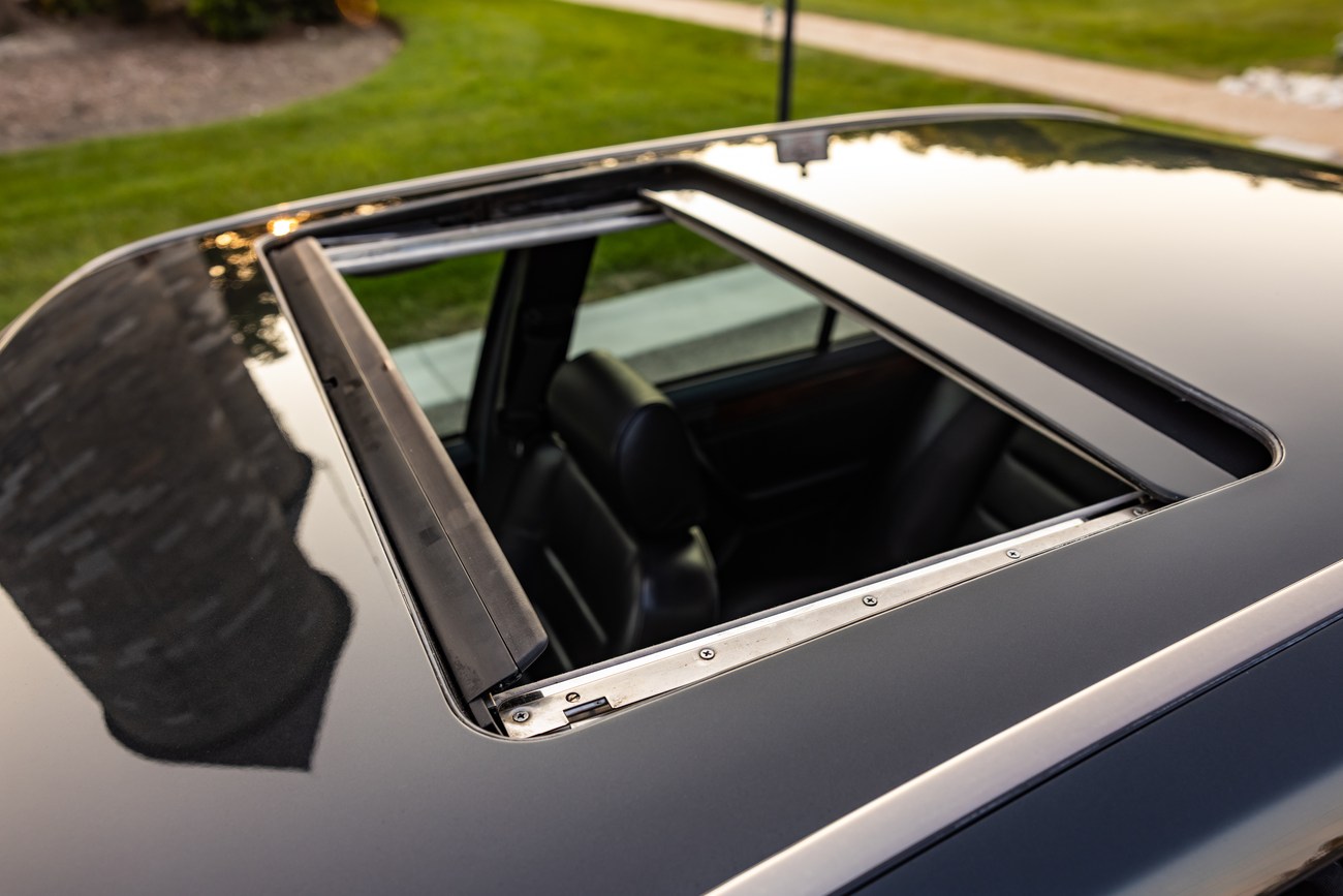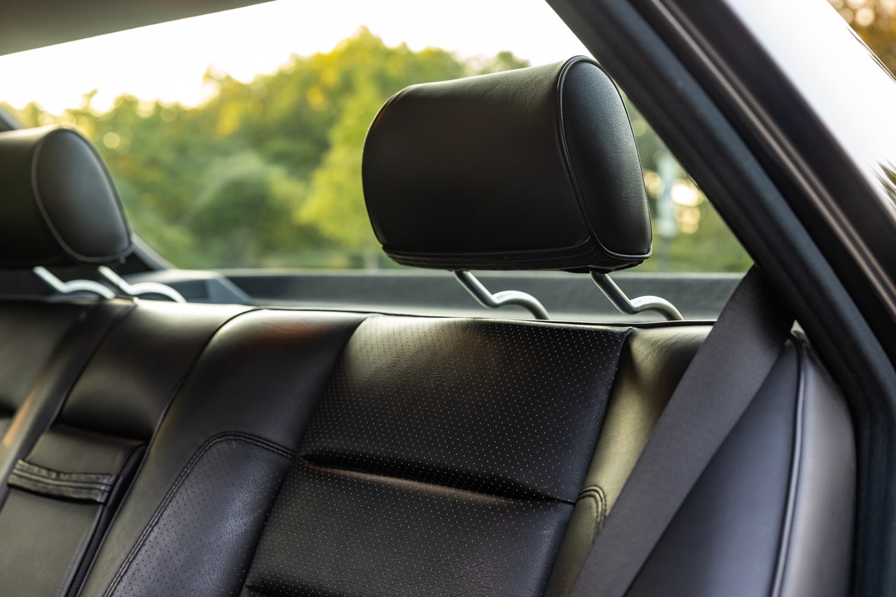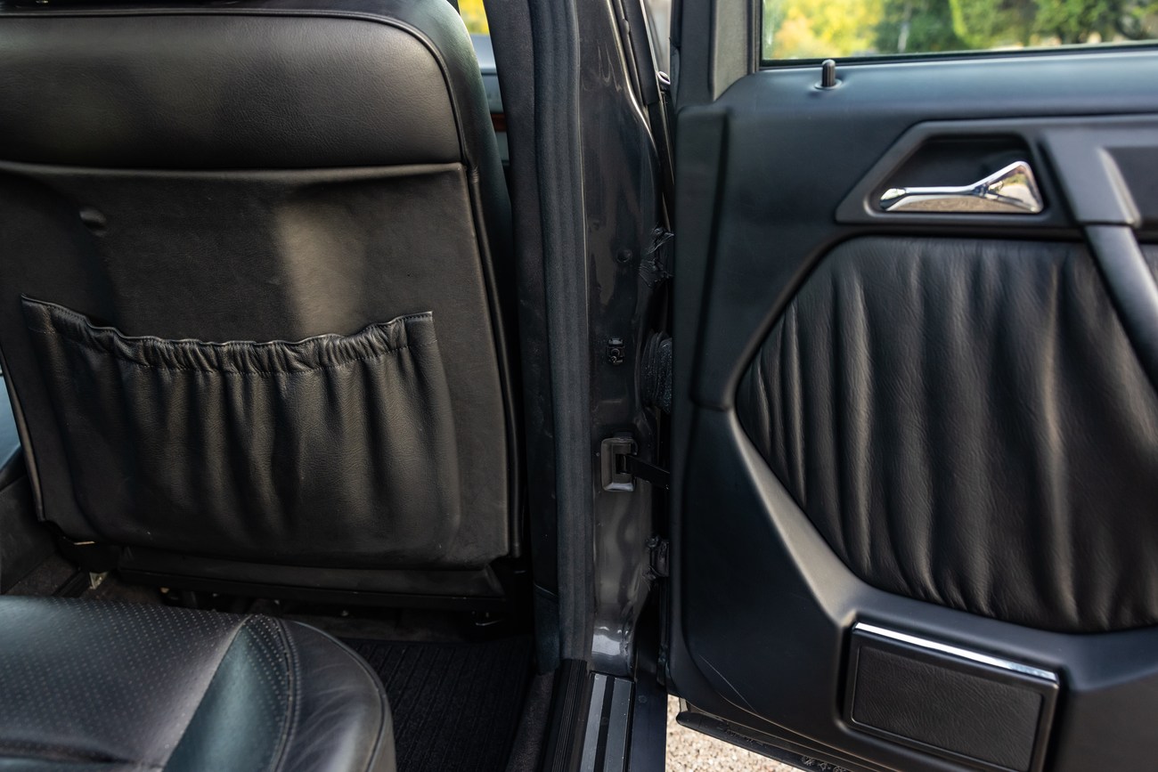The body is finished in Black Pearl Metallic (199) with grey lower cladding. The 500E was assembled by Porsche and featured wheel arch flares, revised bodywork, and a lower ride height when compared to a standard W124 models. Additional exterior features include original Euro-spec 500E-specific headlights with wipers, integrated fog lights, a retractable antenna, and a power sunroof. The seller notes the lower cladding was refinished and rust repair was performed around the taillights and on the trunk by Michaelian Restoration of Stuart, Florida, in August 2022. The original "500E" badge has been replaced with the updated "E500" lettering on the trunk lid.