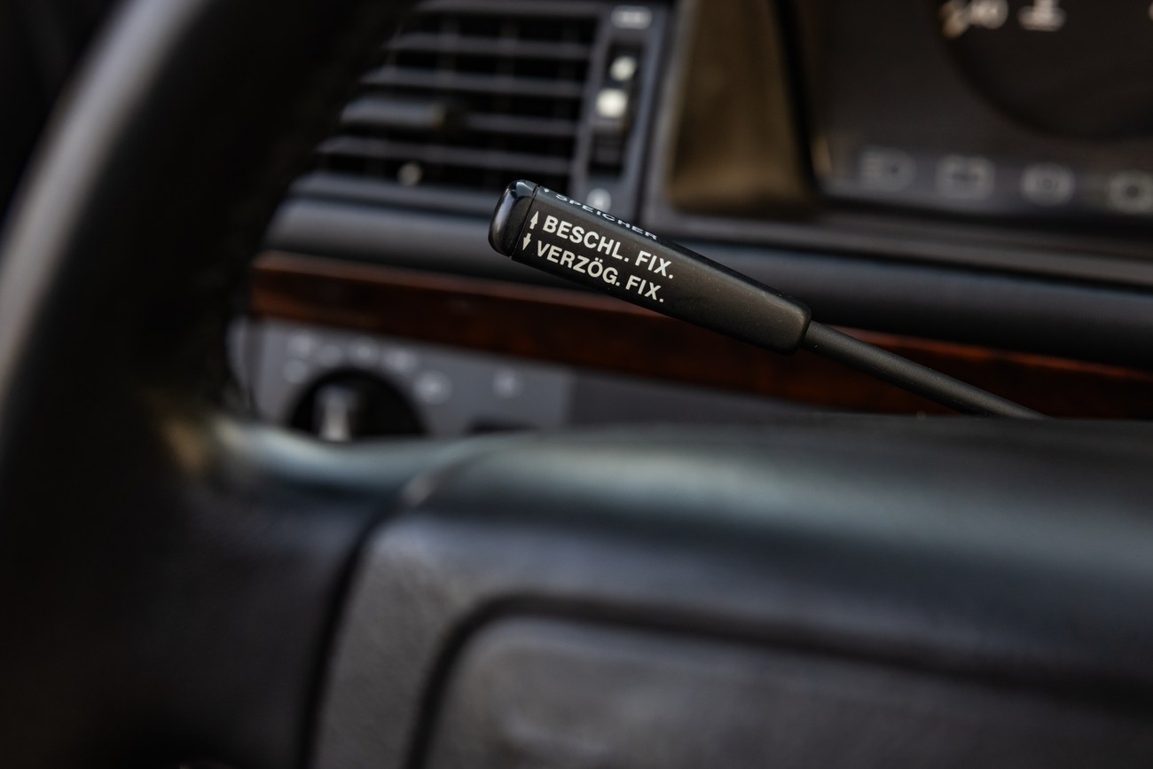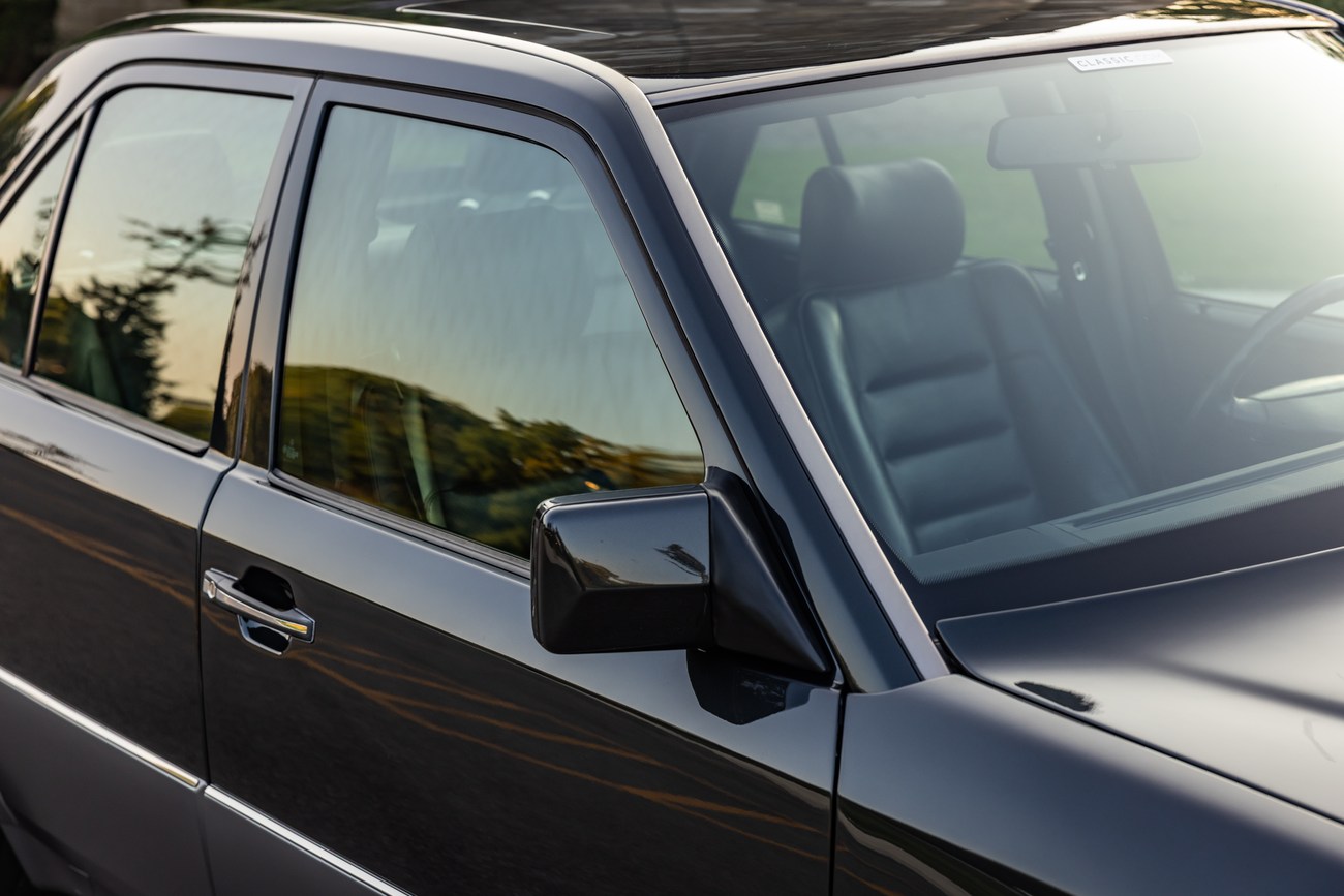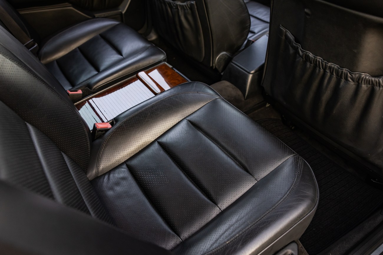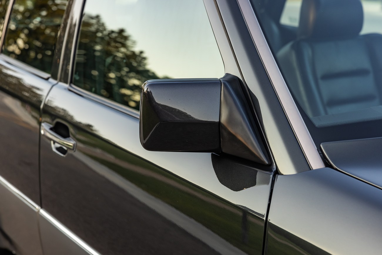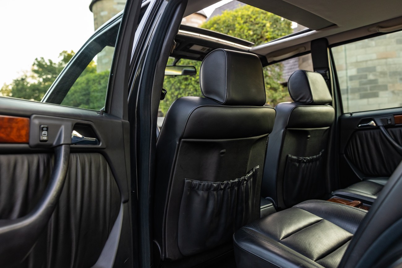 The body is finished in Black Pearl Metallic (199) with grey lower cladding. The 500E was assembled by Porsche and featured wheel arch flares, revised bodywork, and a lower ride height when compared to a standard W124 models. Additional exterior features include original Euro-spec 500E-specific headlights with wipers, integrated fog lights, a retractable antenna, and a power sunroof. The seller notes the lower cladding was refinished and rust repair was performed around the taillights and on the trunk by Michaelian Restoration of Stuart, Florida, in August 2022. The original "500E" badge has been replaced with the updated "E500" lettering on the trunk lid.