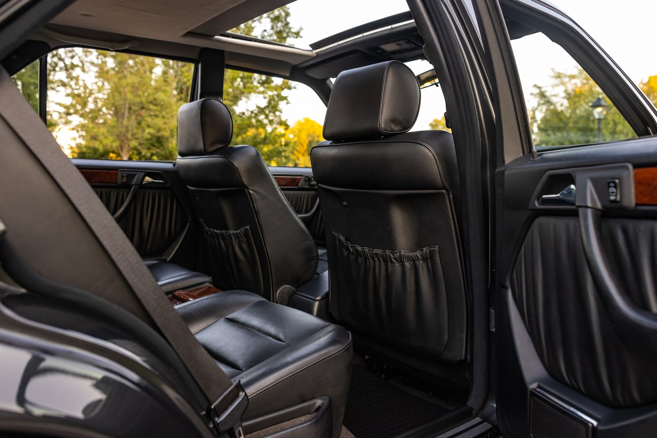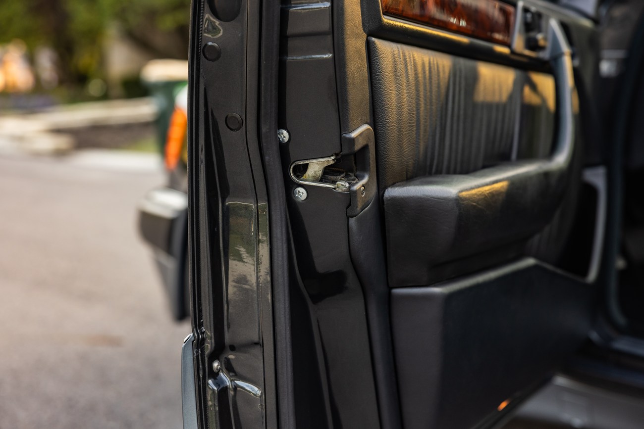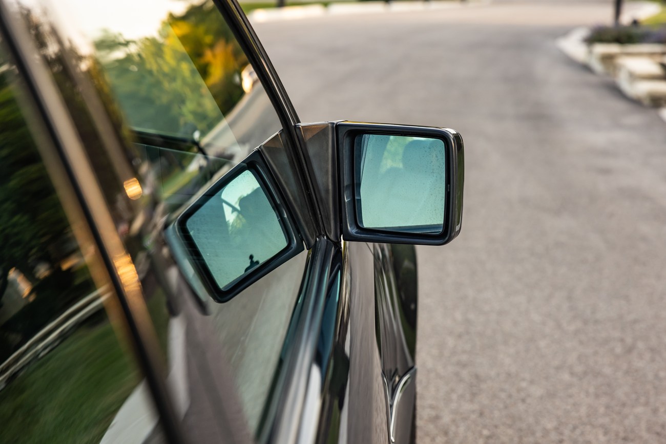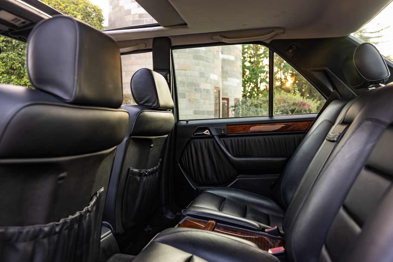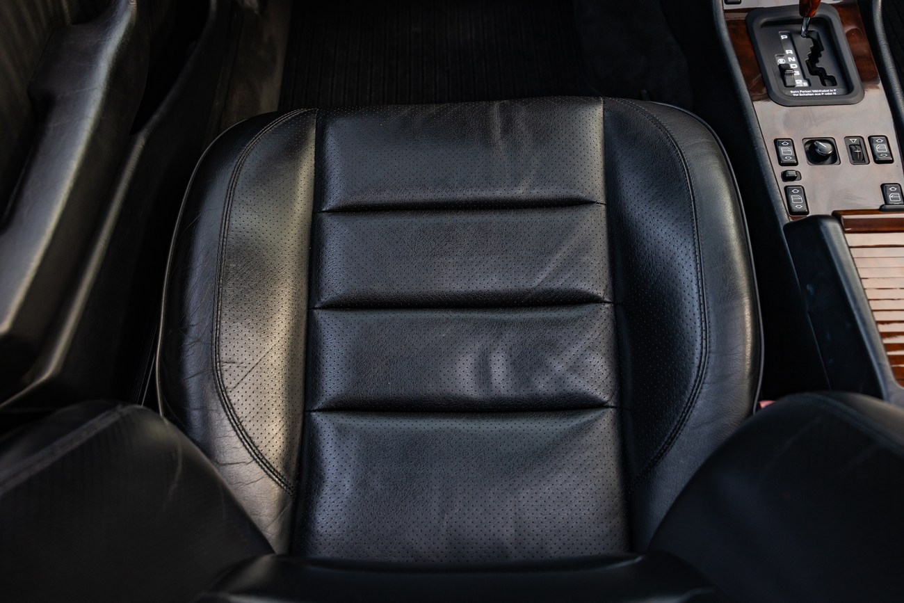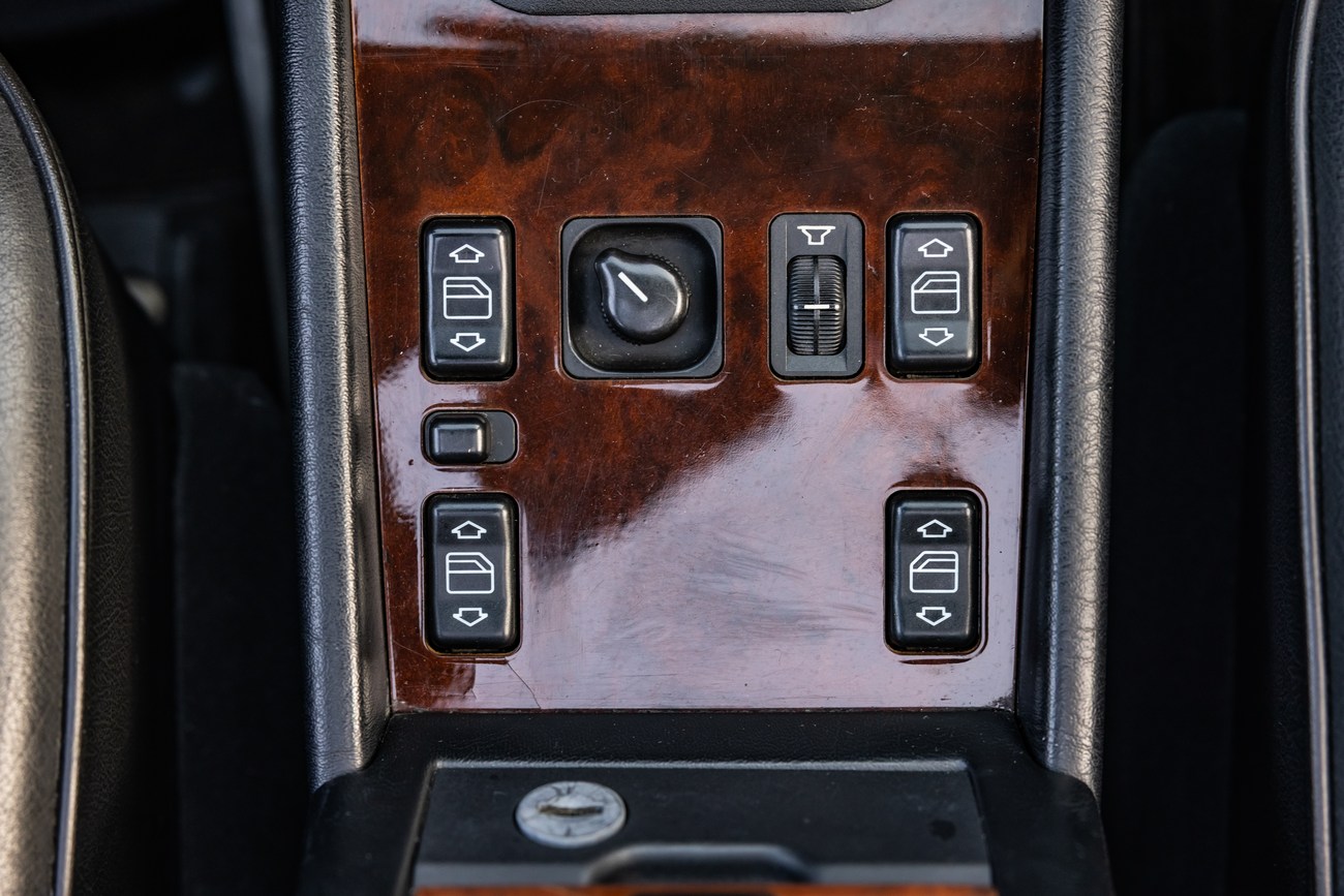 The body is finished in Black Pearl Metallic (199) with grey lower cladding. The 500E was assembled by Porsche and featured wheel arch flares, revised bodywork, and a lower ride height when compared to a standard W124 models. Additional exterior features include original Euro-spec 500E-specific headlights with wipers, integrated fog lights, a retractable antenna, and a power sunroof. The seller notes the lower cladding was refinished and rust repair was performed around the taillights and on the trunk by Michaelian Restoration of Stuart, Florida, in August 2022. The original "500E" badge has been replaced with the updated "E500" lettering on the trunk lid.