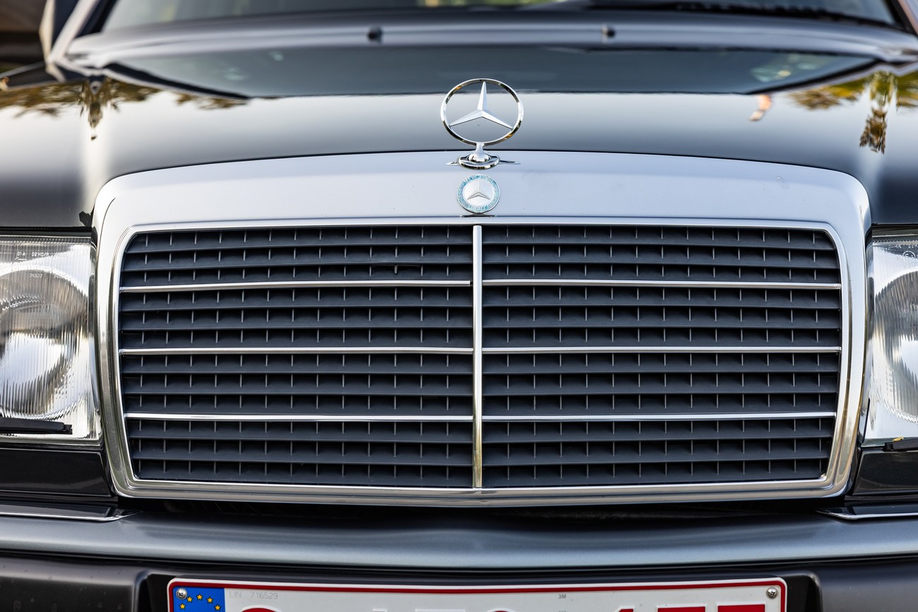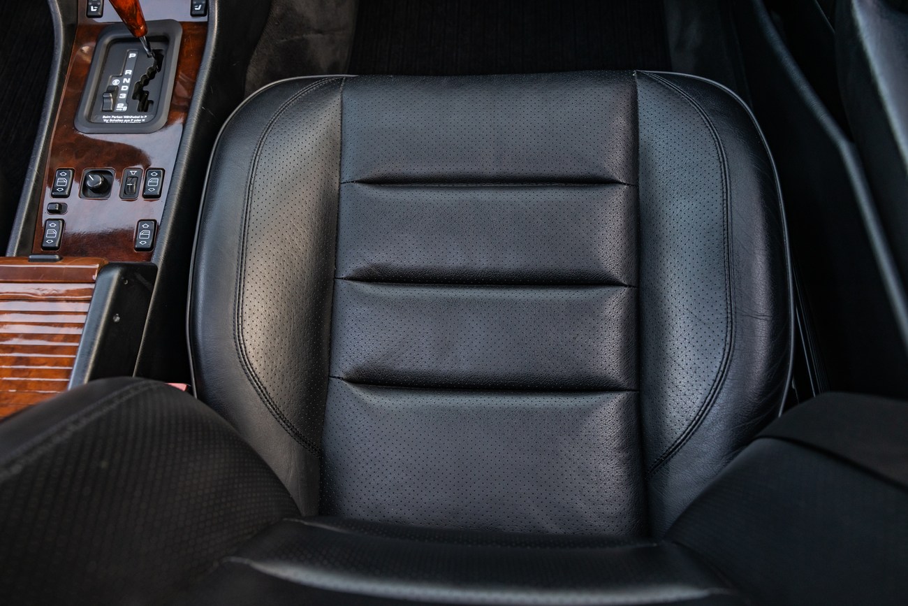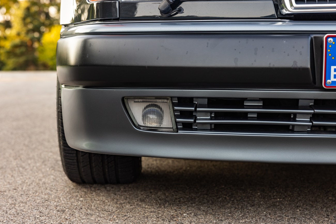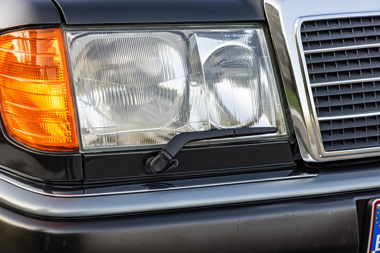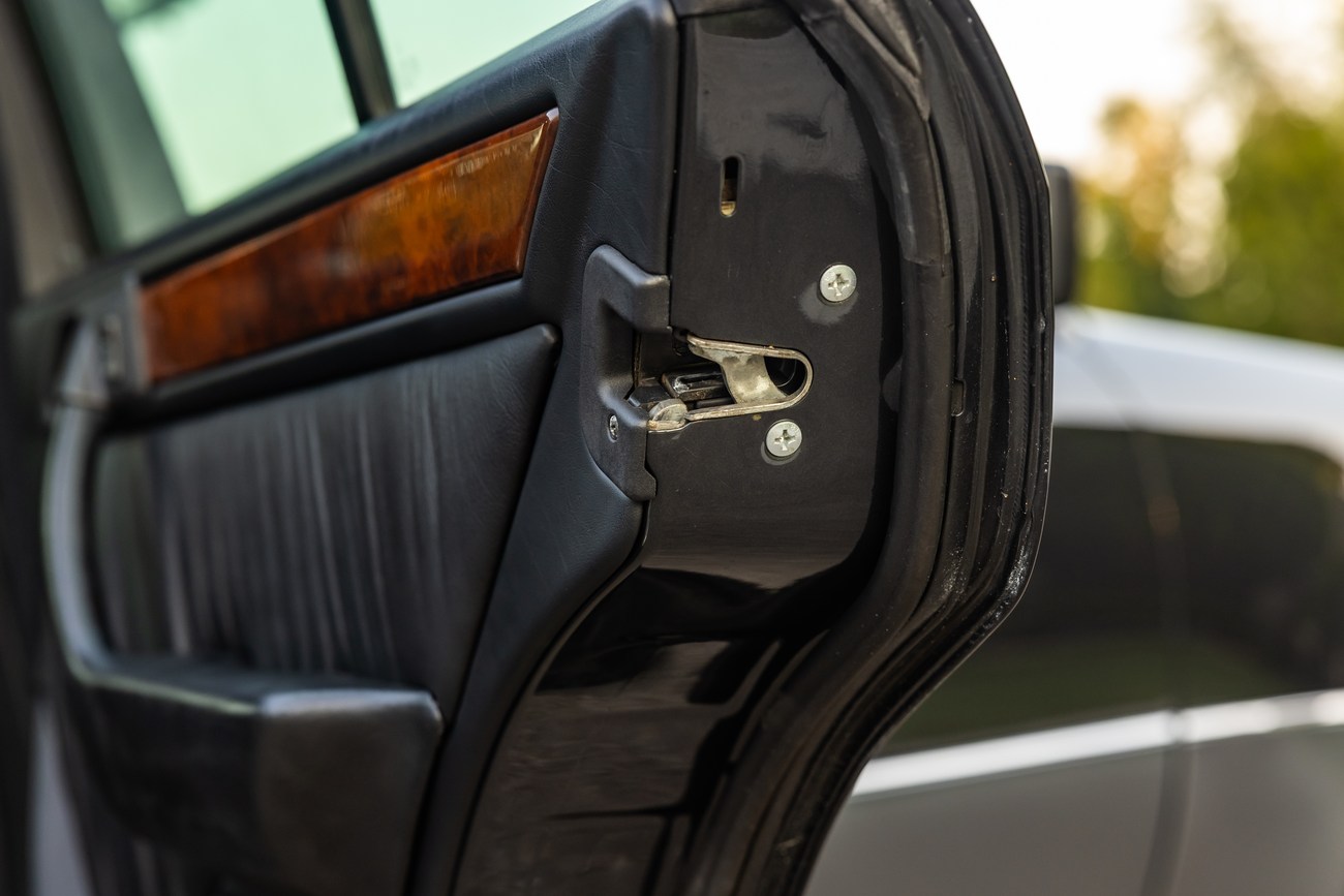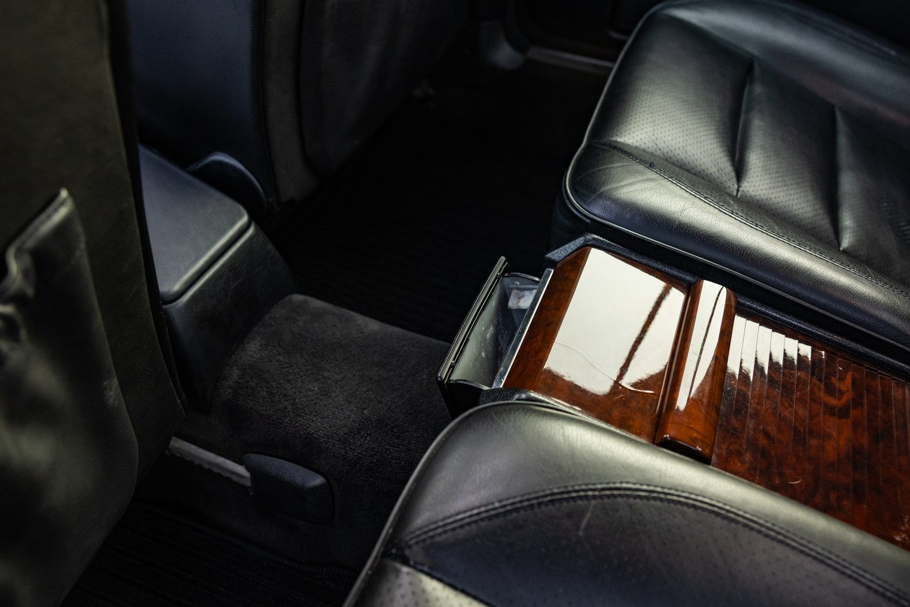 The body is finished in Black Pearl Metallic (199) with grey lower cladding. The 500E was assembled by Porsche and featured wheel arch flares, revised bodywork, and a lower ride height when compared to a standard W124 models. Additional exterior features include original Euro-spec 500E-specific headlights with wipers, integrated fog lights, a retractable antenna, and a power sunroof. The seller notes the lower cladding was refinished and rust repair was performed around the taillights and on the trunk by Michaelian Restoration of Stuart, Florida, in August 2022. The original "500E" badge has been replaced with the updated "E500" lettering on the trunk lid.