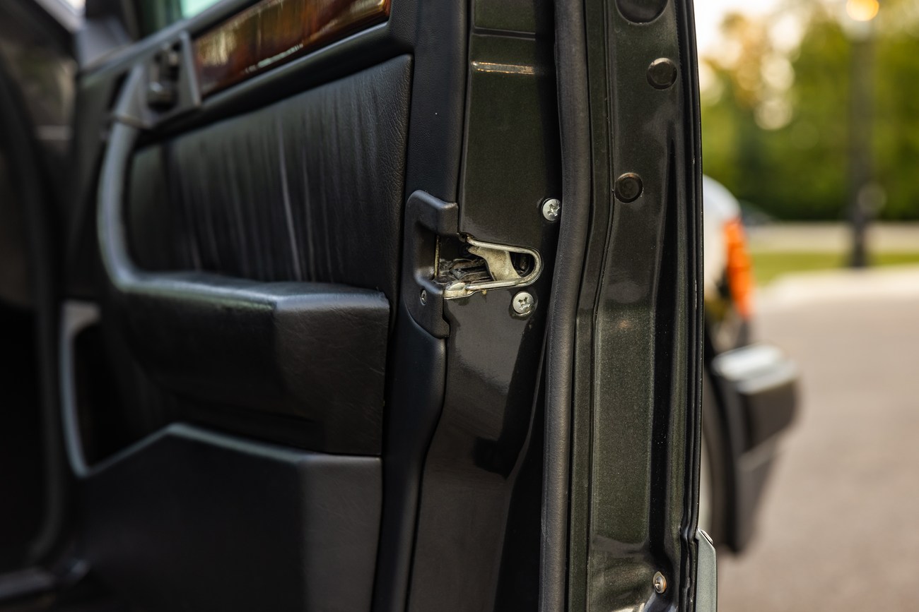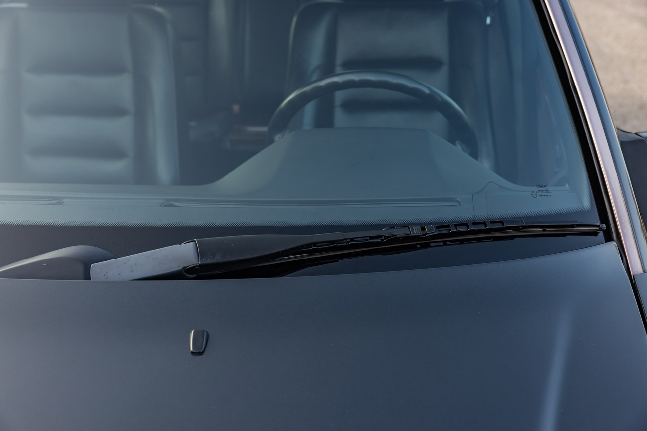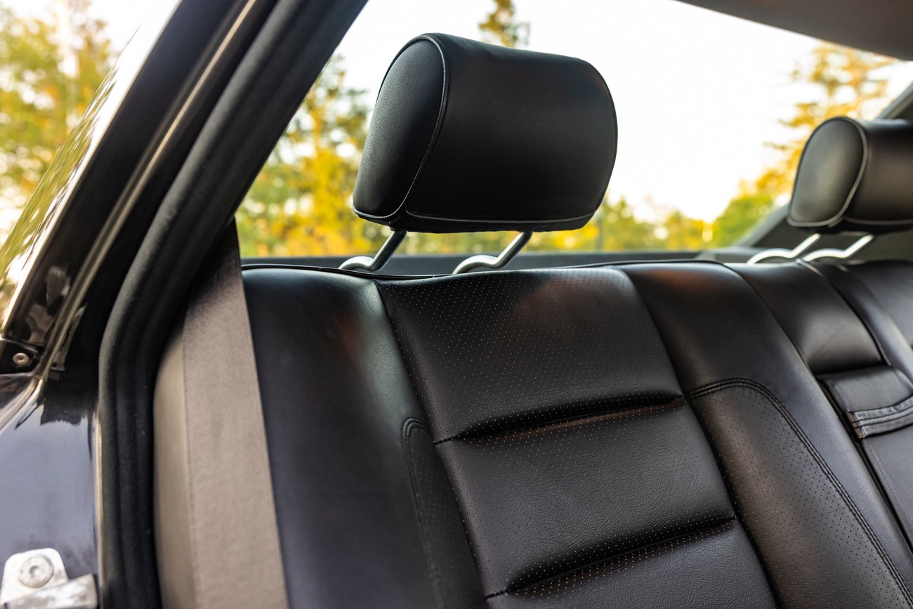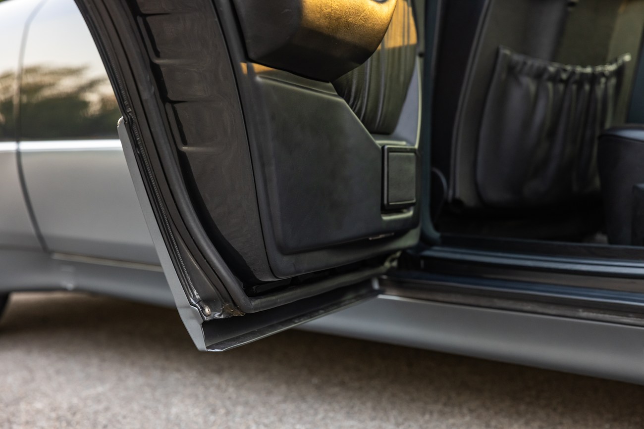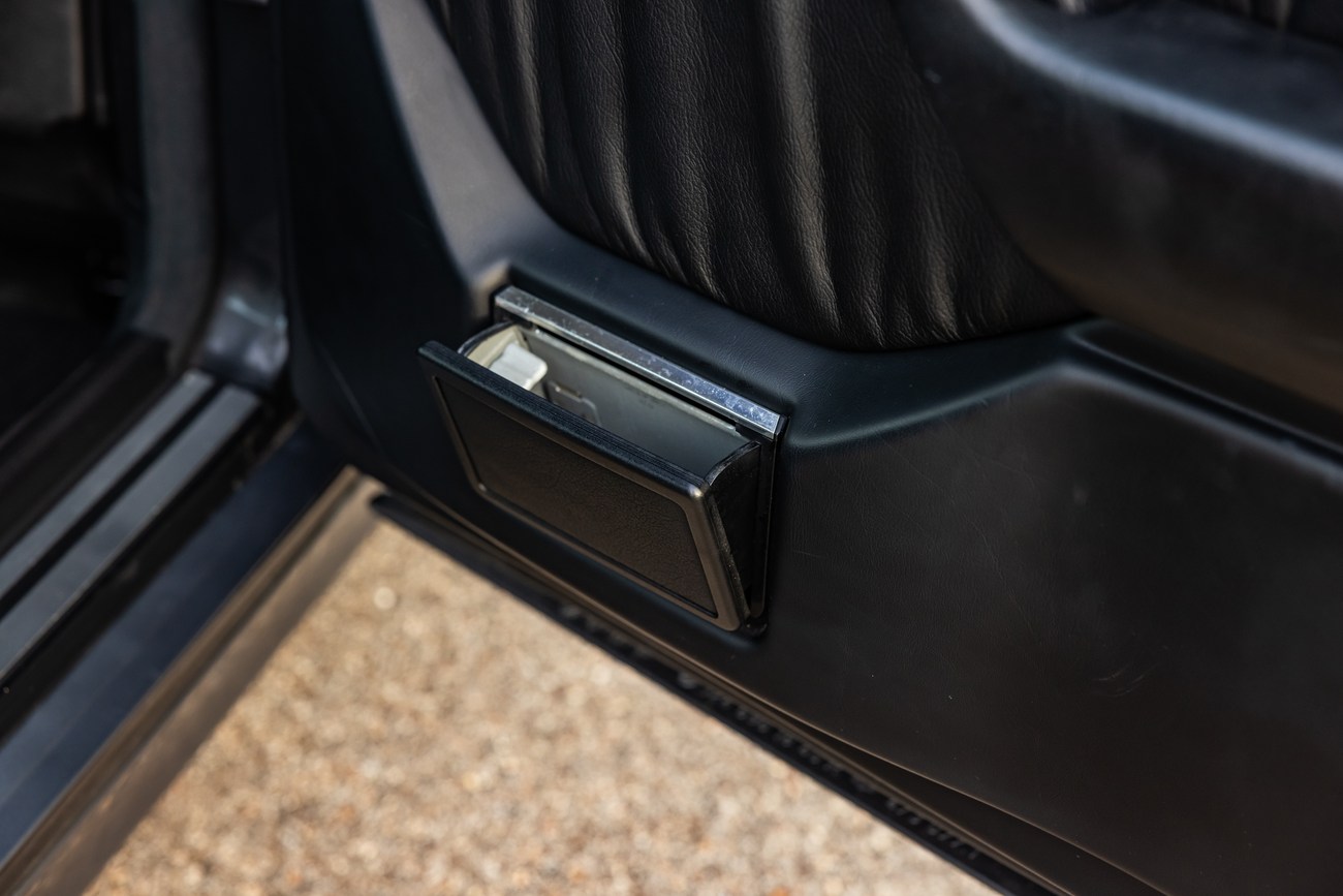 The body is finished in Black Pearl Metallic (199) with grey lower cladding. The 500E was assembled by Porsche and featured wheel arch flares, revised bodywork, and a lower ride height when compared to a standard W124 models. Additional exterior features include original Euro-spec 500E-specific headlights with wipers, integrated fog lights, a retractable antenna, and a power sunroof. The seller notes the lower cladding was refinished and rust repair was performed around the taillights and on the trunk by Michaelian Restoration of Stuart, Florida, in August 2022. The original "500E" badge has been replaced with the updated "E500" lettering on the trunk lid.