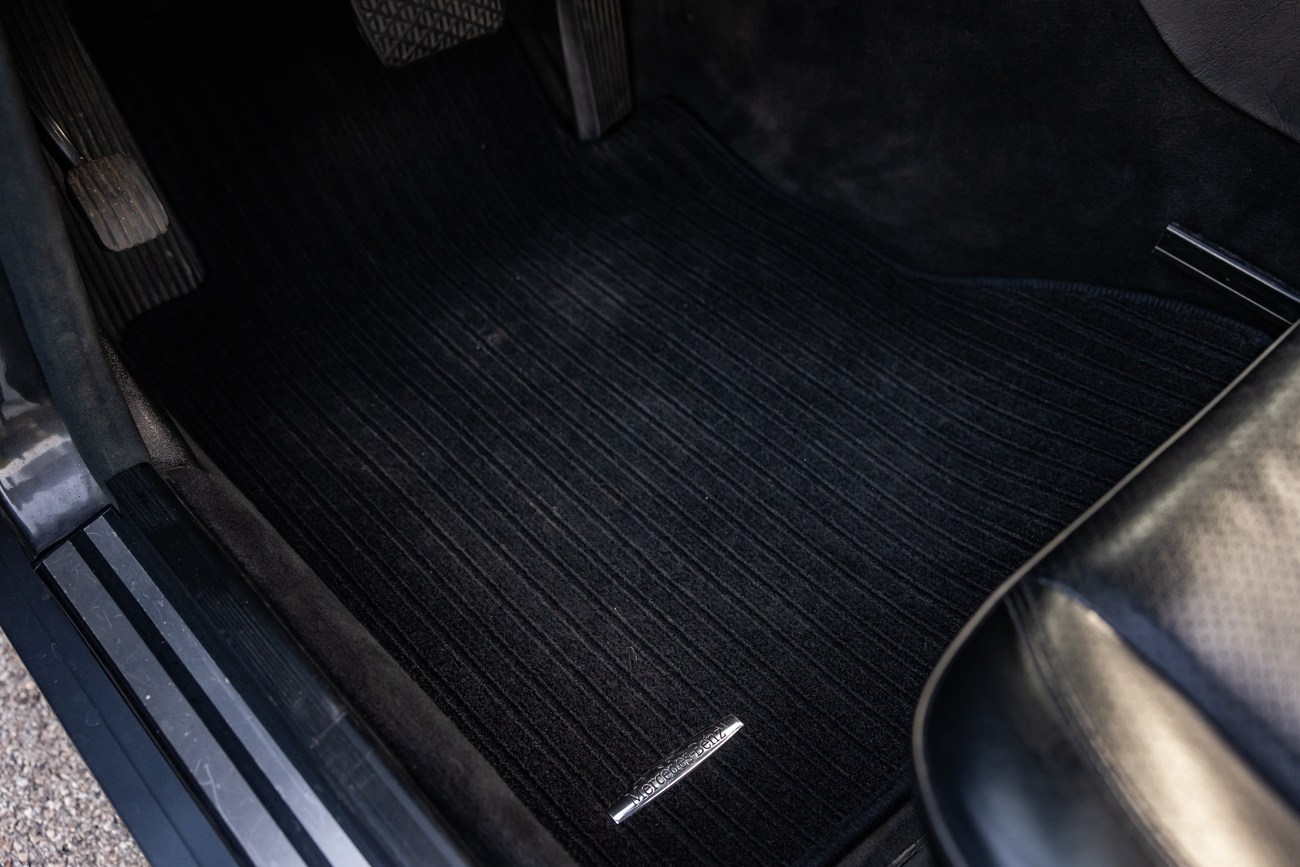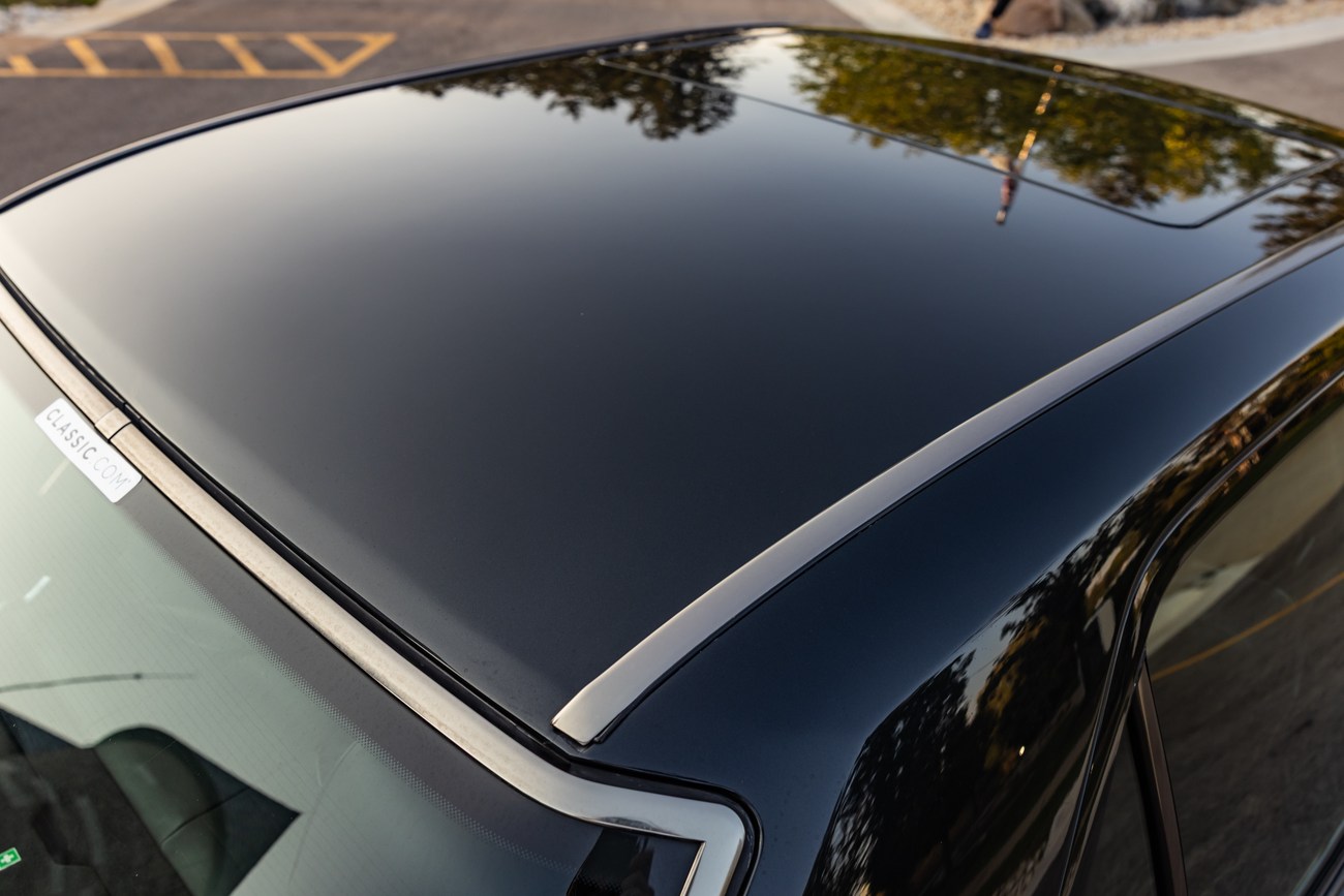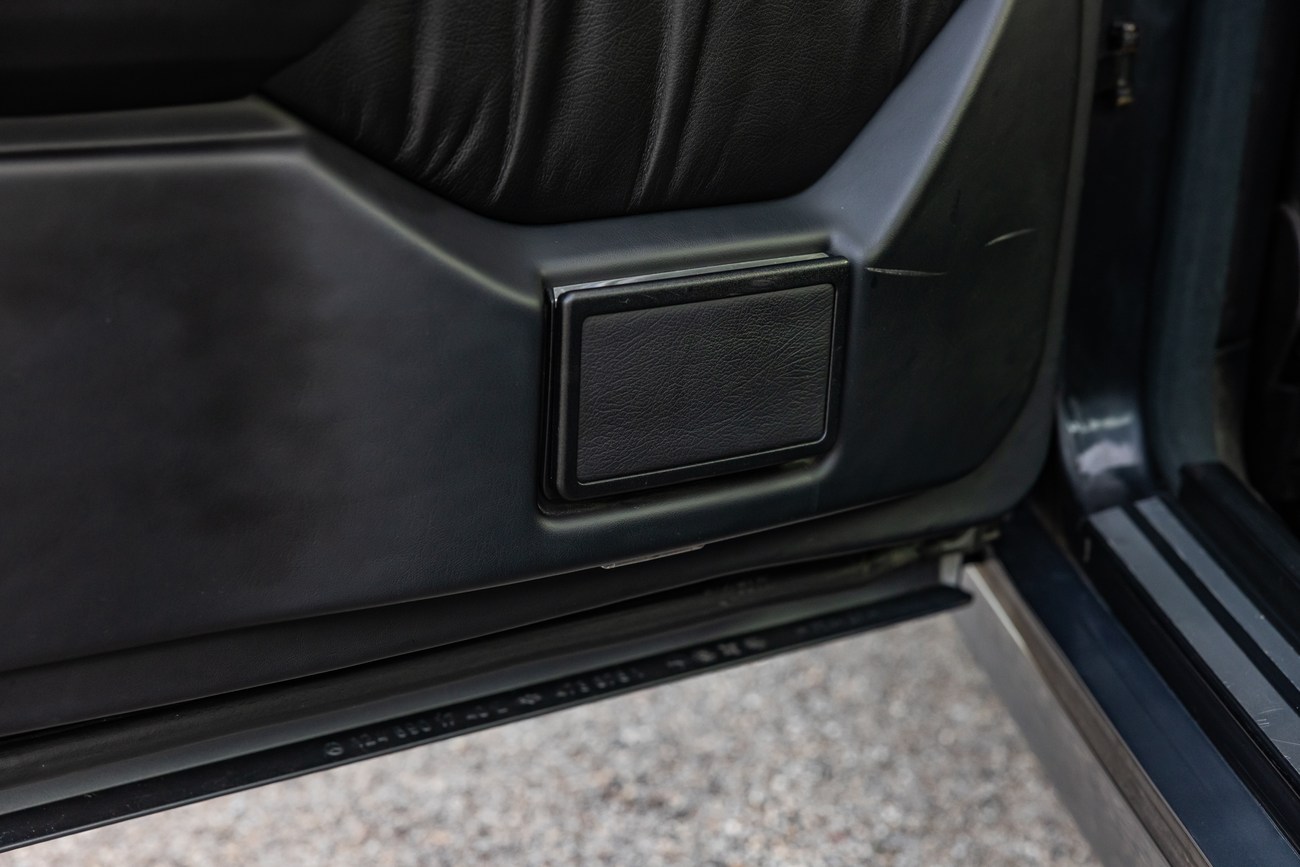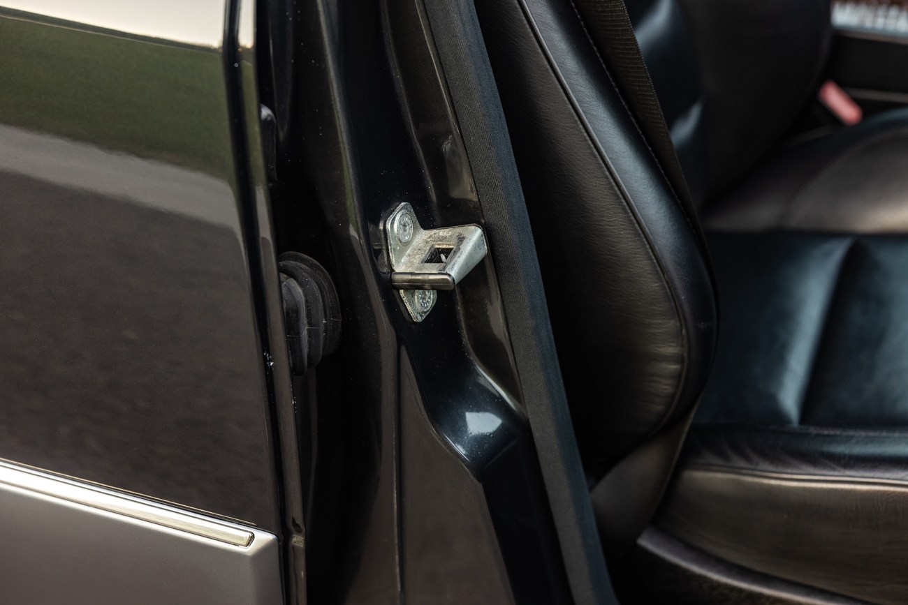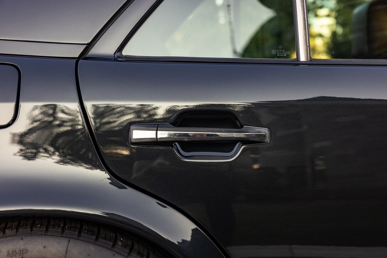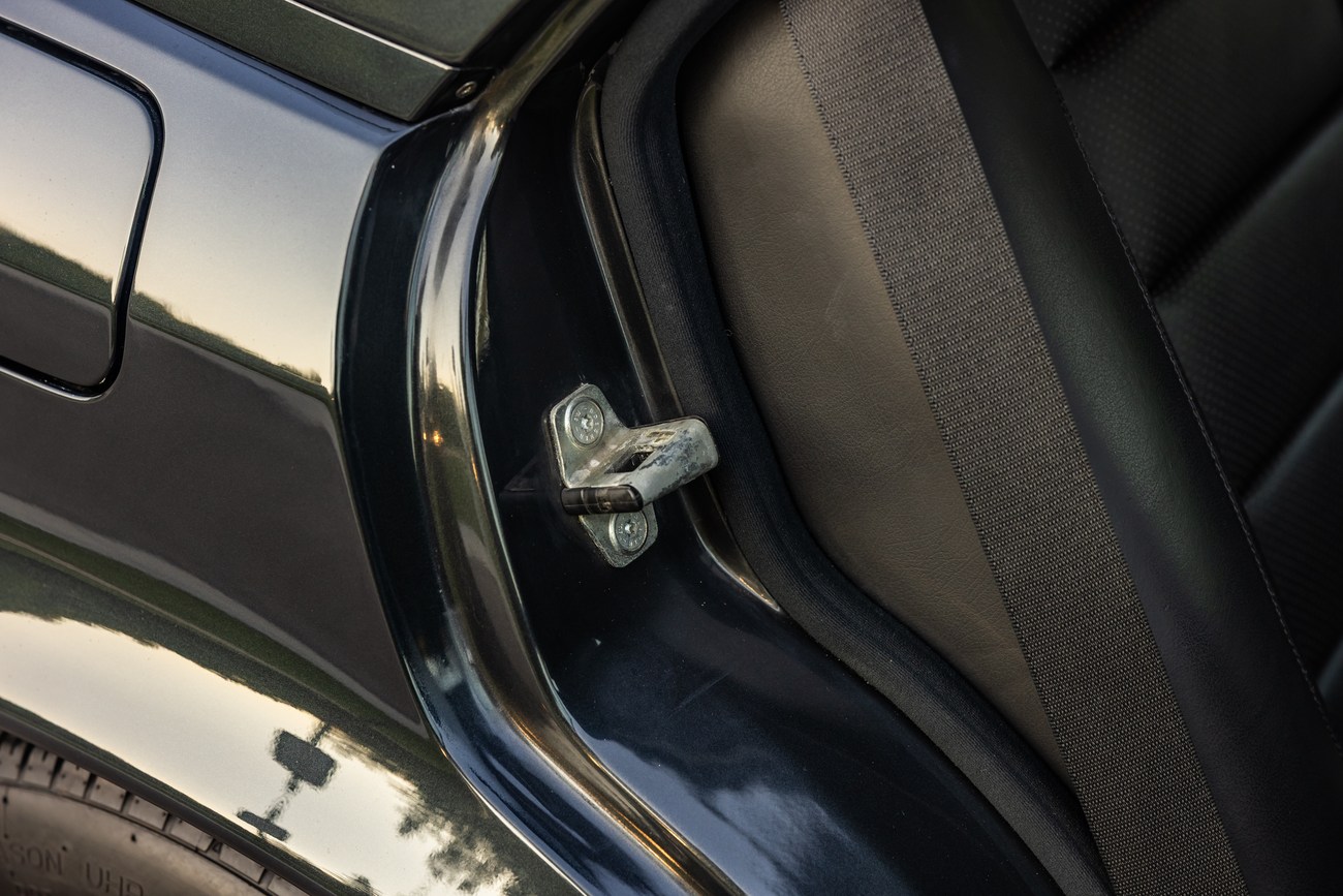 The body is finished in Black Pearl Metallic (199) with grey lower cladding. The 500E was assembled by Porsche and featured wheel arch flares, revised bodywork, and a lower ride height when compared to a standard W124 models. Additional exterior features include original Euro-spec 500E-specific headlights with wipers, integrated fog lights, a retractable antenna, and a power sunroof. The seller notes the lower cladding was refinished and rust repair was performed around the taillights and on the trunk by Michaelian Restoration of Stuart, Florida, in August 2022. The original "500E" badge has been replaced with the updated "E500" lettering on the trunk lid.