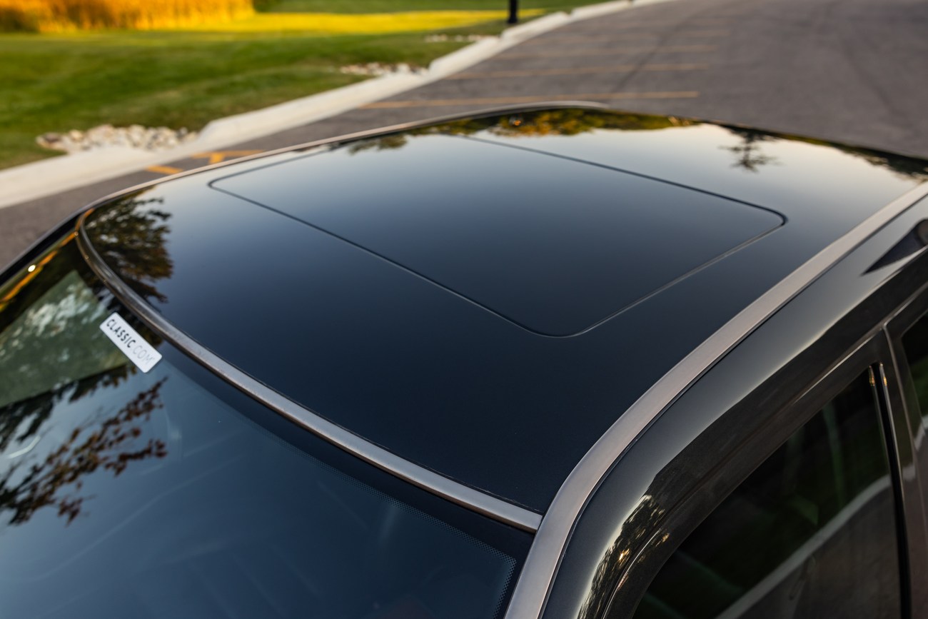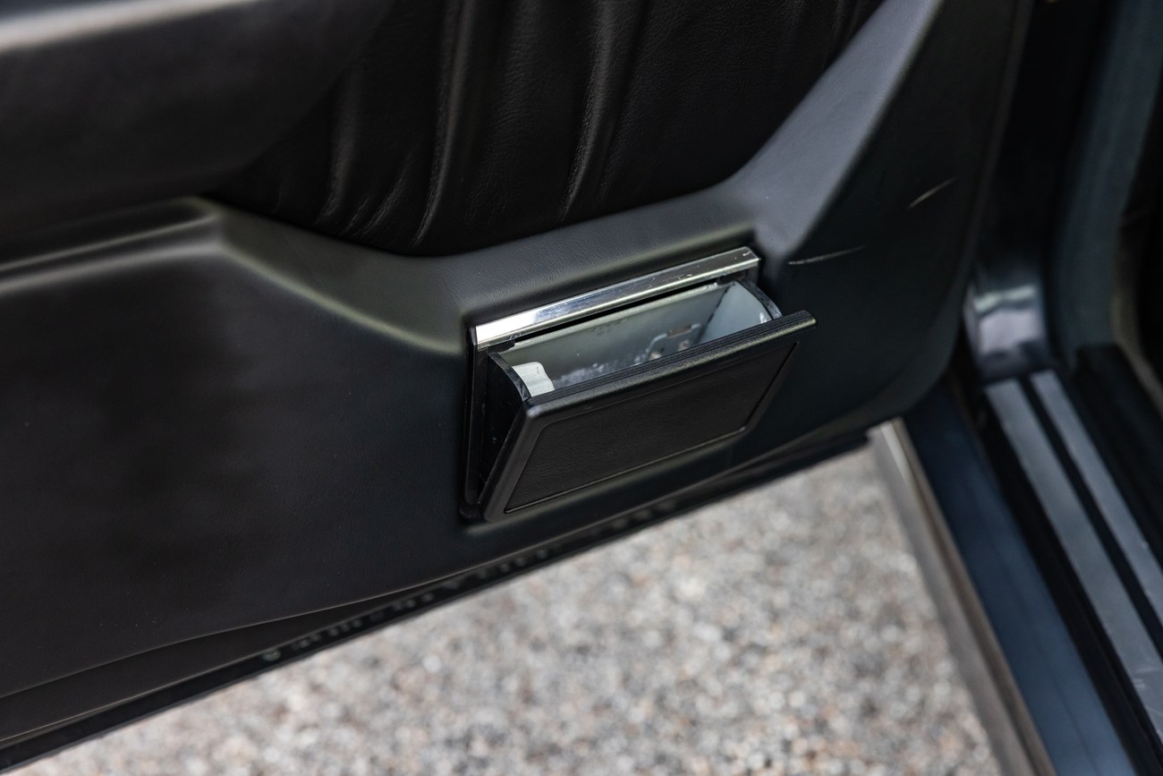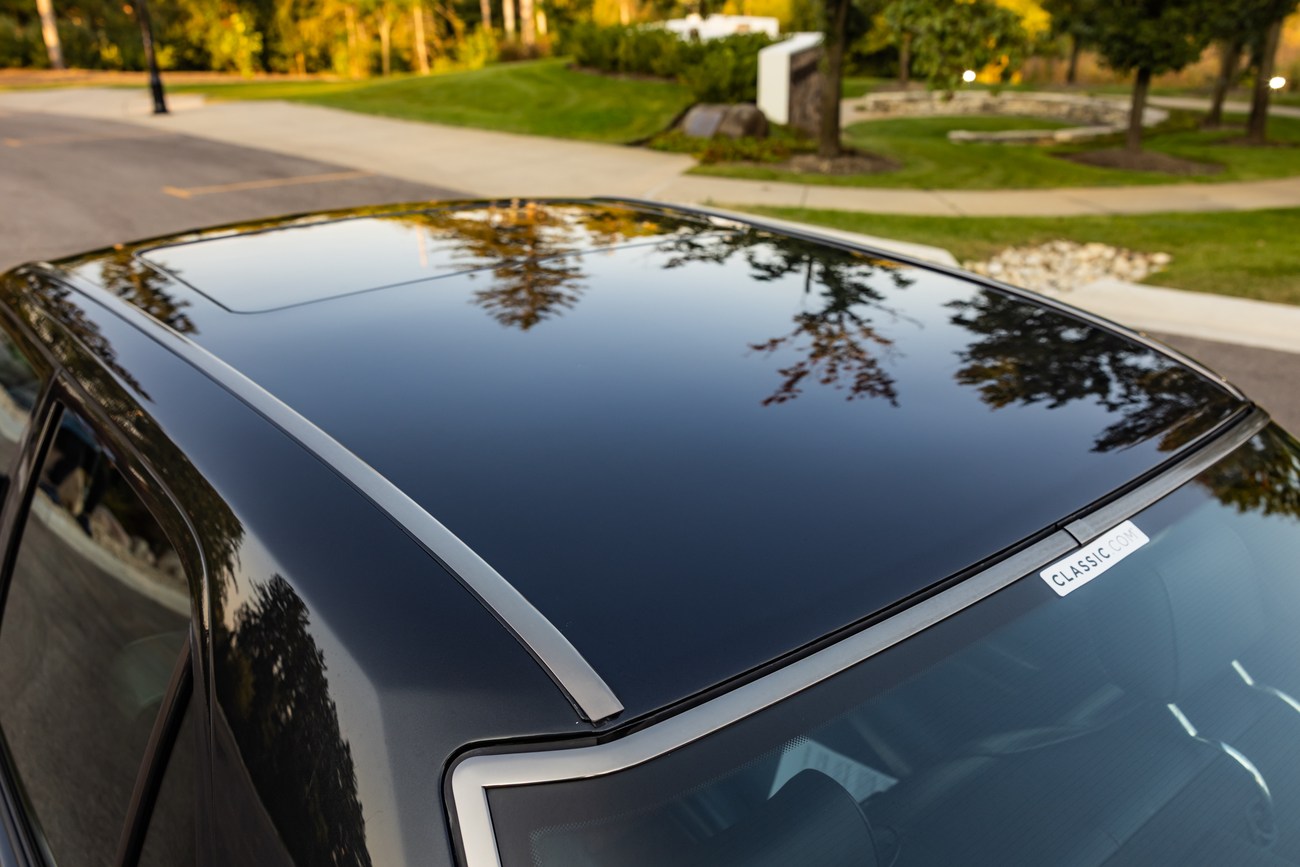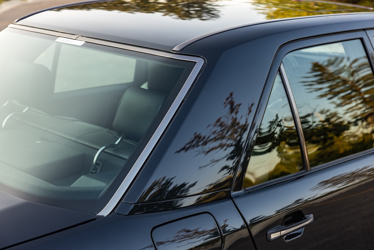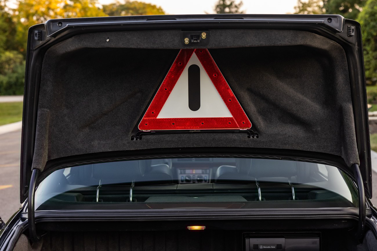 The body is finished in Black Pearl Metallic (199) with grey lower cladding. The 500E was assembled by Porsche and featured wheel arch flares, revised bodywork, and a lower ride height when compared to a standard W124 models. Additional exterior features include original Euro-spec 500E-specific headlights with wipers, integrated fog lights, a retractable antenna, and a power sunroof. The seller notes the lower cladding was refinished and rust repair was performed around the taillights and on the trunk by Michaelian Restoration of Stuart, Florida, in August 2022. The original "500E" badge has been replaced with the updated "E500" lettering on the trunk lid.