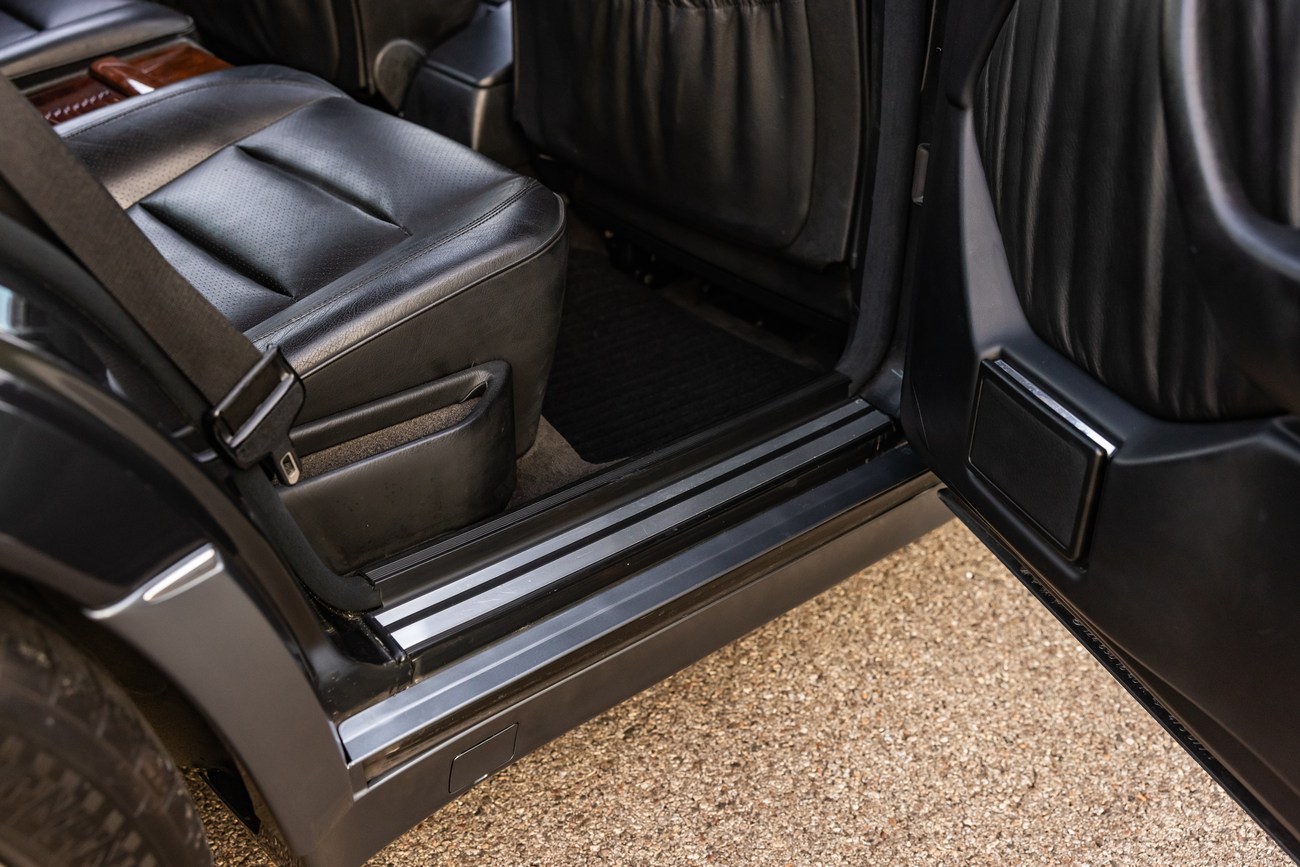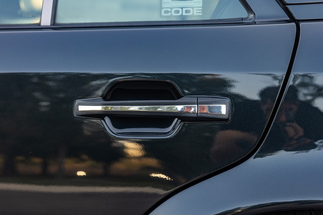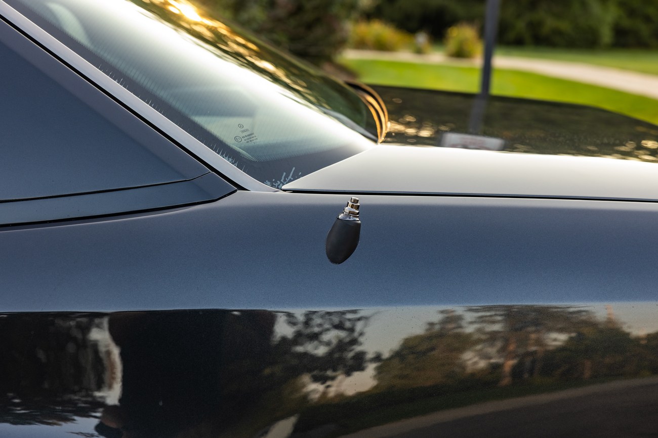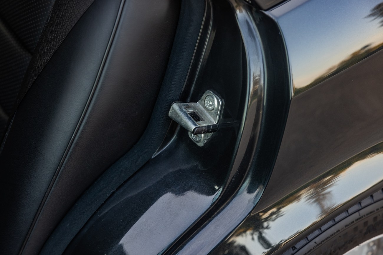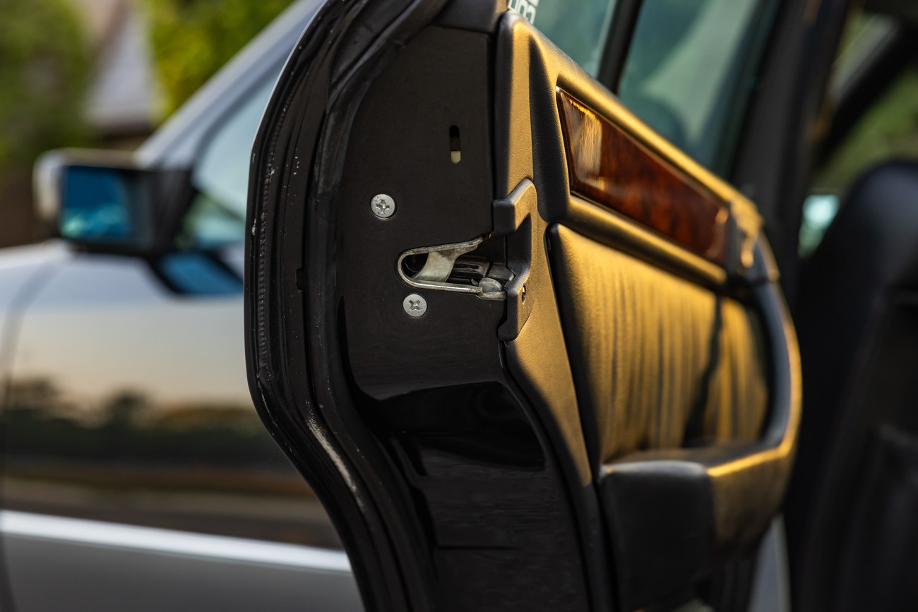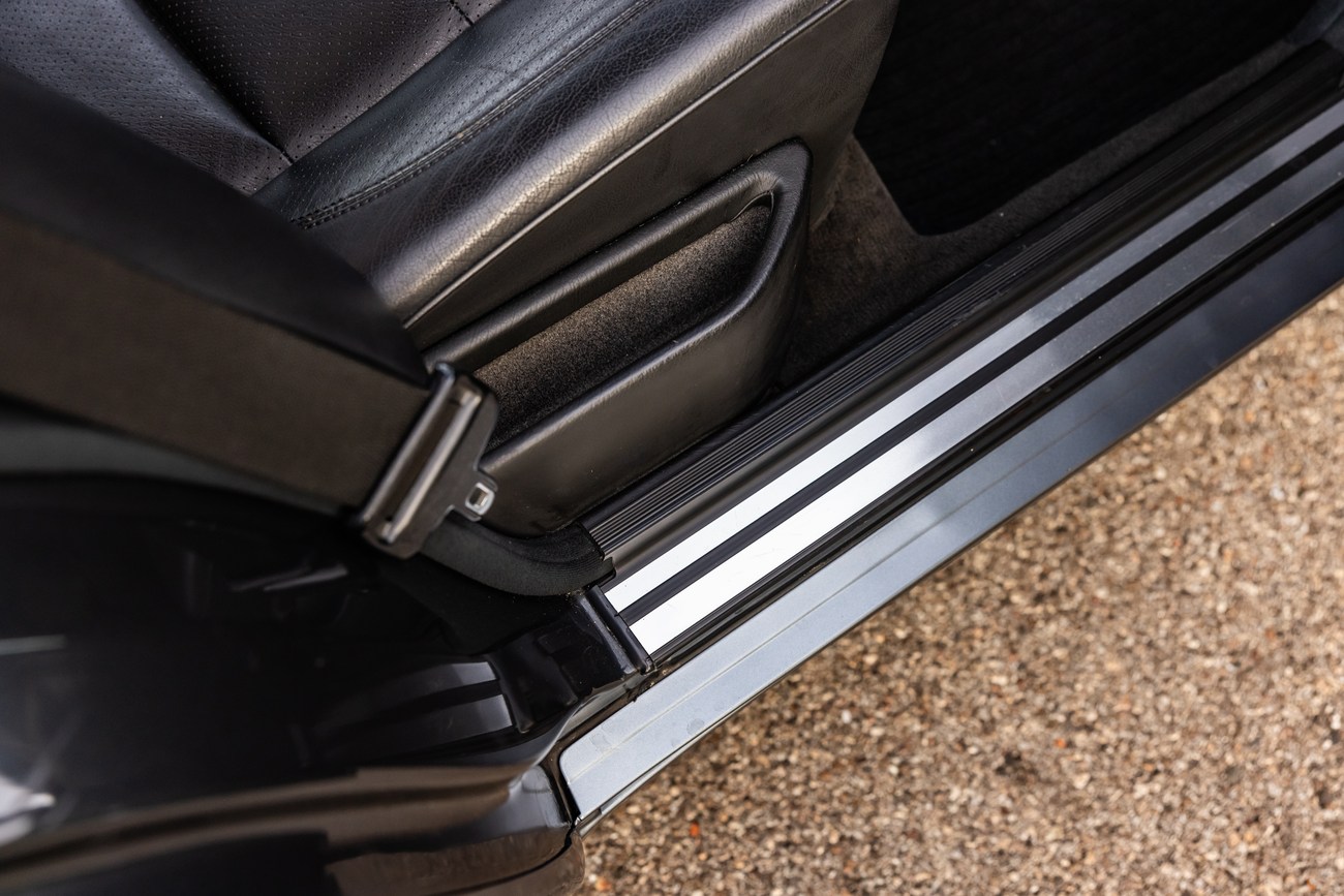 The body is finished in Black Pearl Metallic (199) with grey lower cladding. The 500E was assembled by Porsche and featured wheel arch flares, revised bodywork, and a lower ride height when compared to a standard W124 models. Additional exterior features include original Euro-spec 500E-specific headlights with wipers, integrated fog lights, a retractable antenna, and a power sunroof. The seller notes the lower cladding was refinished and rust repair was performed around the taillights and on the trunk by Michaelian Restoration of Stuart, Florida, in August 2022. The original "500E" badge has been replaced with the updated "E500" lettering on the trunk lid.
