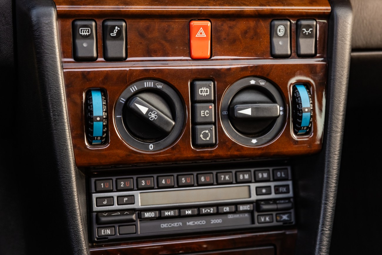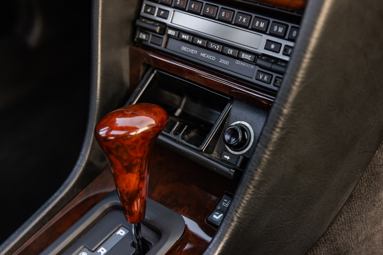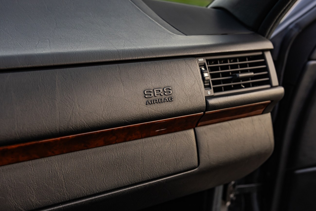 The interior is upholstered in Anthracite Leather (271) and features front and rear bucket seats. Amenities include heated and power-adjustable front seats, automatic climate control, a Becker cassette stereo, a power-adjustable steering column, dual front airbags, and cruise control. Burl wood trim adorns dashboard, center console, and each door.