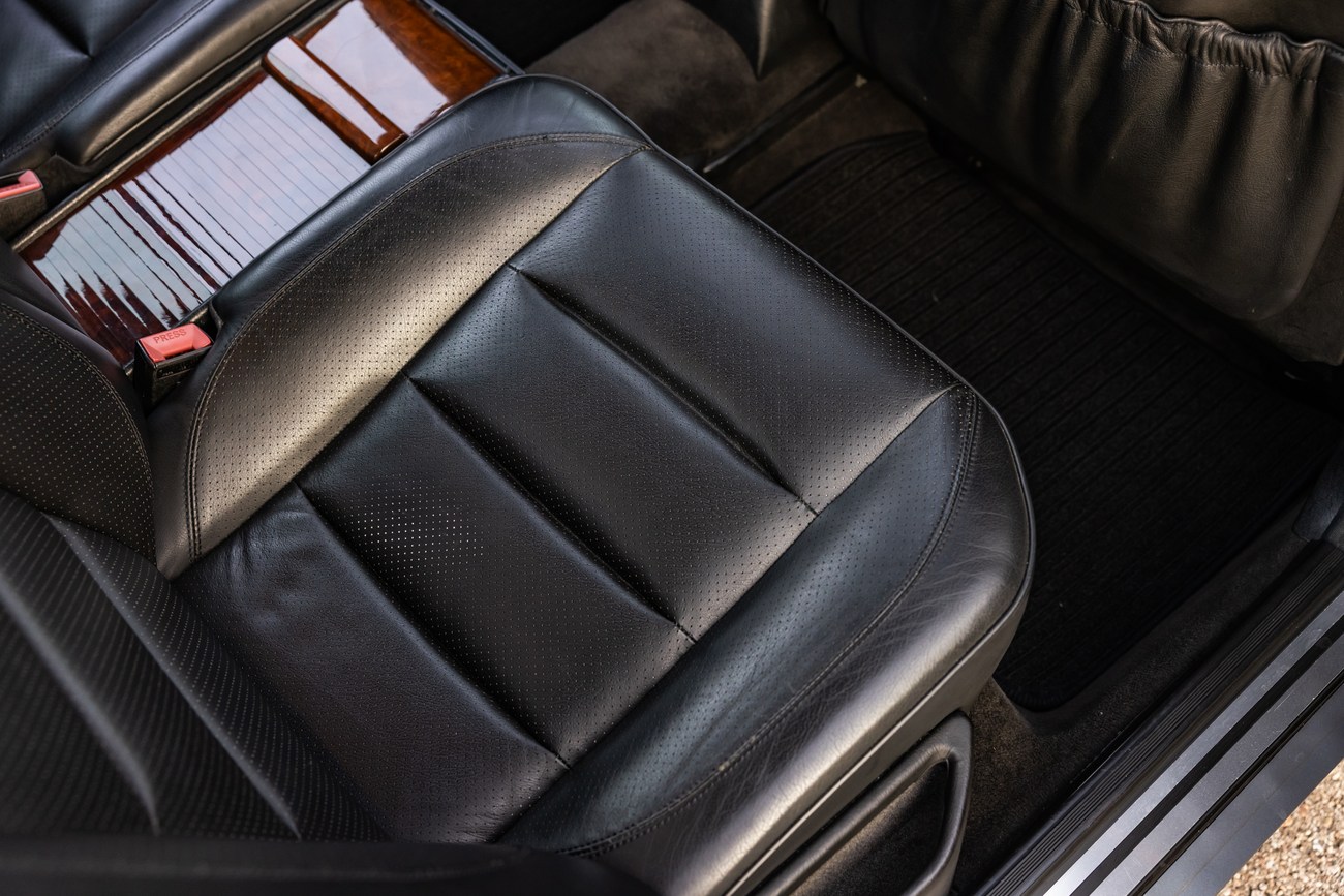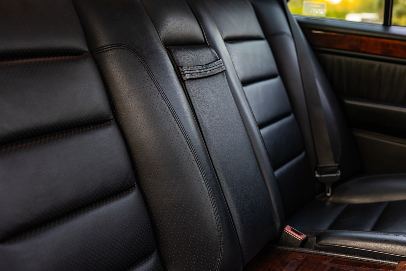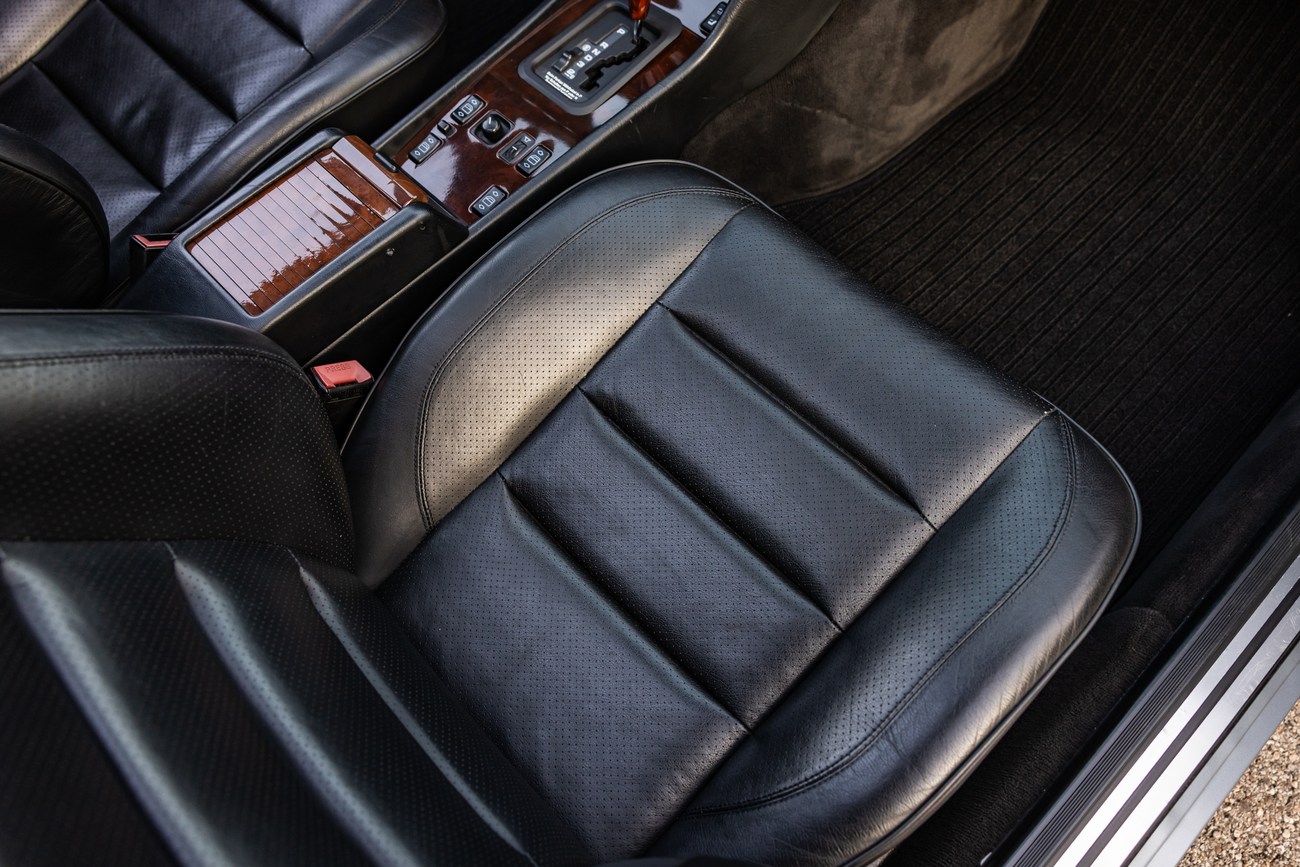The interior is upholstered in Anthracite Leather (271) and features front and rear bucket seats. Amenities include heated and power-adjustable front seats, automatic climate control, a Becker cassette stereo, a power-adjustable steering column, dual front airbags, and cruise control. Burl wood trim adorns dashboard, center console, and each door.