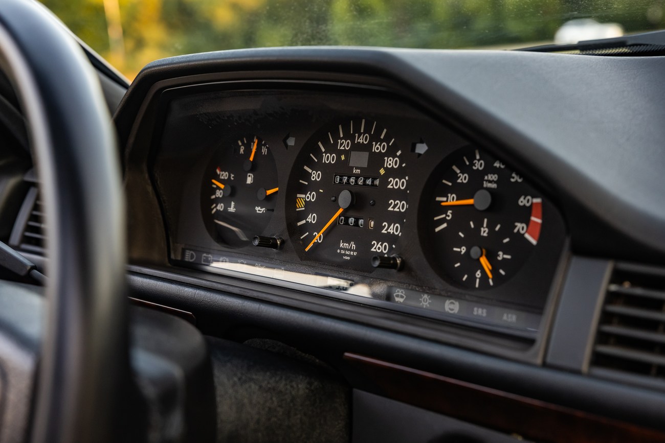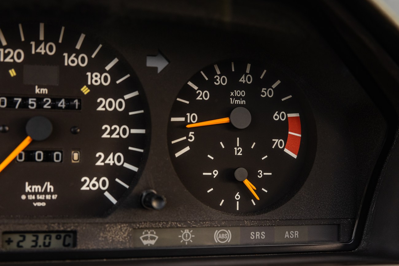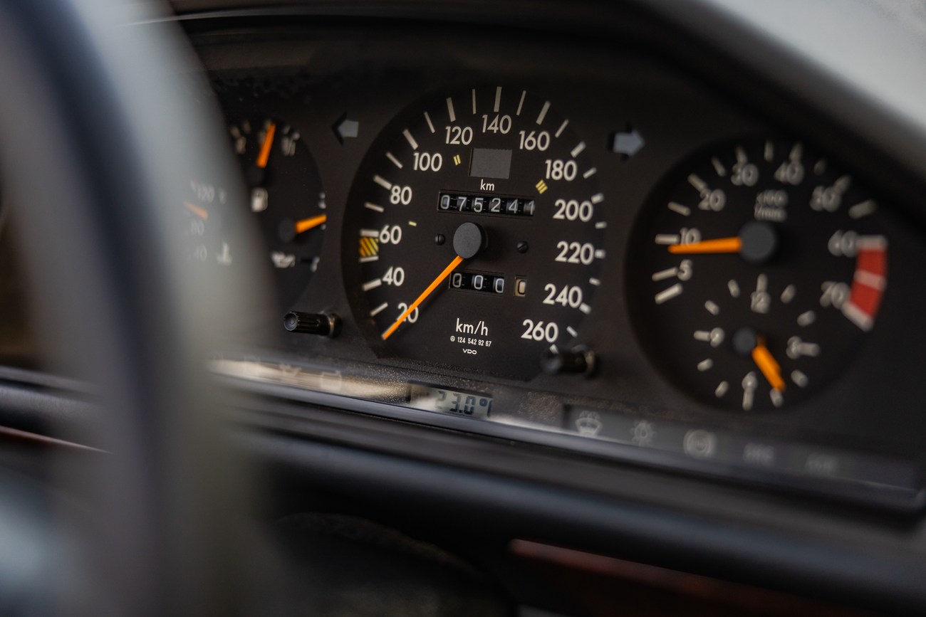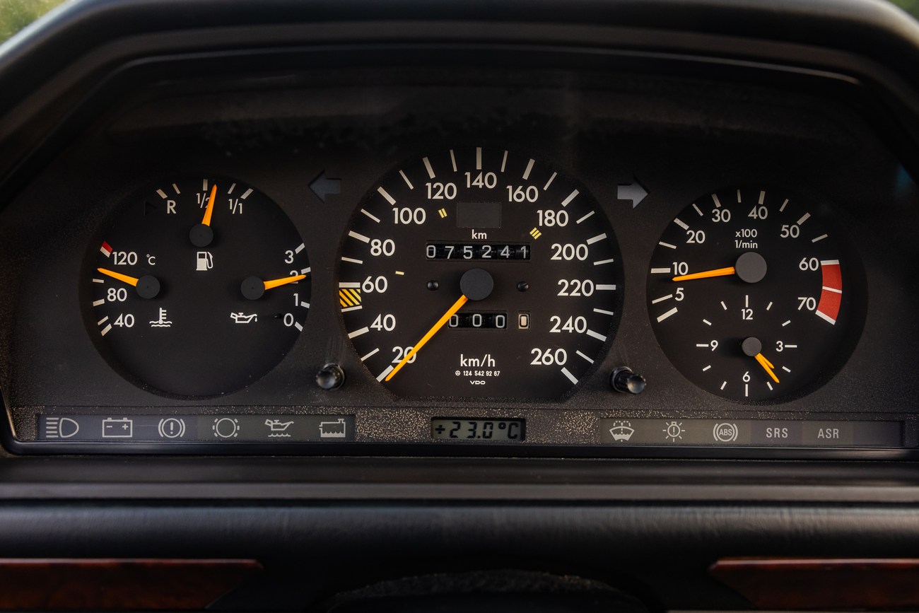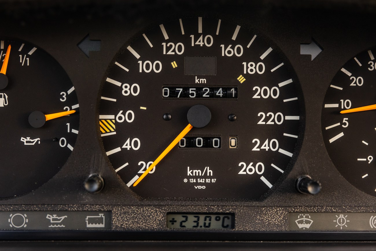 The four-spoke leather-wrapped steering wheel frames a 260-km/h speedometer, a tachometer with a 6k-rpm redline, an analog clock, and gauges for oil pressure, coolant temperature, and fuel level. The six-digit odometer shows 75k kilometers (~47k miles).
