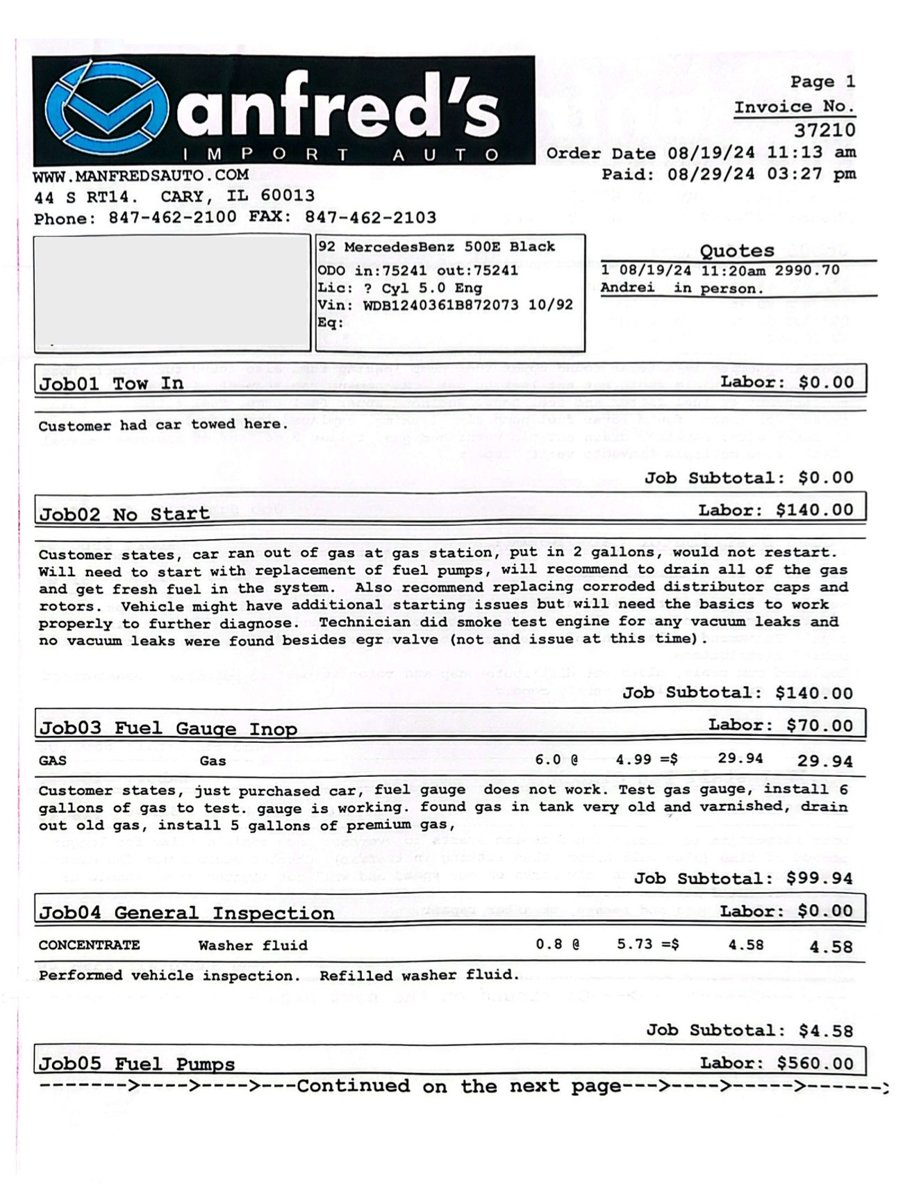This 1992 Mercedes-Benz 500E is a European-market example that was imported from France to the US in 2021. The seller acquired the car in May 2024 and the car now shows 75k kilometers (~47k miles). Finished in Black Pearl Metallic (199) over Anthracite Leather (271) upholstery, power is provided by a 5.0-liter M119 V8 paired with a four-speed automatic transmission. Equipment includes factory alloy wheels, a power sunroof, fog lights, Automatic Slip Control, automatic climate control, a Becker cassette stereo, heated power-adjustable front seats, and cruise control. Maintenance performed between 2022-2023 involved replacing the front shocks and springs, tie rods, air conditioning compressor and receiver/drier, and spark plugs. The most recent service in August 2024 included the replacement of the camshaft seals, distributor caps and rotor, and clutch fan, along with a new fuel filter, fuel pump, and fuel lines. This W124 500E is now offered with the owner’s manual, service records, a tool kit, a clean Carfax report, and a clean Illinois title.