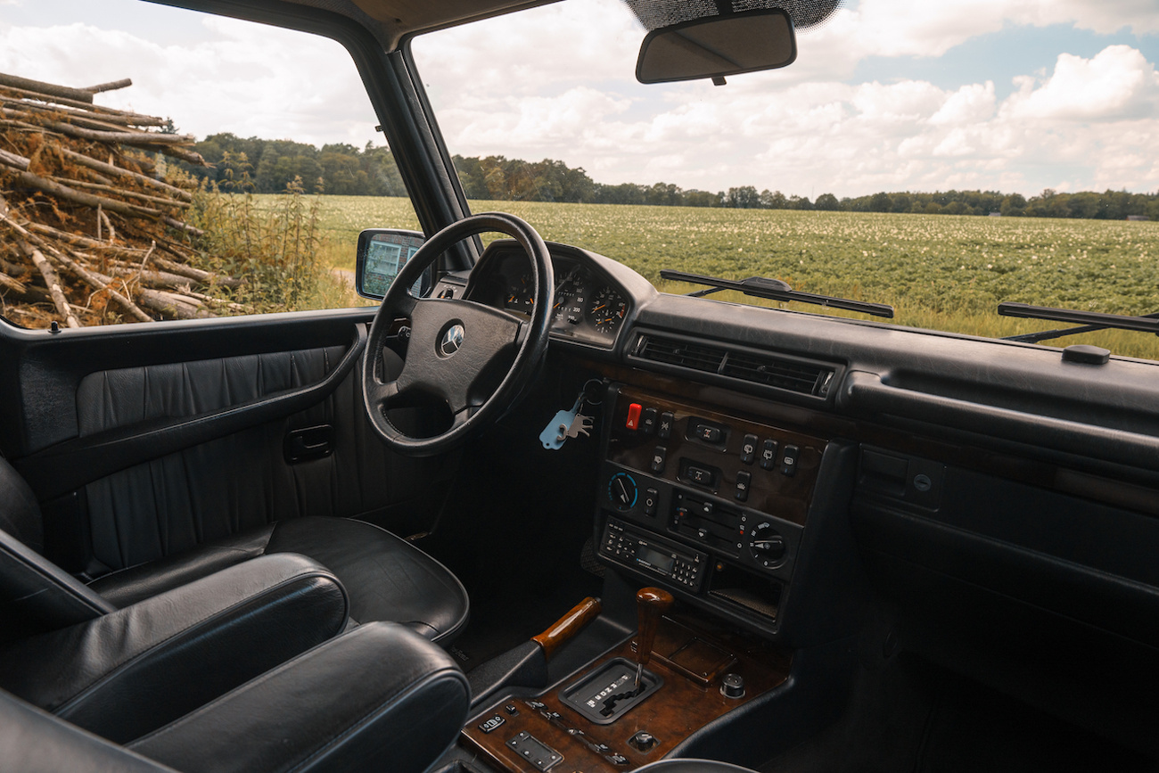 The interior is trimmed in two-tone Black and Gray Leather with matching door cards and Burled Walnut veneer accents the door panels, dashboard, center console, and sunroof controls. All upholstery and wood presents in original condition with no major blemishes. Amenities include air conditioning, differential lockers, a power sunroof, power seats, heated front seats, and a period Blaupunkt head unit.
