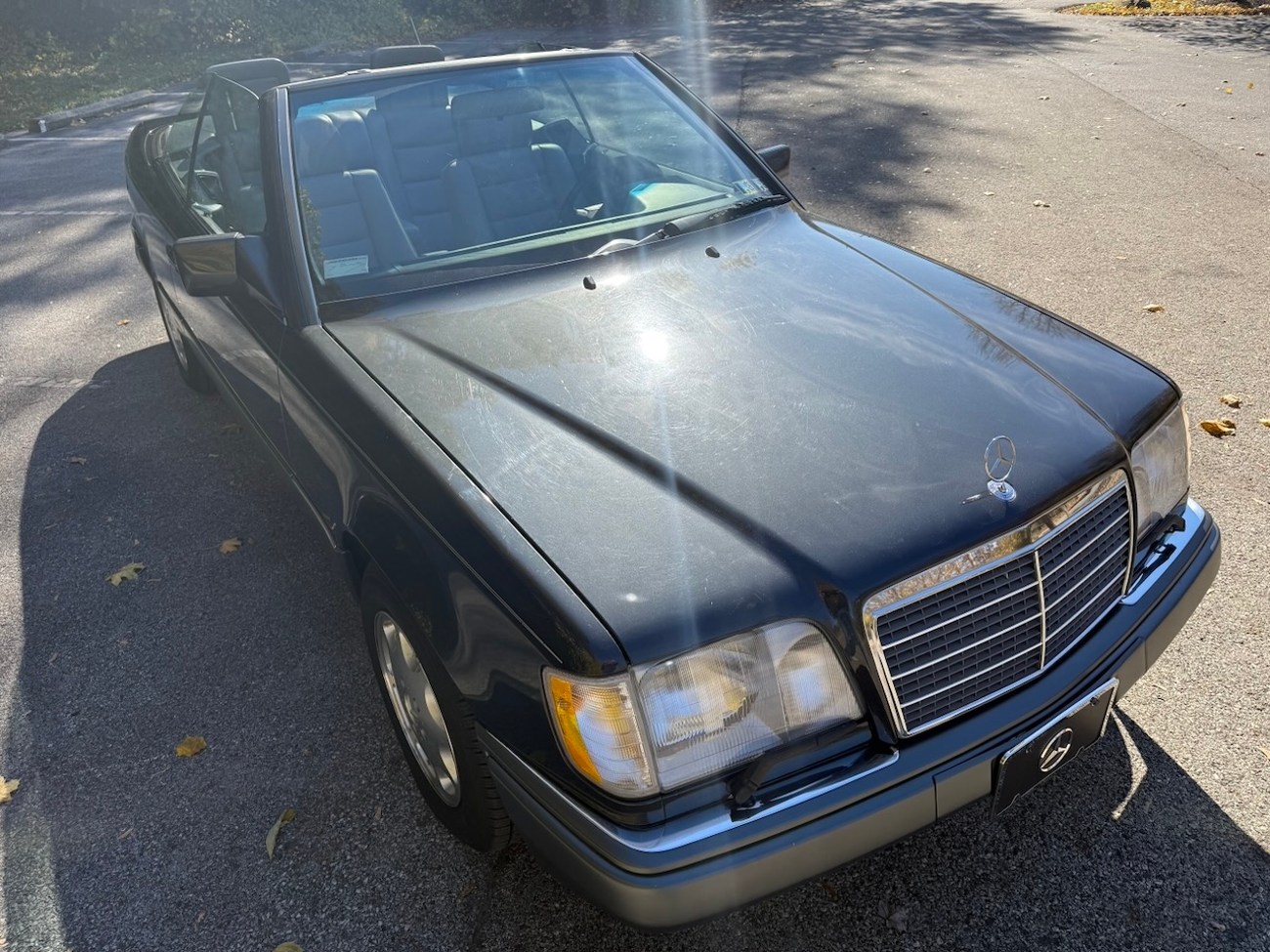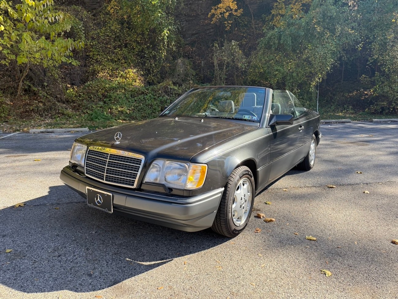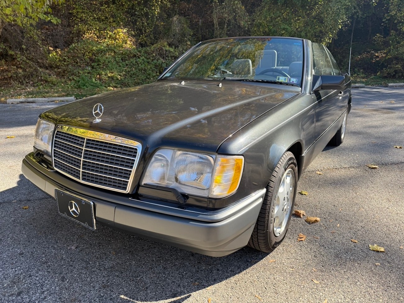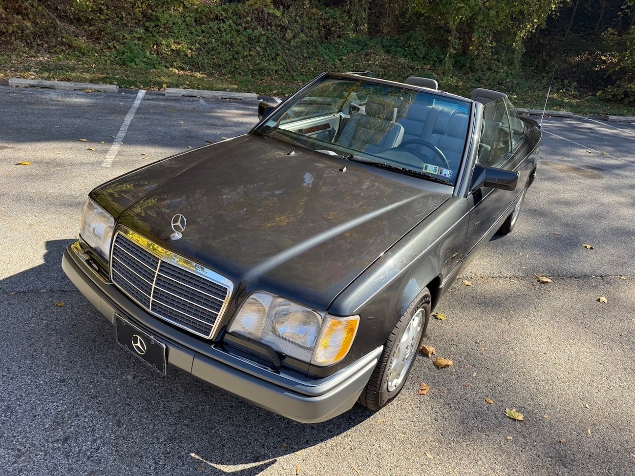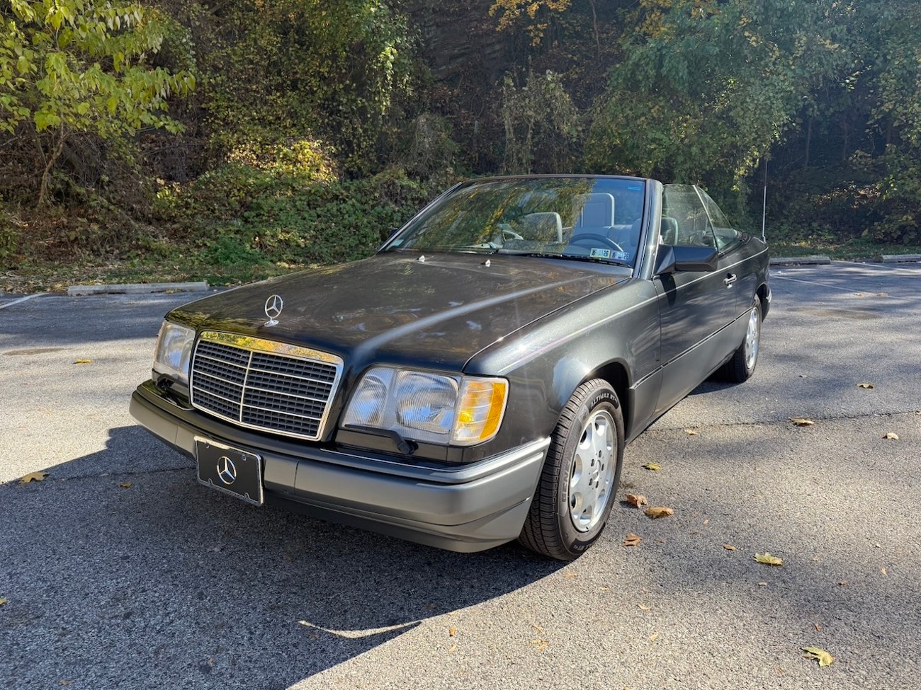 This 1995 Mercedes-Benz E320 Cabriolet was initially sold in Florida and shows subsequent registration in Illinois and Pennsylvania most recently. The current owner purchased the car in early 2025 and the odometer shows an original 75k miles. Finished in Black Pearl Metallic (199) over Gray Leather (268), power is provided by a 3.2-liter inline-six paired with a four-speed automatic transmission driving the rear wheels. Equipment includes heated and power-adjustable front seats with memory, a power-operated black soft top, power mirrors, cruise control, a driver and passenger airbag, central locking, and an aftermarket head unit. The included Carfax report shows 18 service records and no accident damage. Big service items are a new valve cover gasket, oil pressure sending unit, front brake pads and rotors, a new power antenna, a new coolant temp sensor, a new blower motor, and regular maintenance. This cabrio is offered for sale by the current owner in Pennsylvania with one key, factory literature, recent service records, a clean Carfax, and a clean PA title.