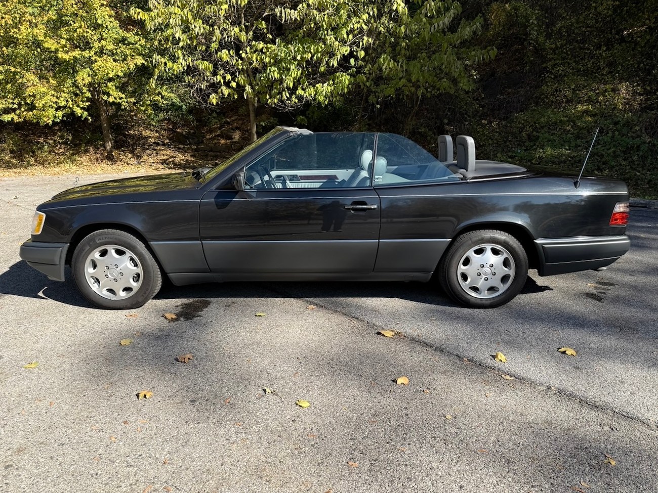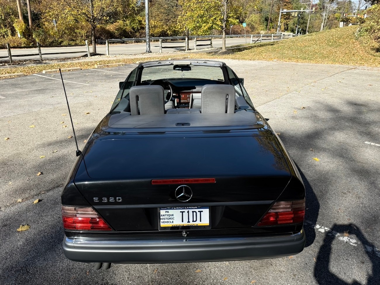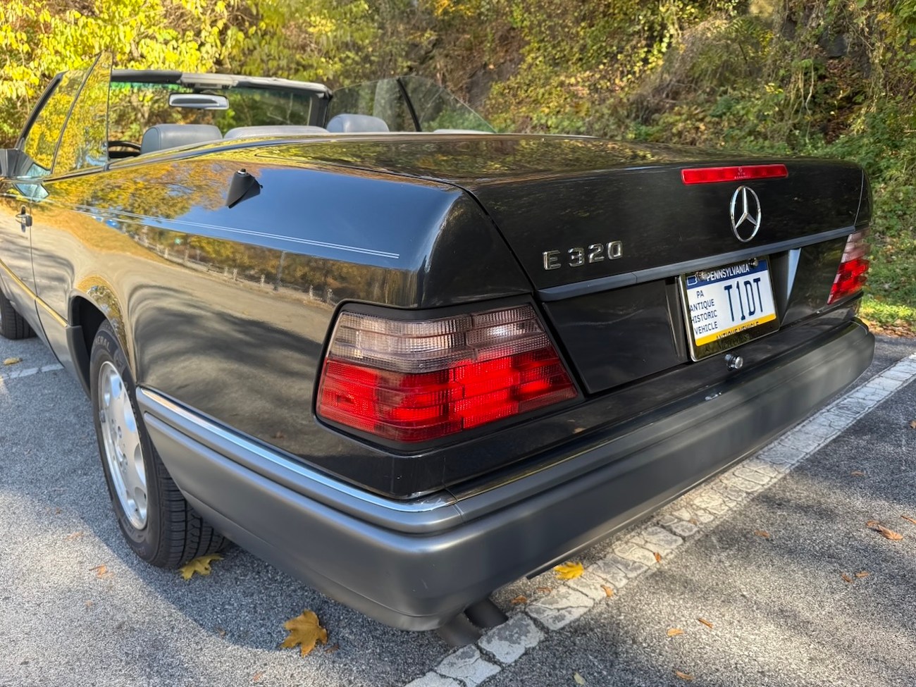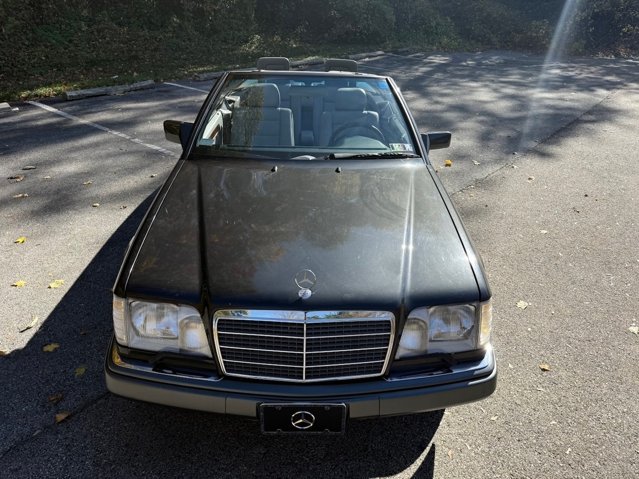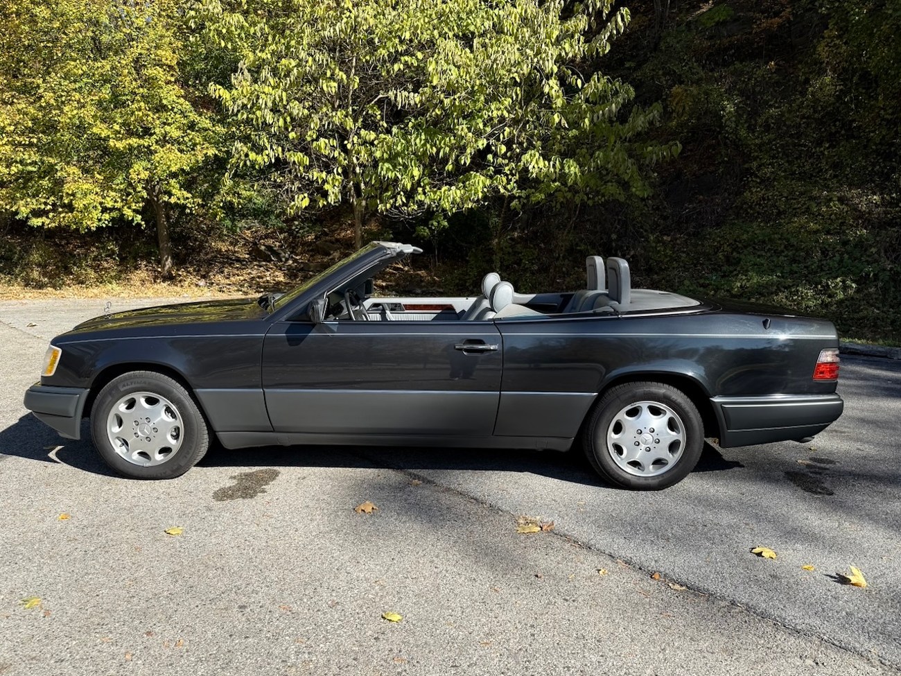 This 1995 Mercedes-Benz E320 Cabriolet was initially sold in Florida and shows subsequent registration in Illinois and Pennsylvania most recently. The current owner purchased the car in early 2025 and the odometer shows an original 75k miles. Finished in Black Pearl Metallic (199) over Gray Leather (268), power is provided by a 3.2-liter inline-six paired with a four-speed automatic transmission driving the rear wheels. Equipment includes heated and power-adjustable front seats with memory, a power-operated black soft top, power mirrors, cruise control, a driver and passenger airbag, central locking, and an aftermarket head unit. The included Carfax report shows 18 service records and no accident damage. Big service items are a new valve cover gasket, oil pressure sending unit, front brake pads and rotors, a new power antenna, a new coolant temp sensor, a new blower motor, and regular maintenance. This cabrio is offered for sale by the current owner in Pennsylvania with one key, factory literature, recent service records, a clean Carfax, and a clean PA title.