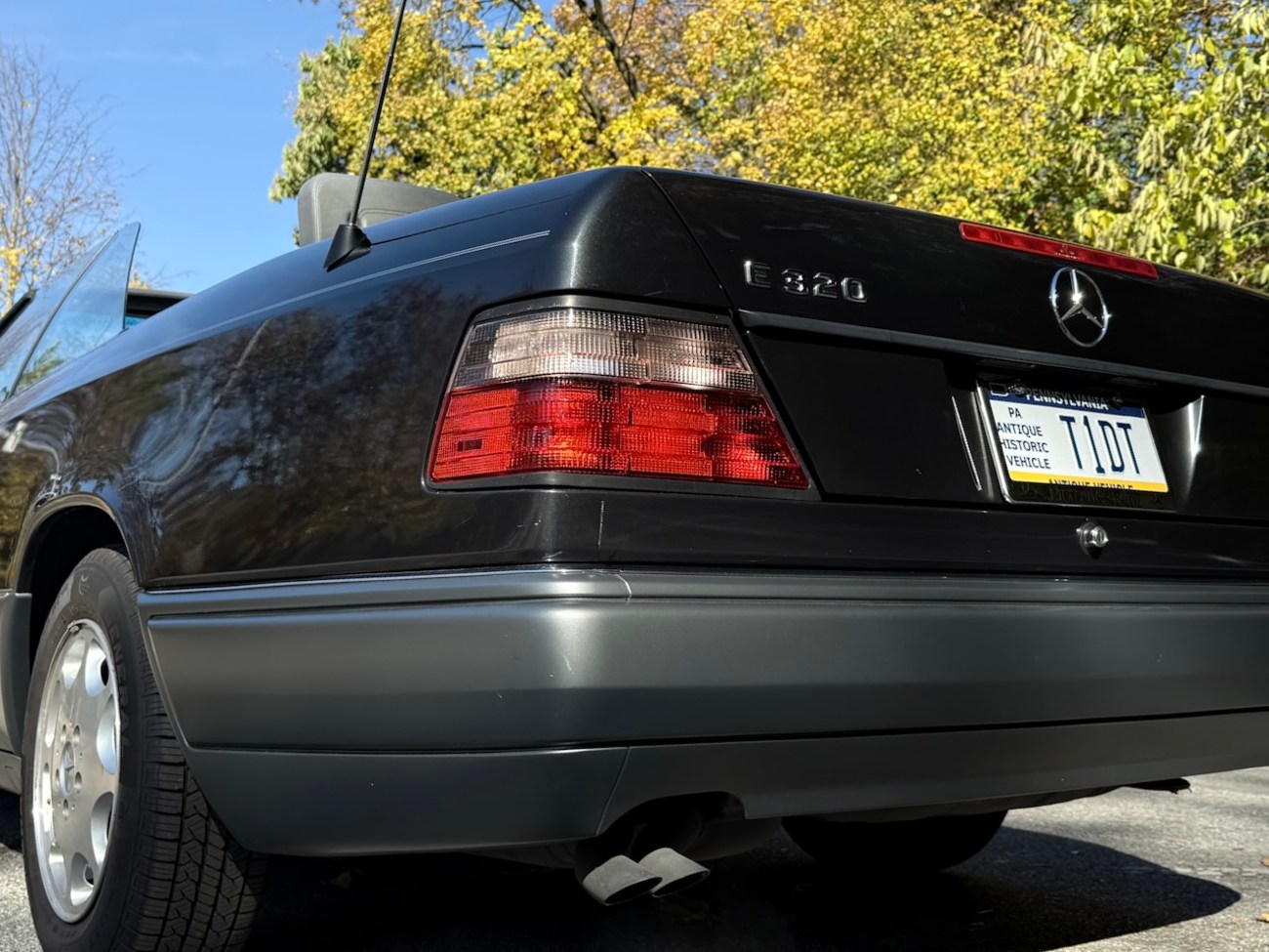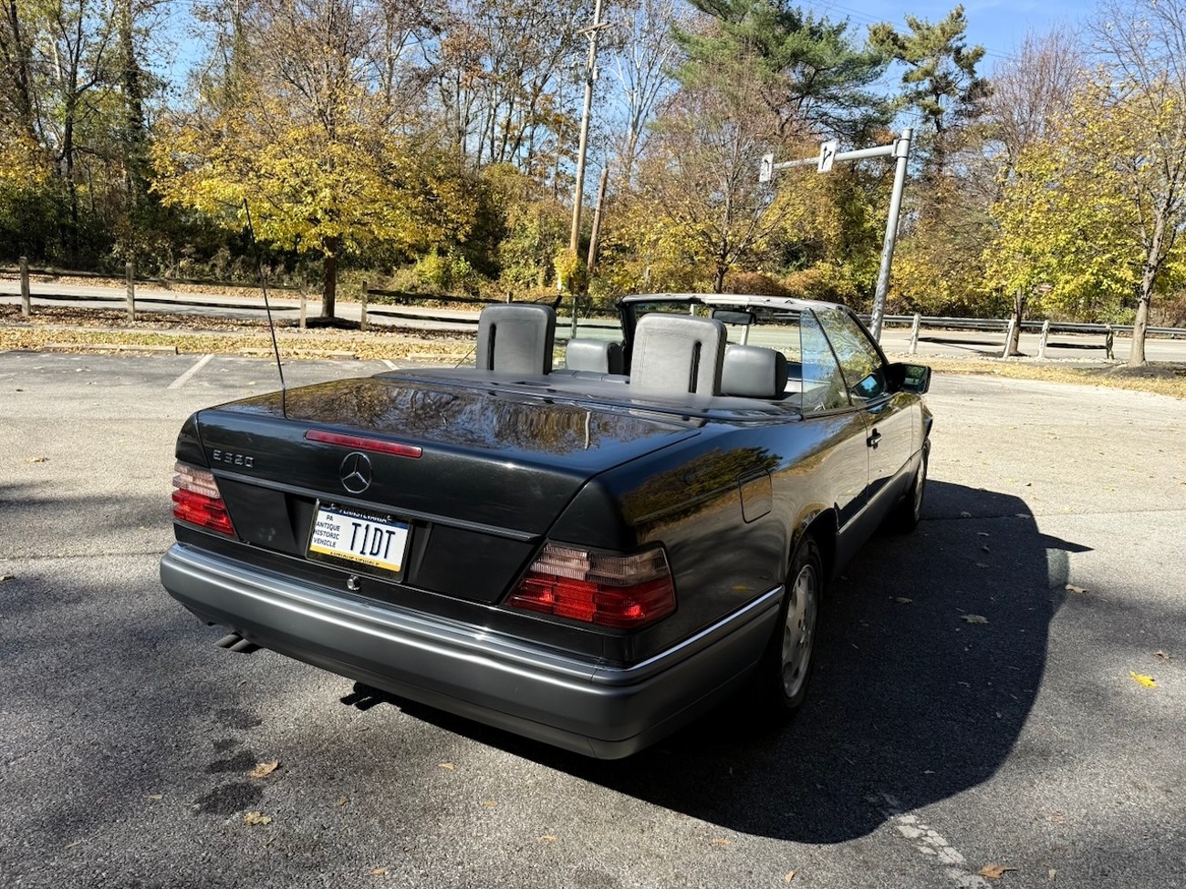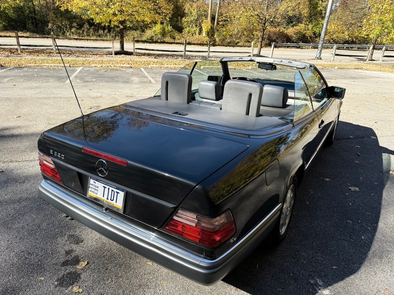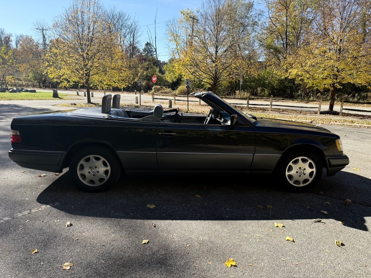 This 1995 Mercedes-Benz E320 Cabriolet was initially sold in Florida and shows subsequent registration in Illinois and Pennsylvania most recently. The current owner purchased the car in early 2025 and the odometer shows an original 75k miles. Finished in Black Pearl Metallic (199) over Gray Leather (268), power is provided by a 3.2-liter inline-six paired with a four-speed automatic transmission driving the rear wheels. Equipment includes heated and power-adjustable front seats with memory, a power-operated black soft top, power mirrors, cruise control, a driver and passenger airbag, central locking, and an aftermarket head unit. The included Carfax report shows 18 service records and no accident damage. Big service items are a new valve cover gasket, oil pressure sending unit, front brake pads and rotors, a new power antenna, a new coolant temp sensor, a new blower motor, and regular maintenance. This cabrio is offered for sale by the current owner in Pennsylvania with one key, factory literature, recent service records, a clean Carfax, and a clean PA title.