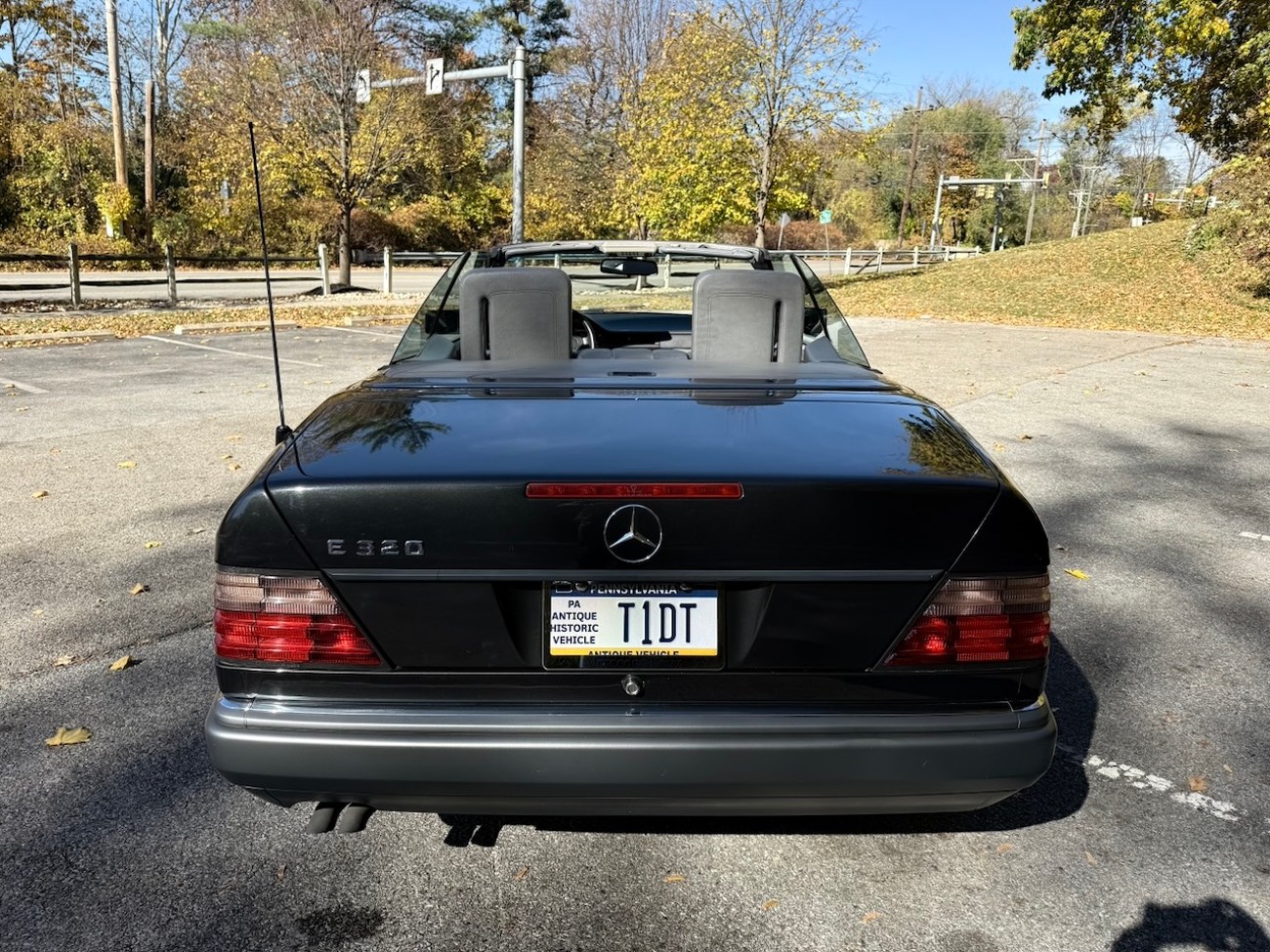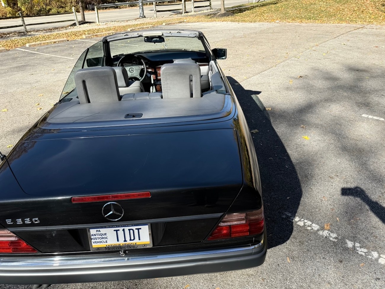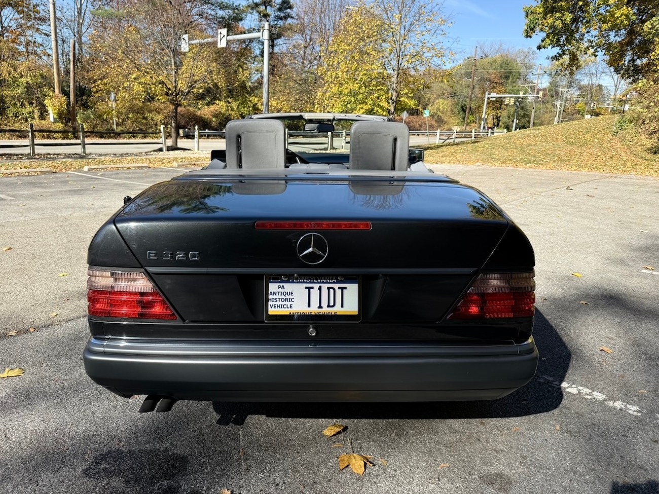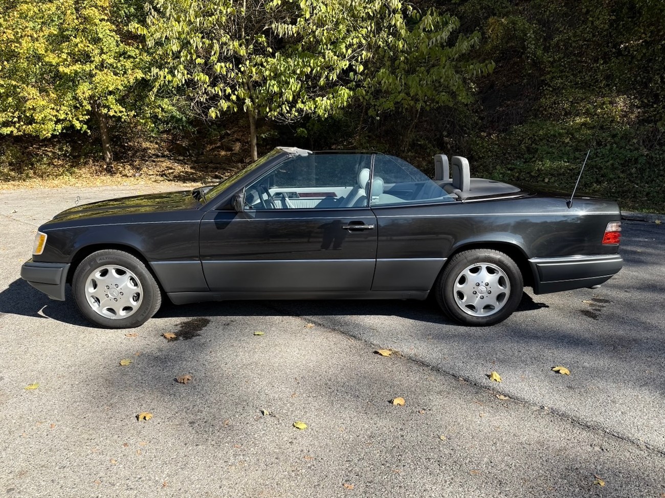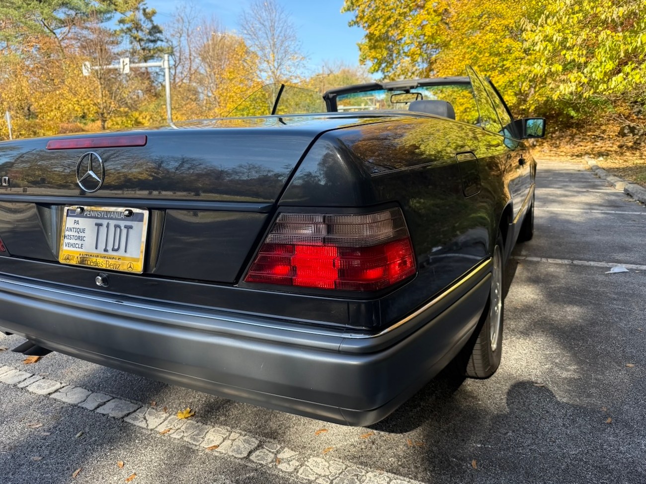 This 1995 Mercedes-Benz E320 Cabriolet was initially sold in Florida and shows subsequent registration in Illinois and Pennsylvania most recently. The current owner purchased the car in early 2025 and the odometer shows an original 75k miles. Finished in Black Pearl Metallic (199) over Gray Leather (268), power is provided by a 3.2-liter inline-six paired with a four-speed automatic transmission driving the rear wheels. Equipment includes heated and power-adjustable front seats with memory, a power-operated black soft top, power mirrors, cruise control, a driver and passenger airbag, central locking, and an aftermarket head unit. The included Carfax report shows 18 service records and no accident damage. Big service items are a new valve cover gasket, oil pressure sending unit, front brake pads and rotors, a new power antenna, a new coolant temp sensor, a new blower motor, and regular maintenance. This cabrio is offered for sale by the current owner in Pennsylvania with one key, factory literature, recent service records, a clean Carfax, and a clean PA title.
