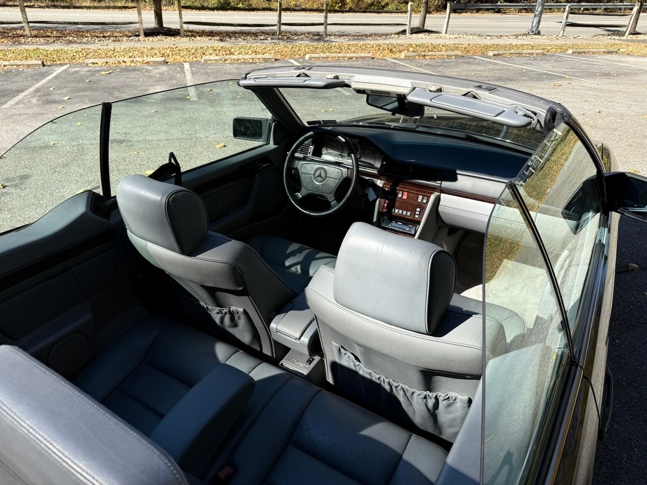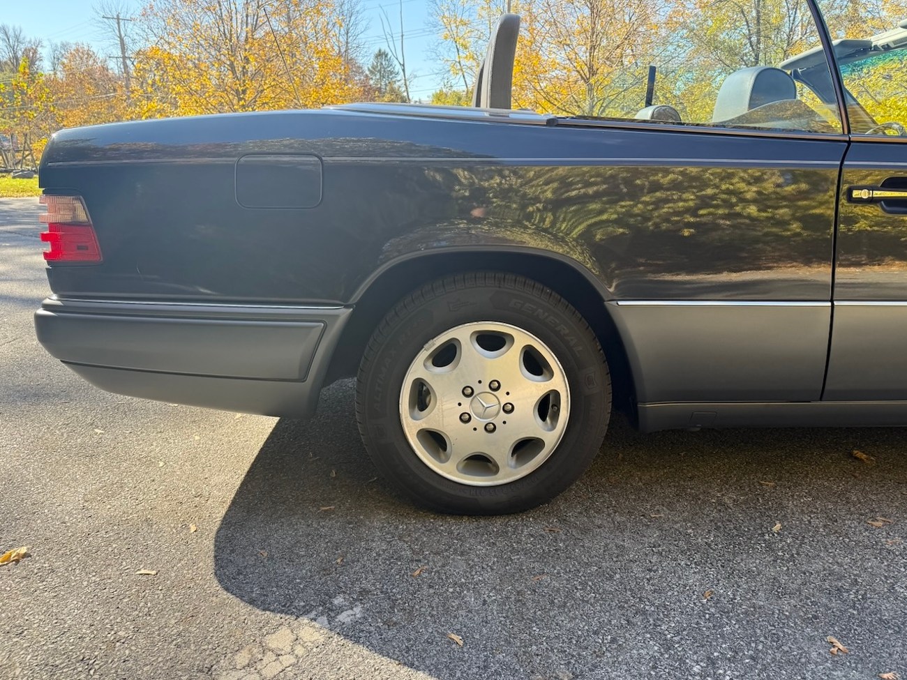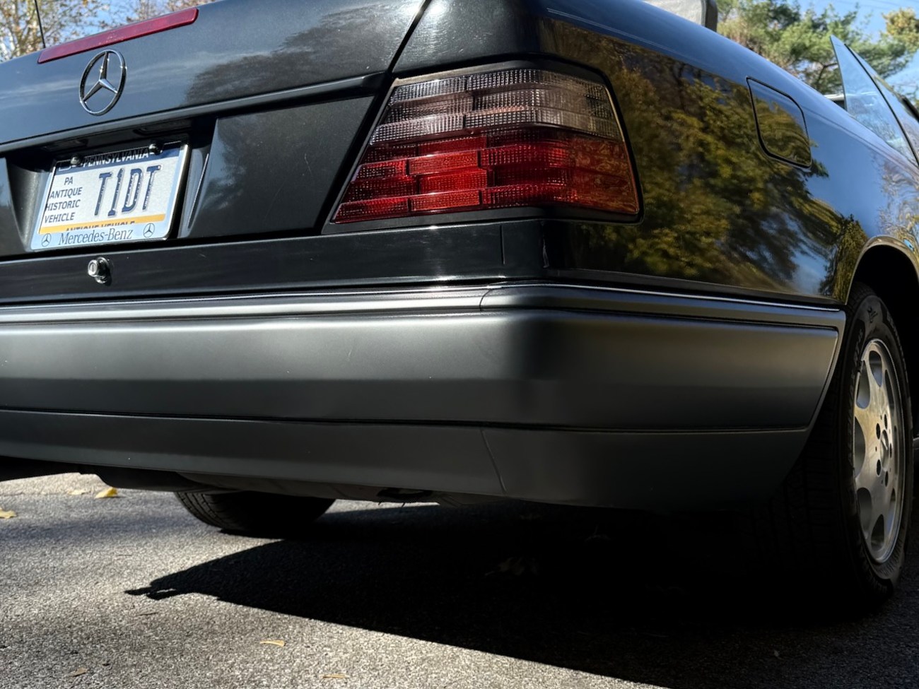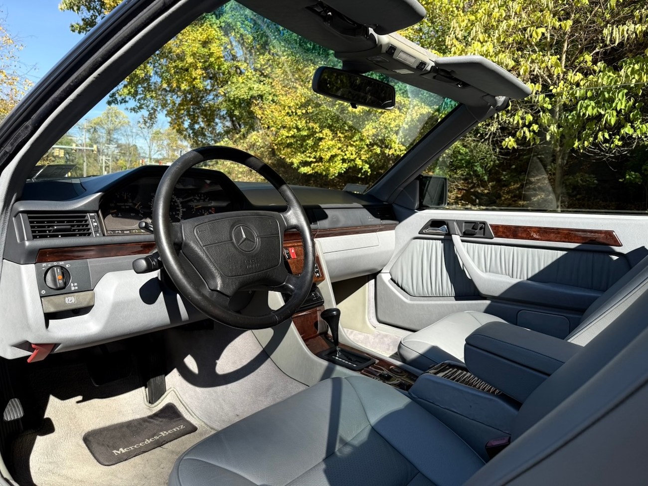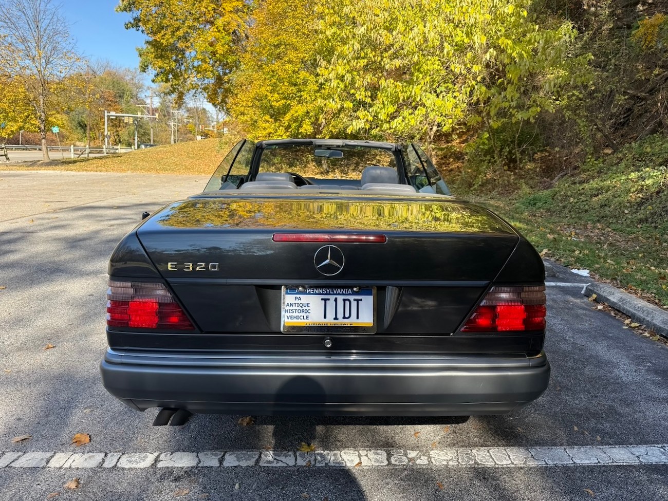 This 1995 Mercedes-Benz E320 Cabriolet was initially sold in Florida and shows subsequent registration in Illinois and Pennsylvania most recently. The current owner purchased the car in early 2025 and the odometer shows an original 75k miles. Finished in Black Pearl Metallic (199) over Gray Leather (268), power is provided by a 3.2-liter inline-six paired with a four-speed automatic transmission driving the rear wheels. Equipment includes heated and power-adjustable front seats with memory, a power-operated black soft top, power mirrors, cruise control, a driver and passenger airbag, central locking, and an aftermarket head unit. The included Carfax report shows 18 service records and no accident damage. Big service items are a new valve cover gasket, oil pressure sending unit, front brake pads and rotors, a new power antenna, a new coolant temp sensor, a new blower motor, and regular maintenance. This cabrio is offered for sale by the current owner in Pennsylvania with one key, factory literature, recent service records, a clean Carfax, and a clean PA title.