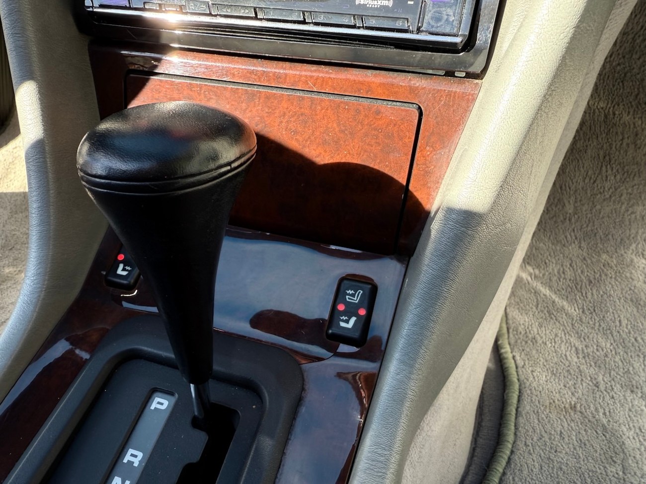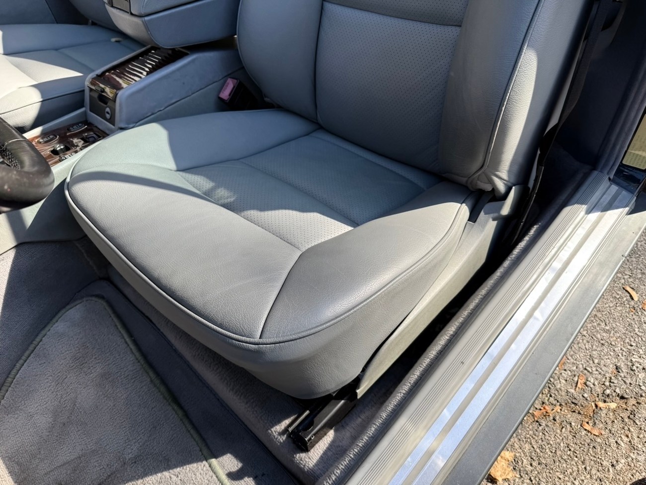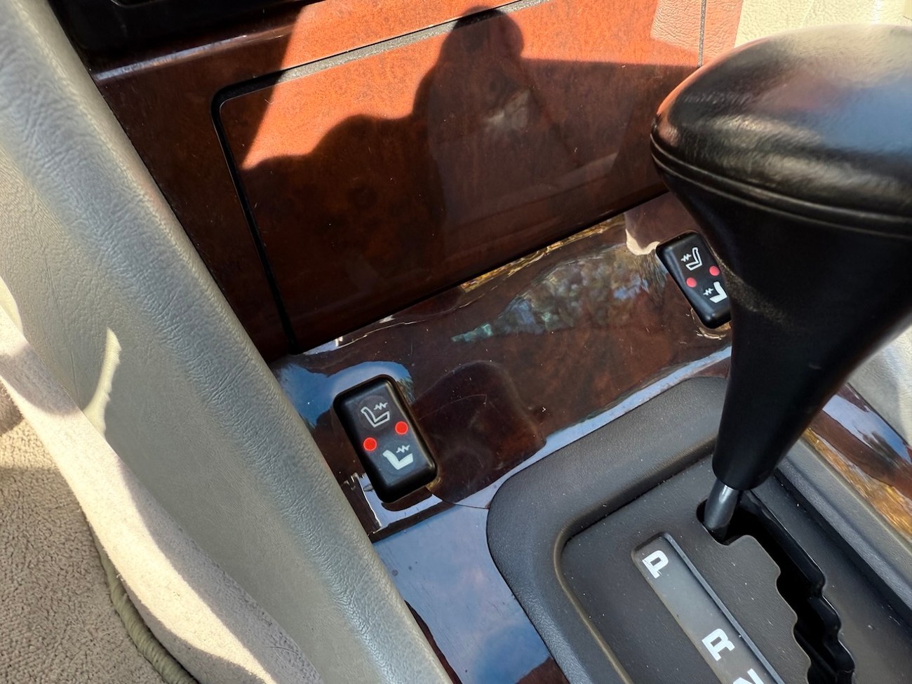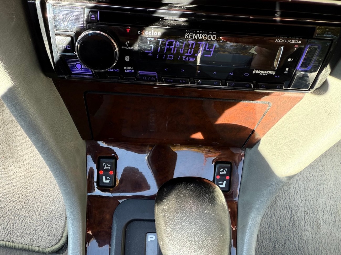 The cabin is upholstered in Gray Leather (268) and features matching carpets and Burl Walnut wood trim which lines the center console, dashboard and door panels. Both front seats are heated and power operated with memory and show some wear. Interior appointments include automatic climate control, functional cruise control, a passenger and driver airbag, automatic seat belt presenters, and an aftermarket head unit.
