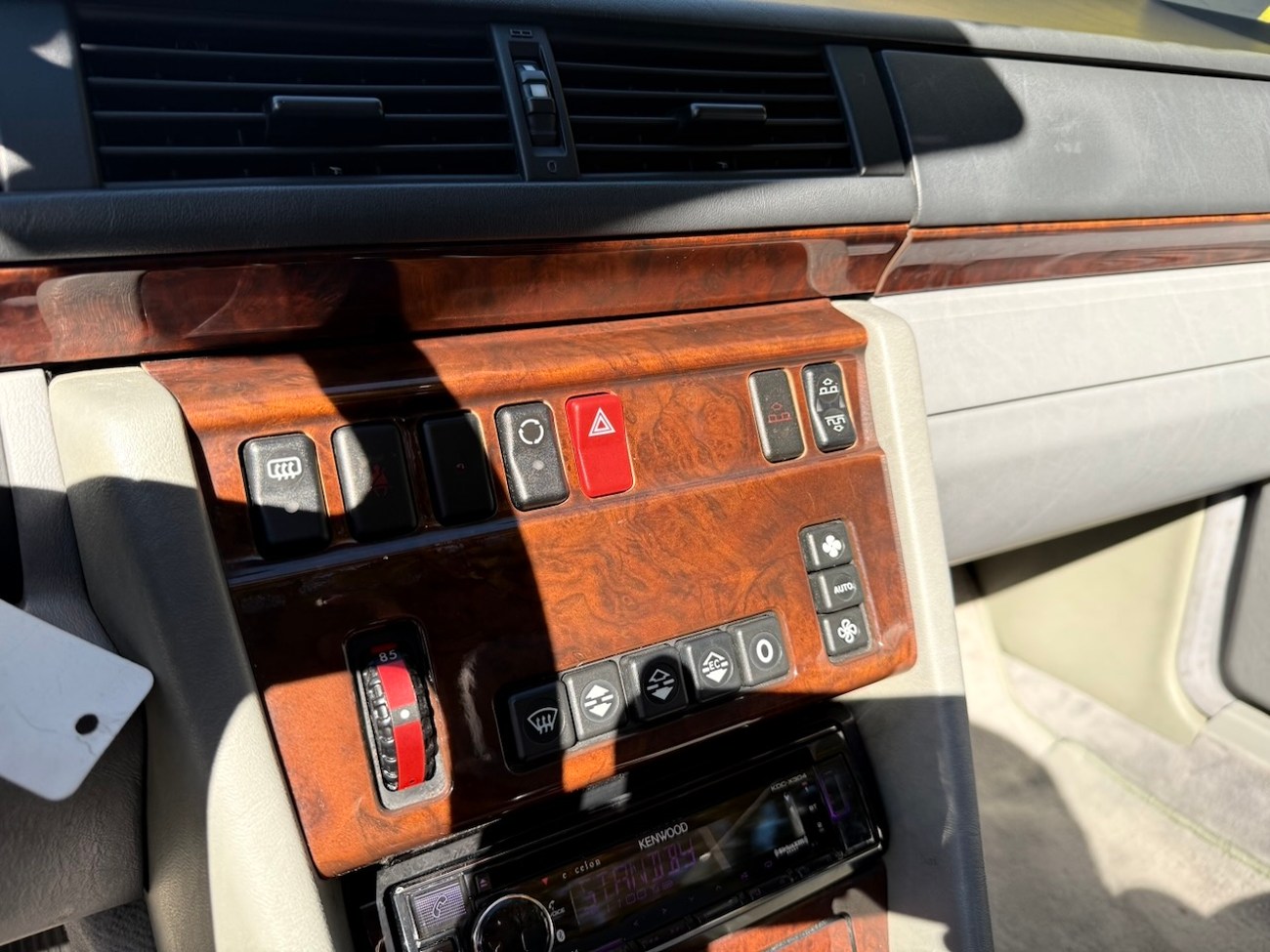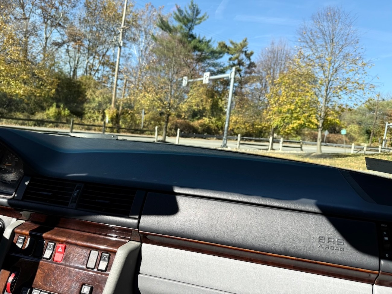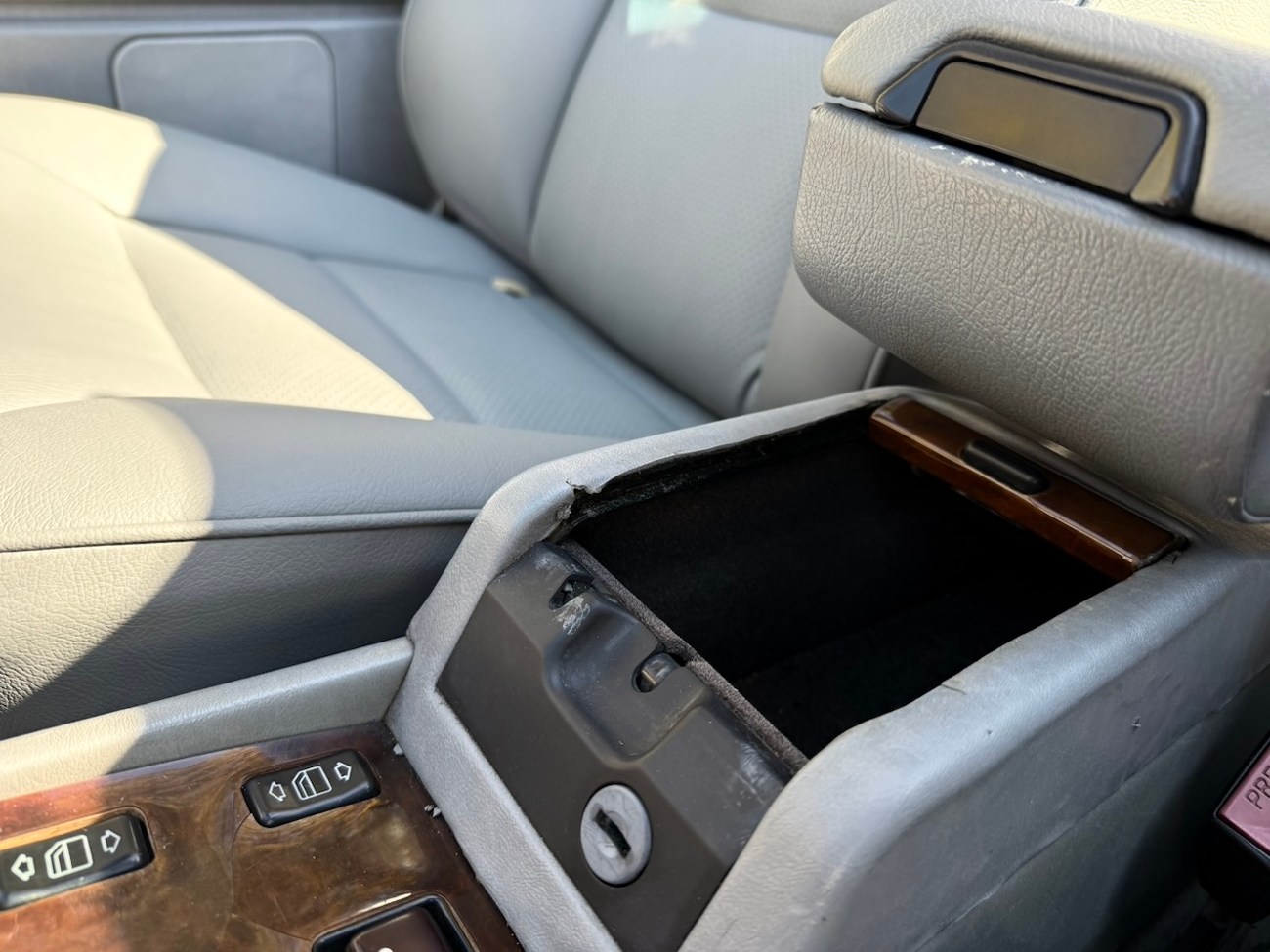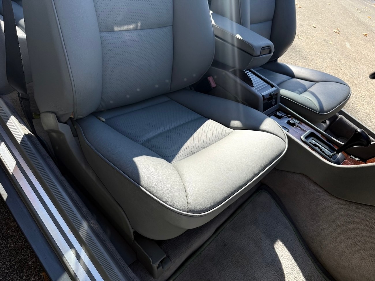 The cabin is upholstered in Gray Leather (268) and features matching carpets and Burl Walnut wood trim which lines the center console, dashboard and door panels. Both front seats are heated and power operated with memory and show some wear. Interior appointments include automatic climate control, functional cruise control, a passenger and driver airbag, automatic seat belt presenters, and an aftermarket head unit.