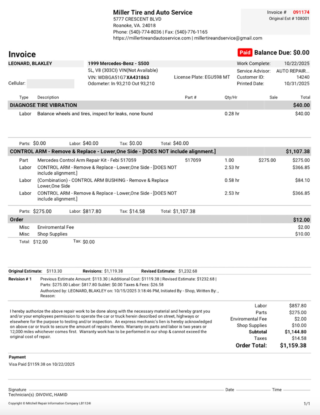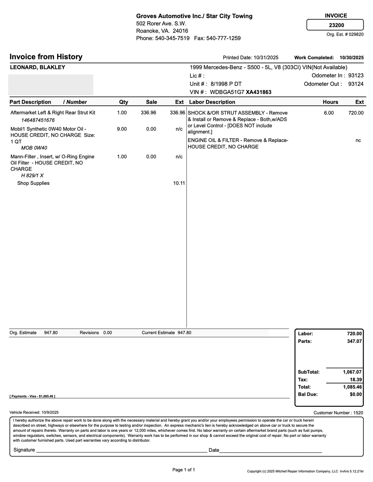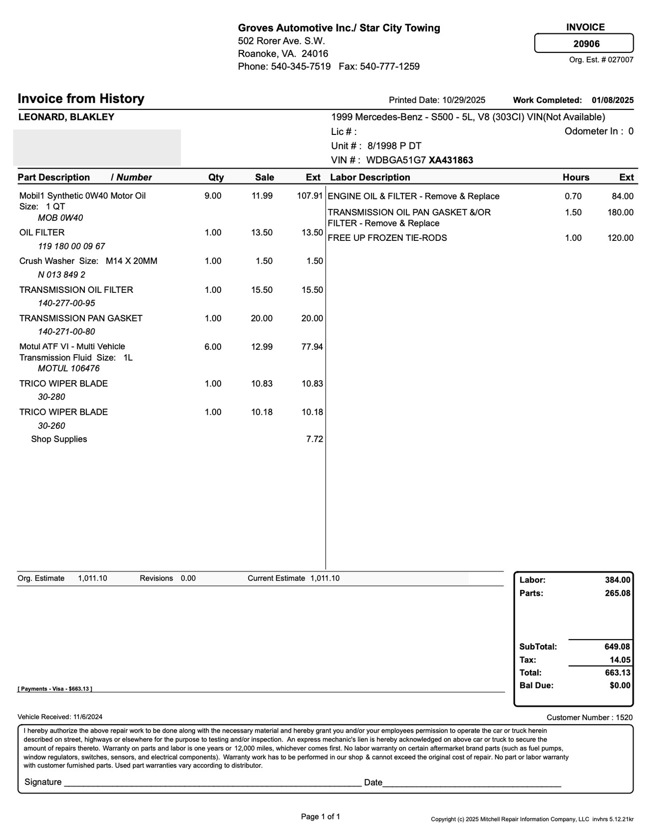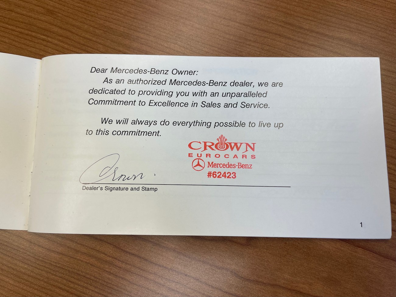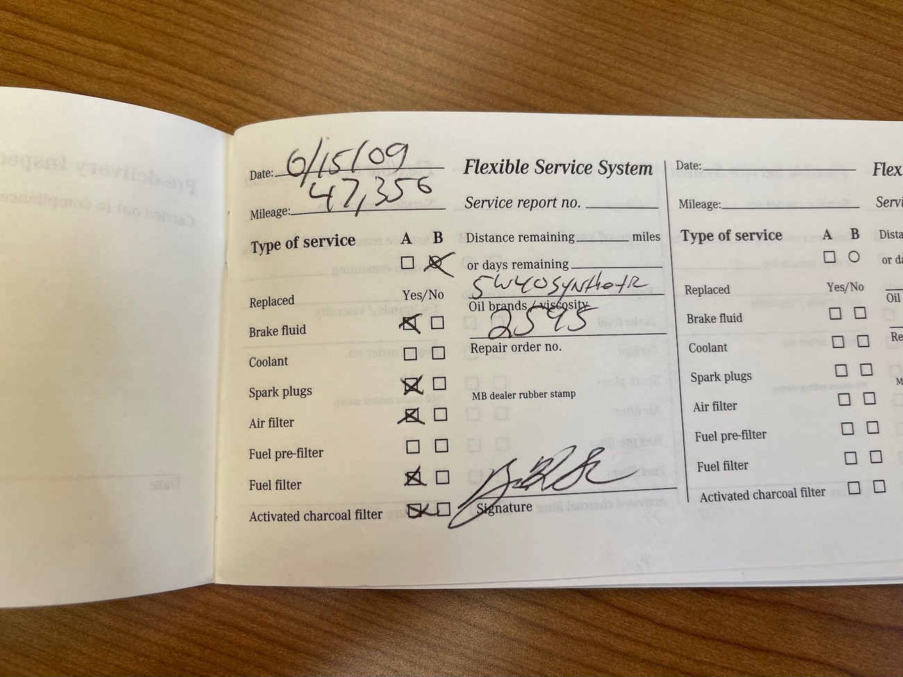 This W140 is powered by a 5.0-liter DOHC M119 V8 which is rated for 315 horsepower and 347 lb-ft of torque. Power is sent to the rear wheels through a five-speed 722.6 automatic transmission. A full service in November 2024 included new front brake pads, front brake rotors, a brake sensor, front sway bar links, and an oil service. In January 2025, a transmission service and fluid flush, along with an oil and filter change was performed. In preparation for the sale, an inspection was performed which resulted new front lower control arms, bushings, new rear shocks, and a fresh oil & filter change in October 2025. The Carfax report lists 21 service history records with regular oil change intervals and other maintenance. The factory service booklet lists an additional service not noted on the Carfax on June 15, 2009 when the car had 47,356 miles showing where the brake fluid was flushed performed along with new spark plugs, engine air filter, charcoal filter, and fuel filter installed.
