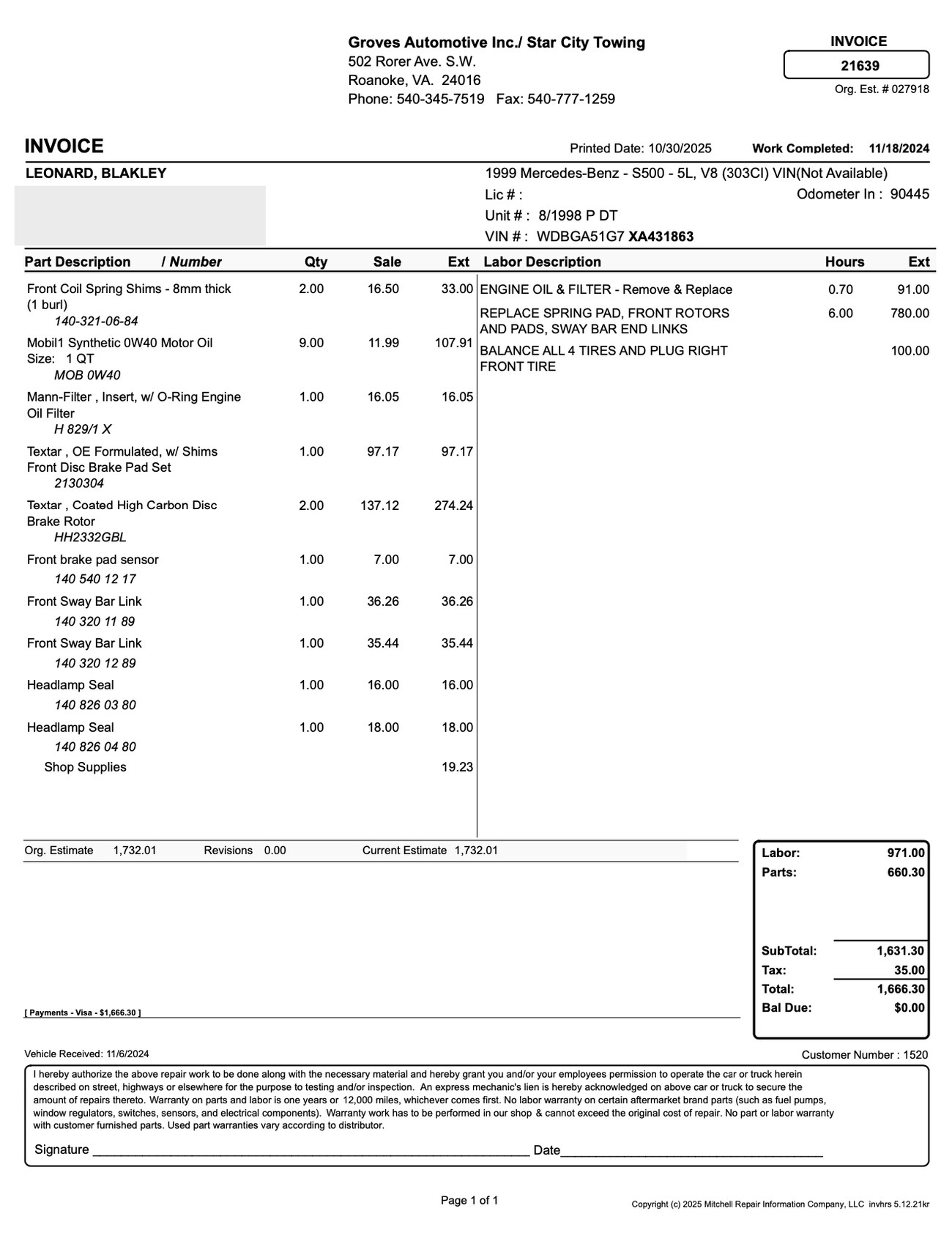 The Carfax report shows registration history in Maryland, Tennessee and Montana. Linear mileage updates are shown with no accidents or damage reports since new on the Carfax. This 1999 S500 is now offered for sale by the current owner in Roanoke, Virginia with partial service records, a clean Carfax report, and a clean Montana title.